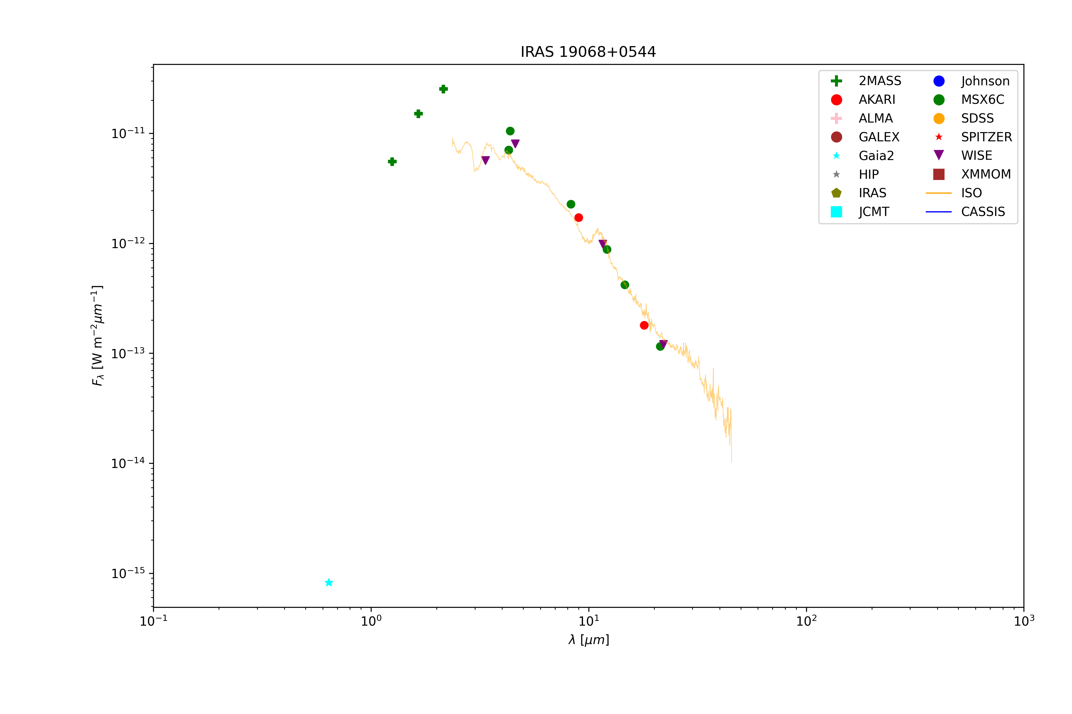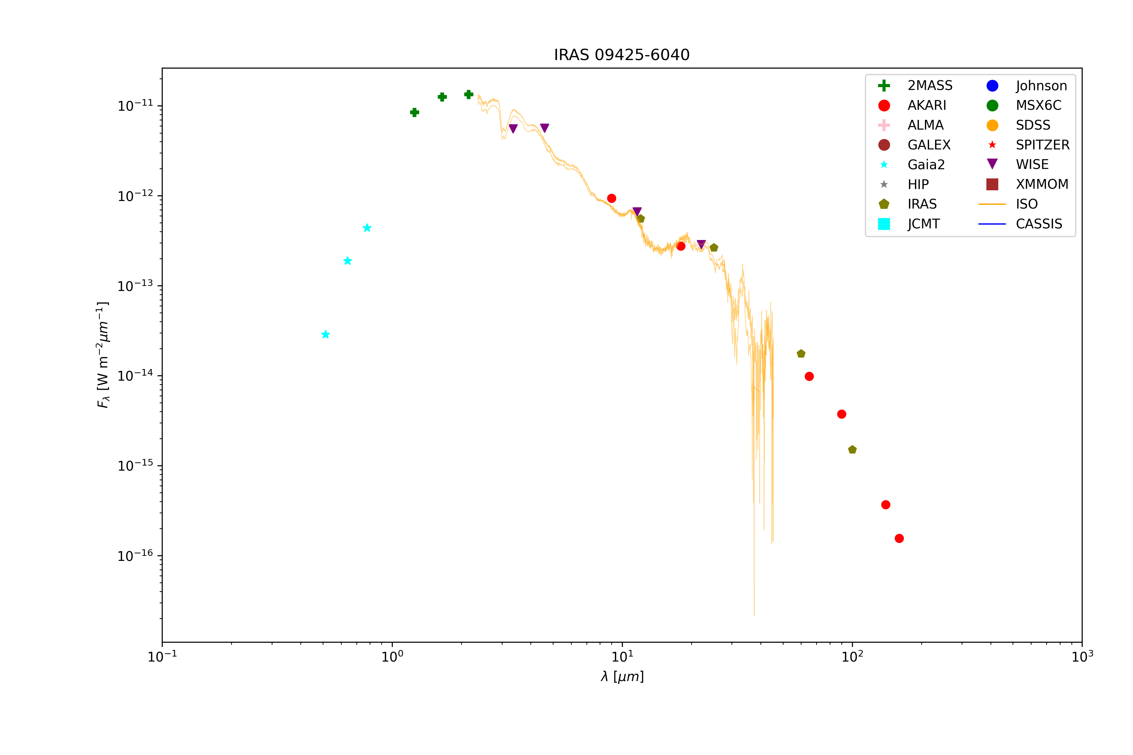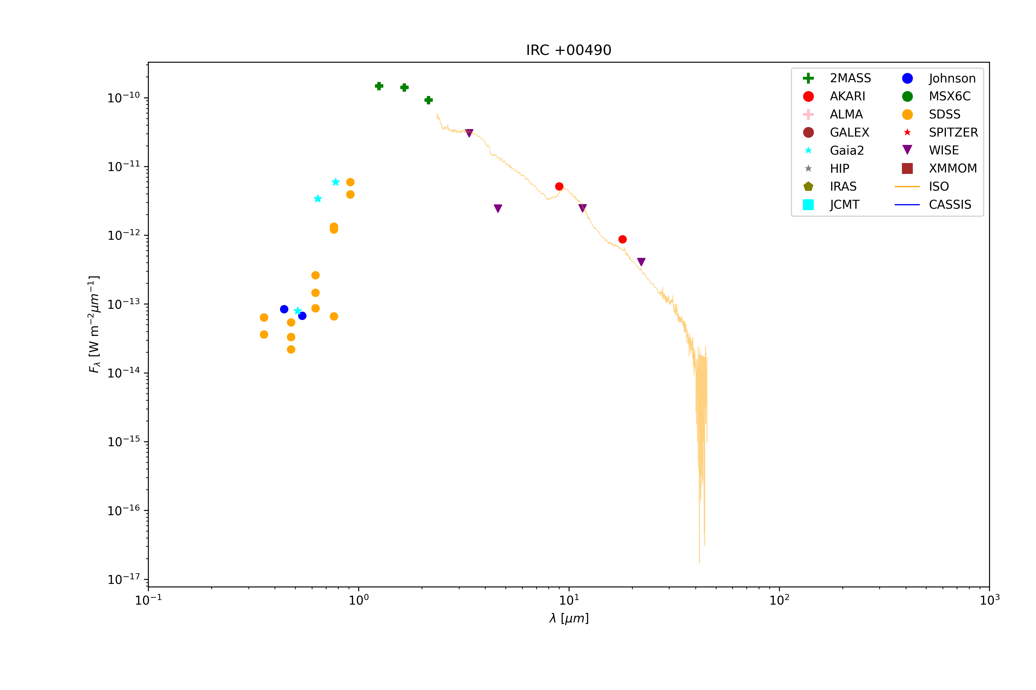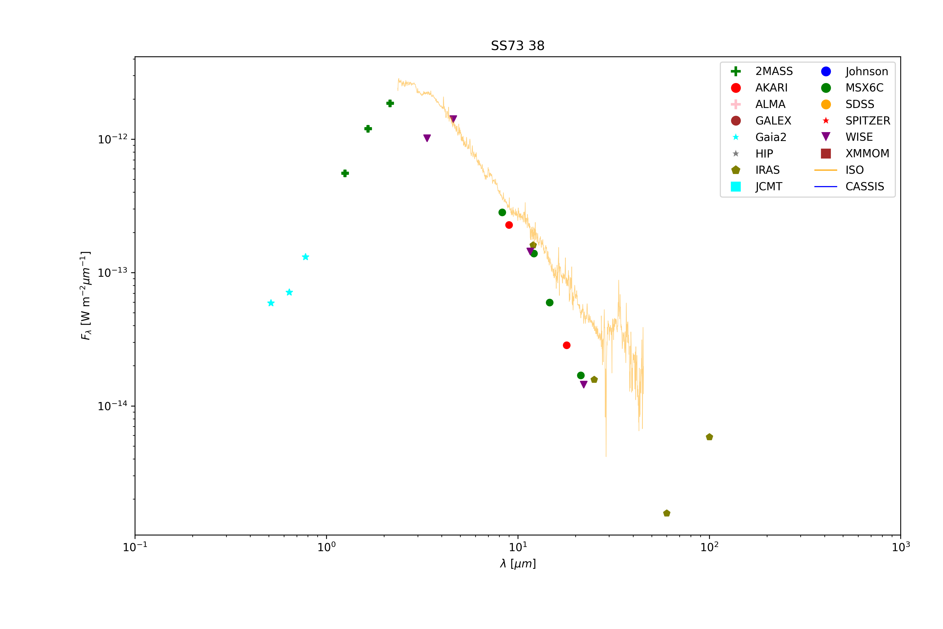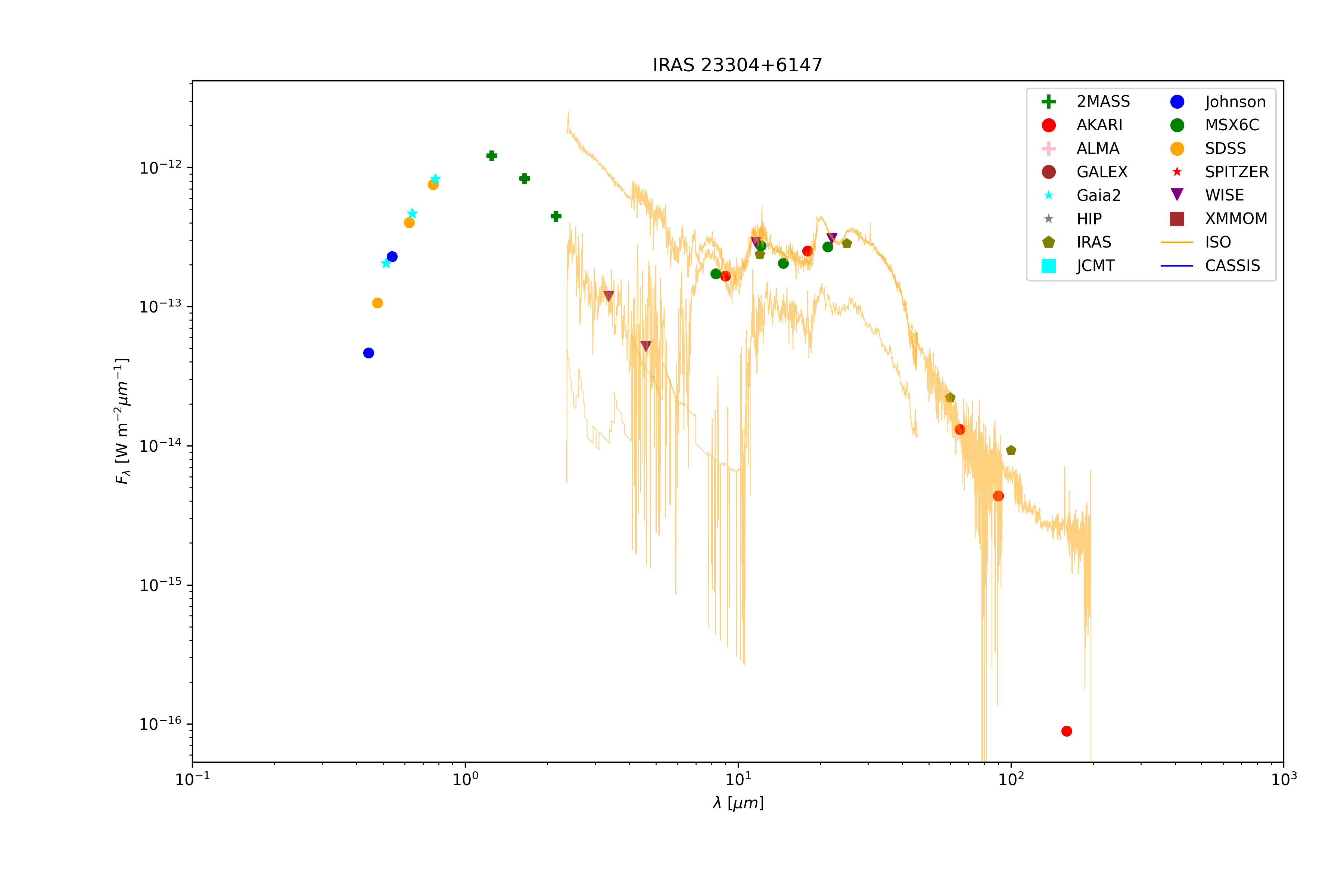 So, for each object, a file with our collected photometry, a file with the SED (corrected and uncorrected for interstellar absorption), a JSON containing all defined and collected data, and an archive with all ISO and Spitzer data and spectra (if available) are available.
