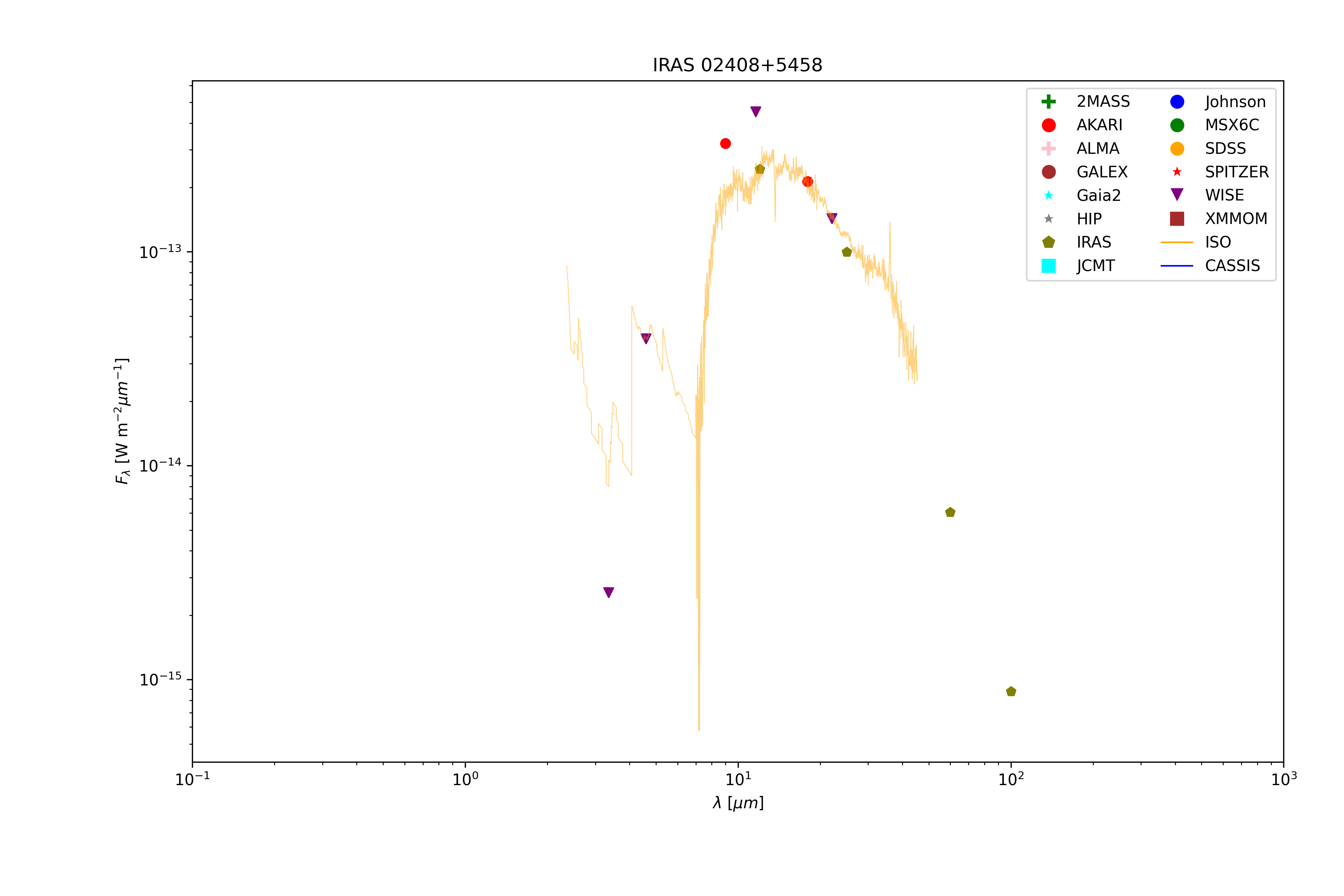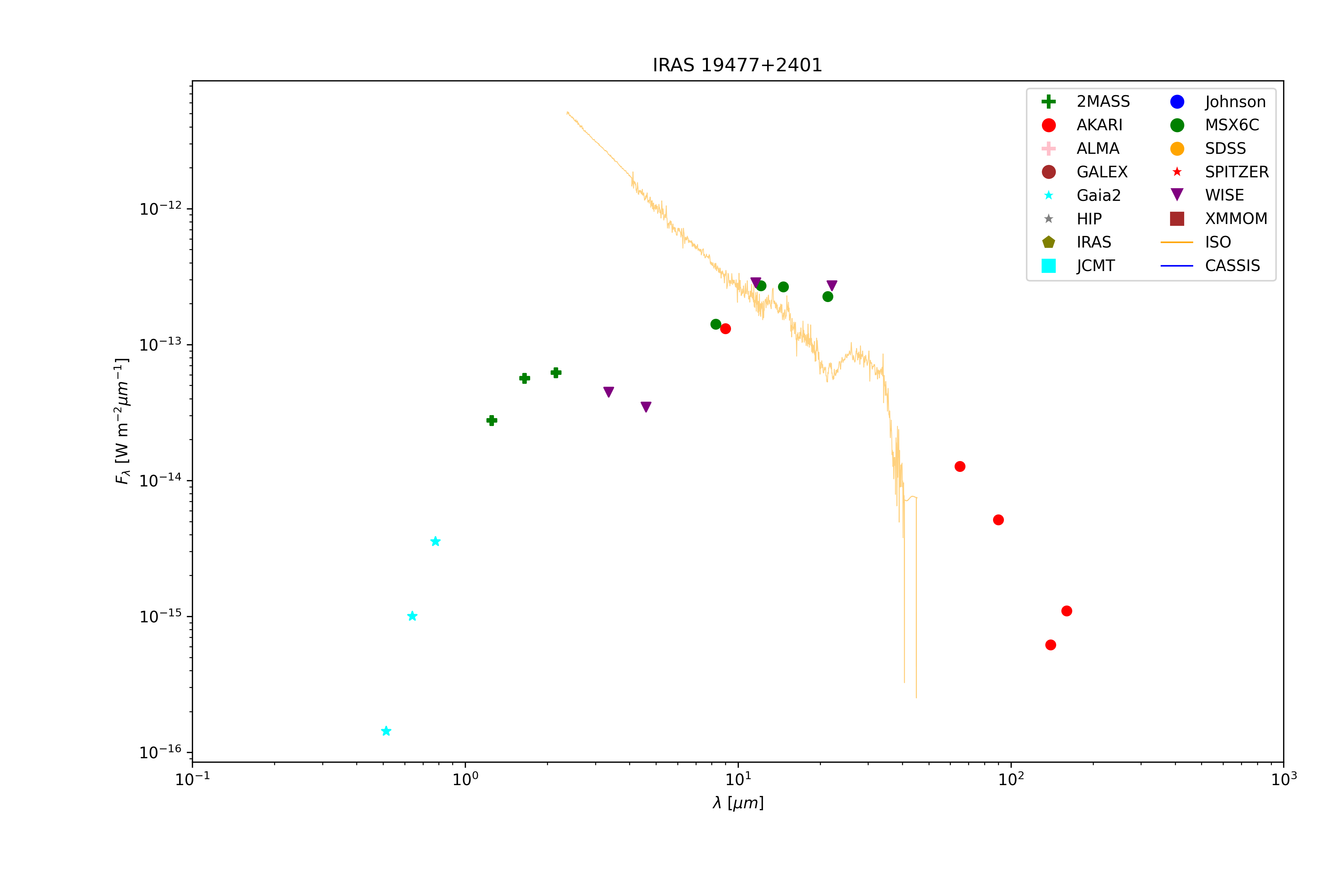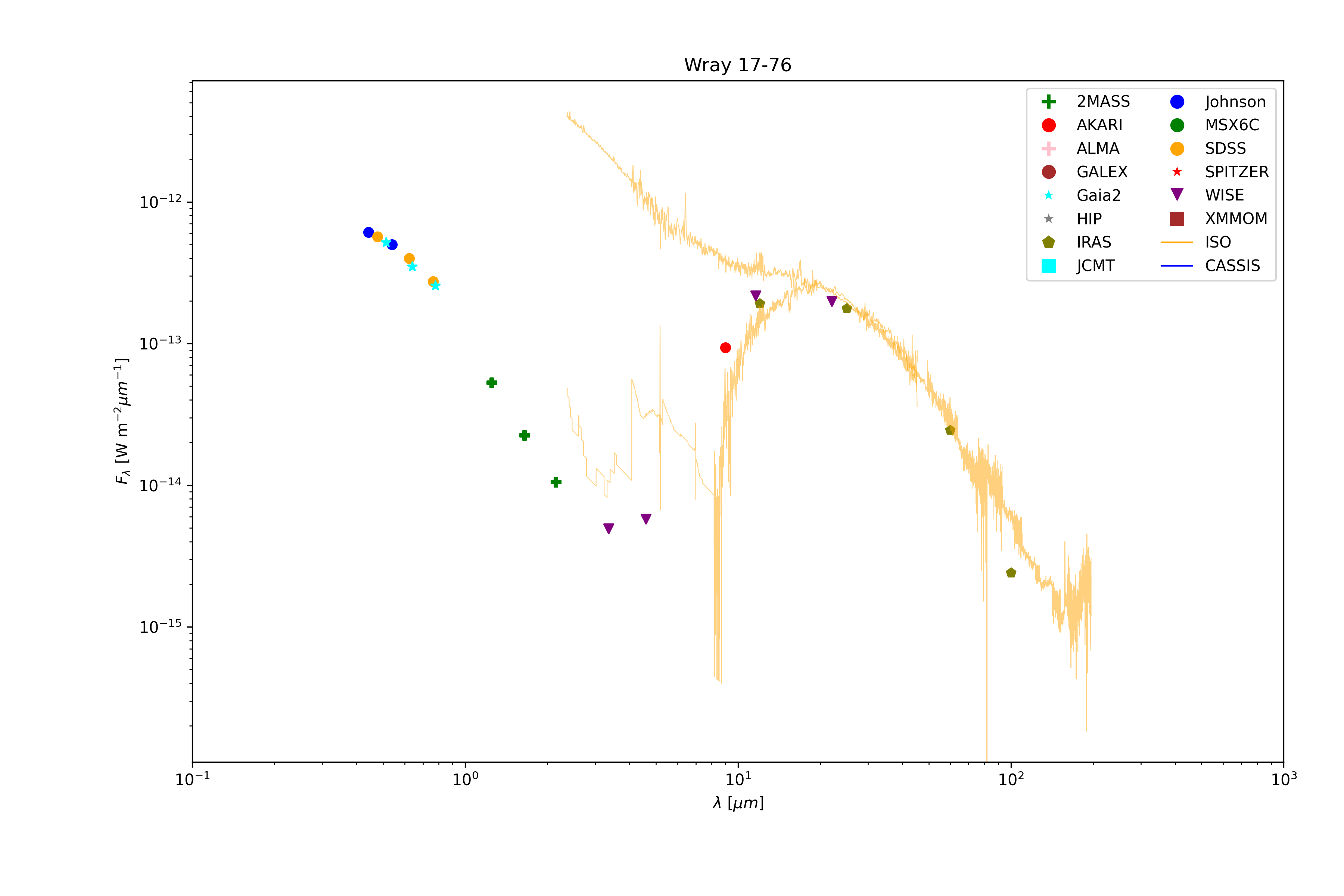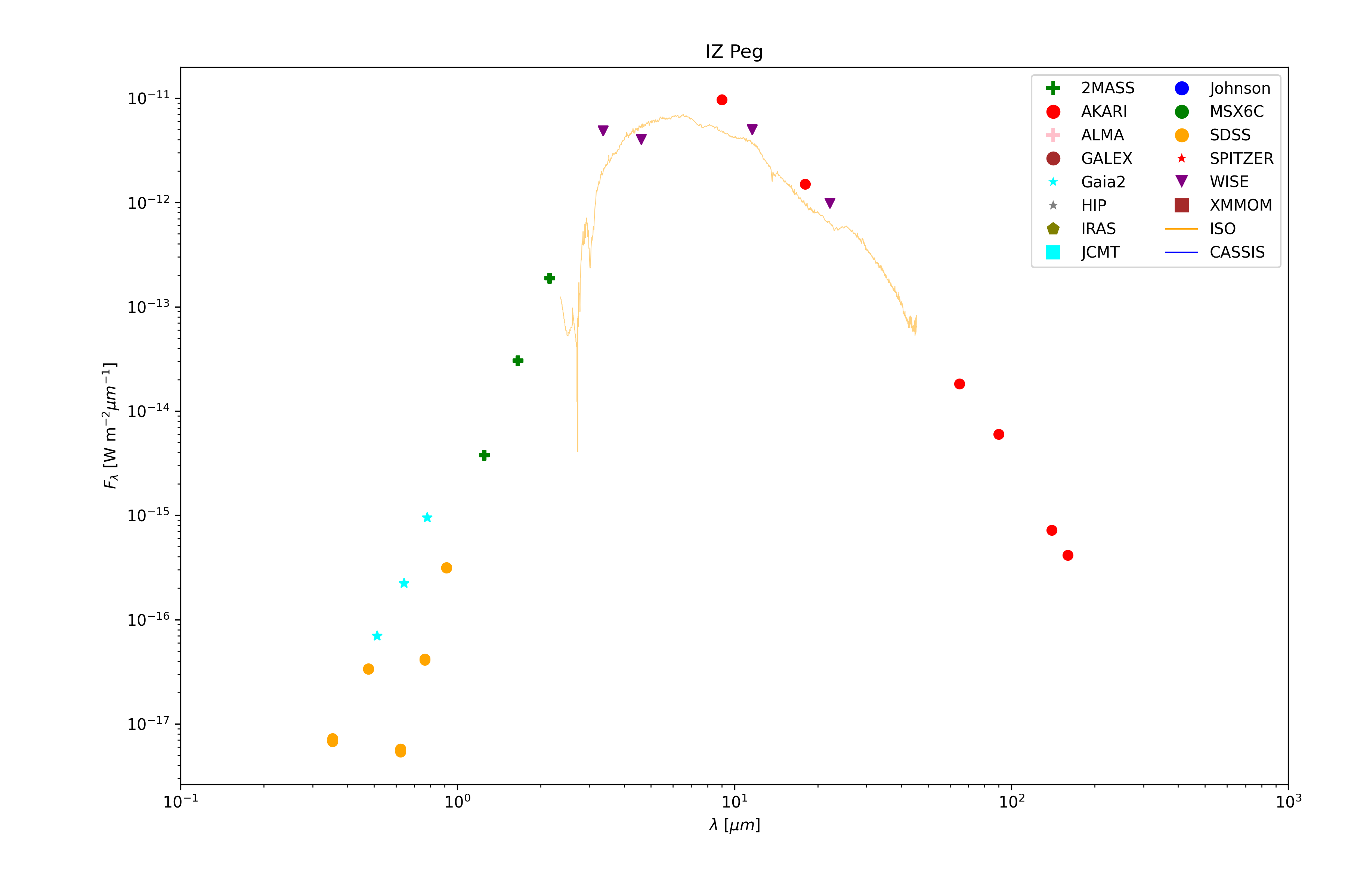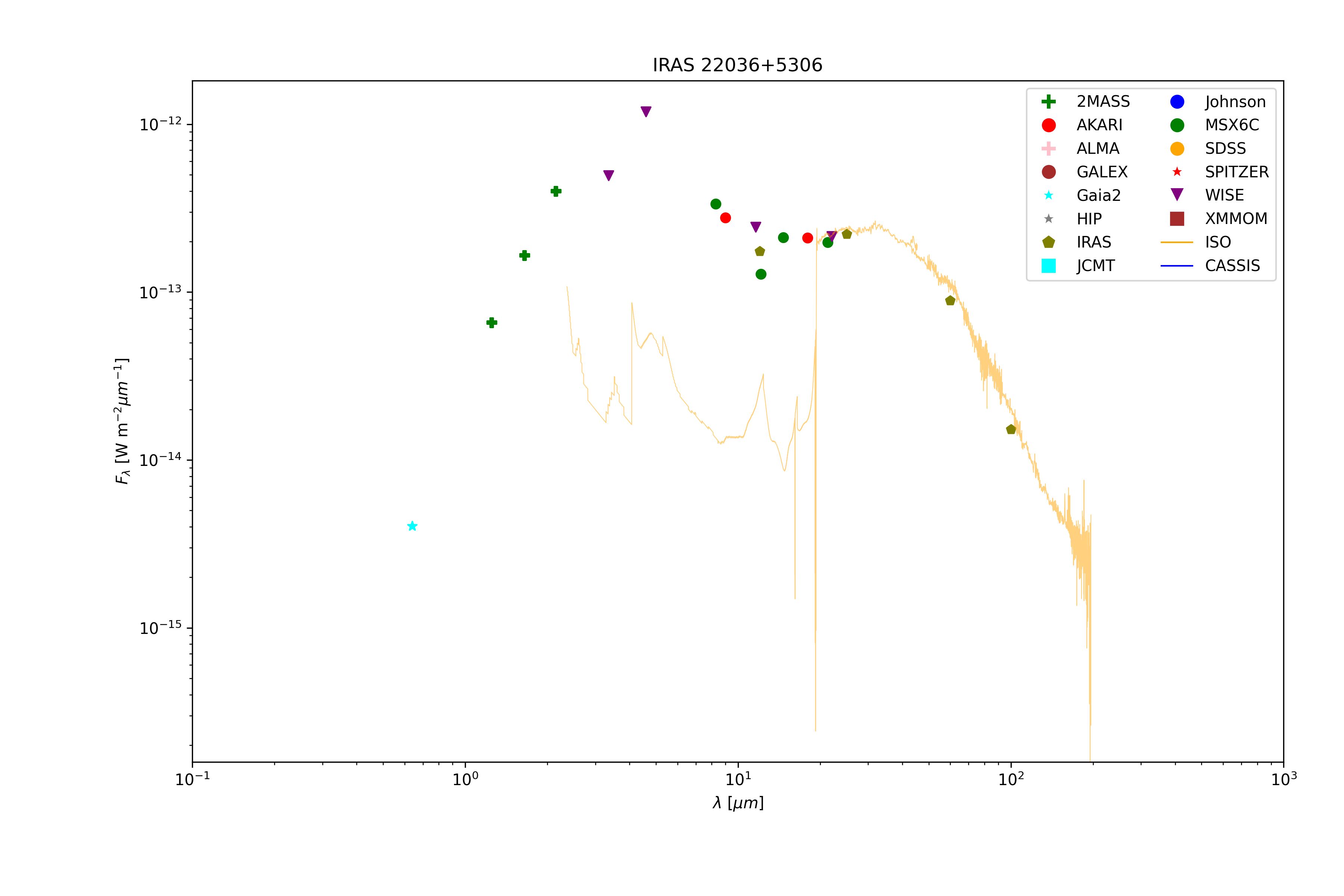 So, for each object, a file with our collected photometry, a file with the SED (corrected and uncorrected for interstellar absorption), a JSON containing all defined and collected data, and an archive with all ISO and Spitzer data and spectra (if available) are available.