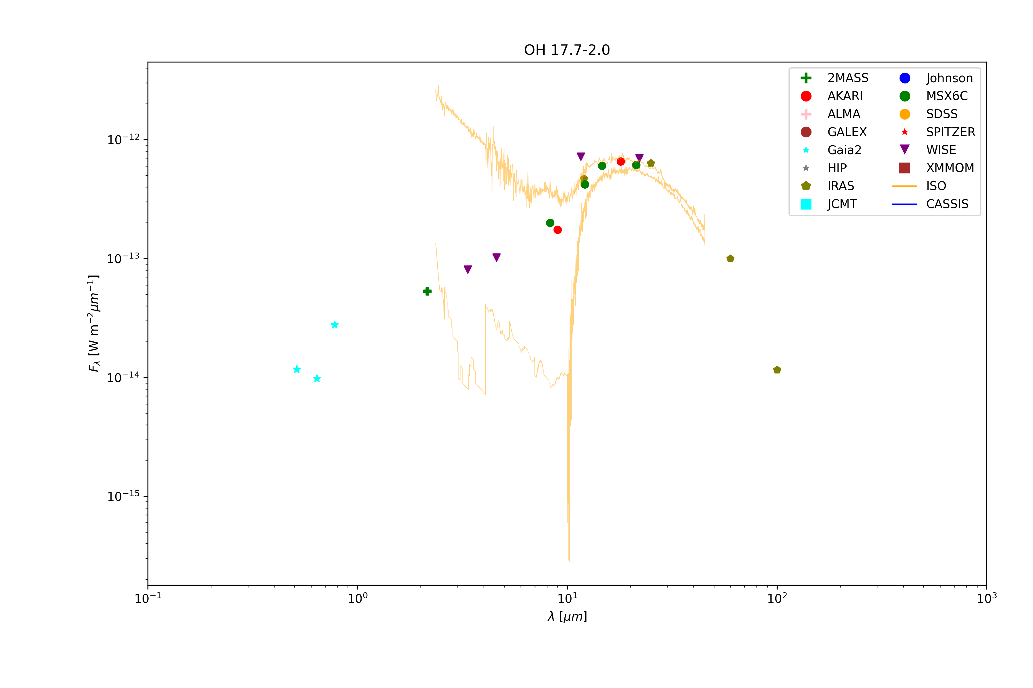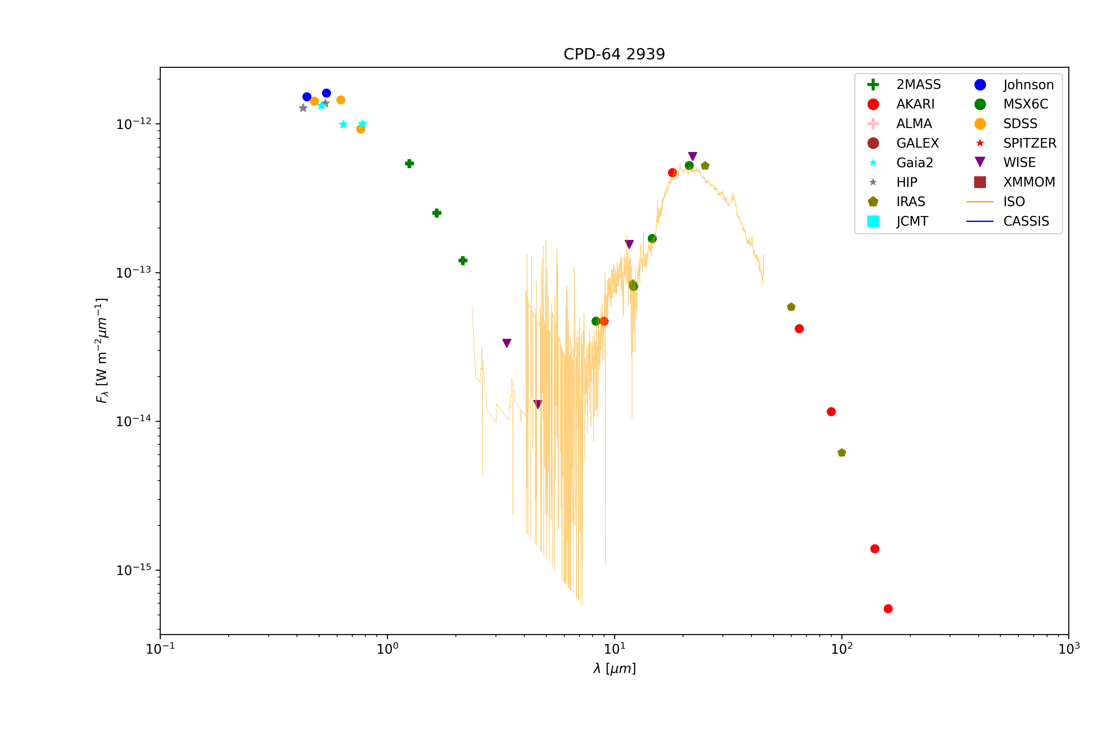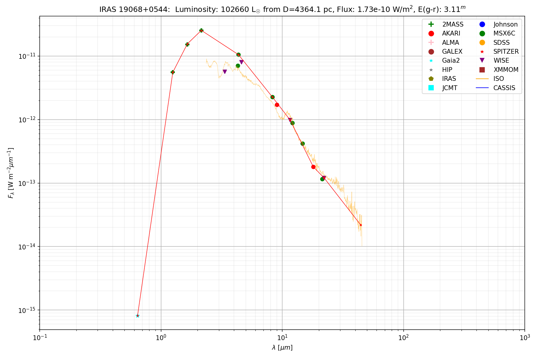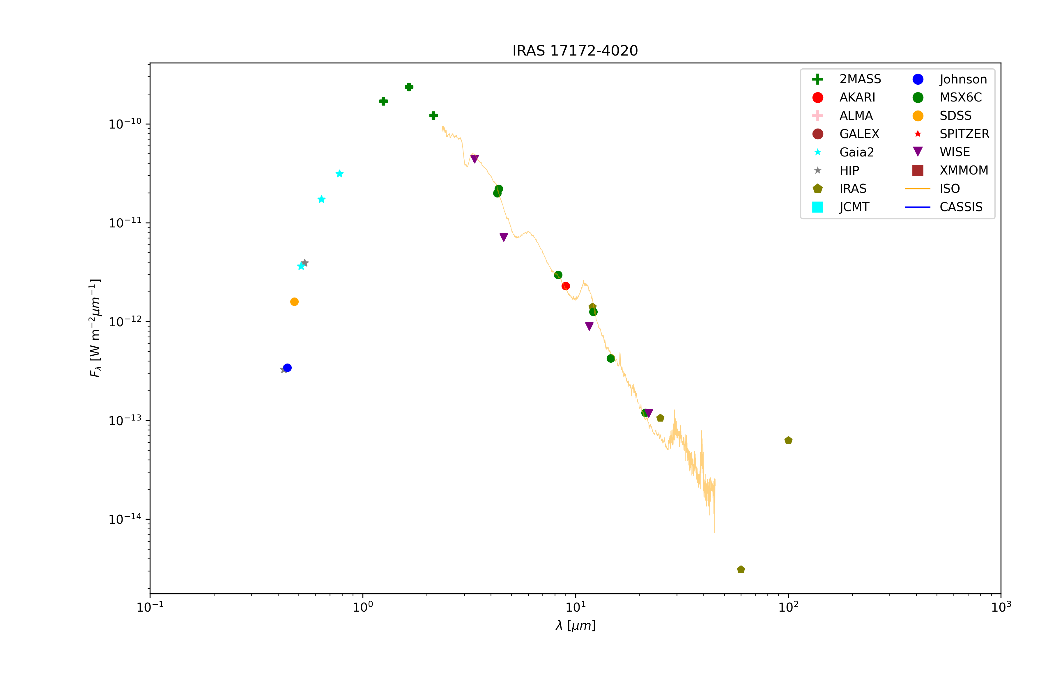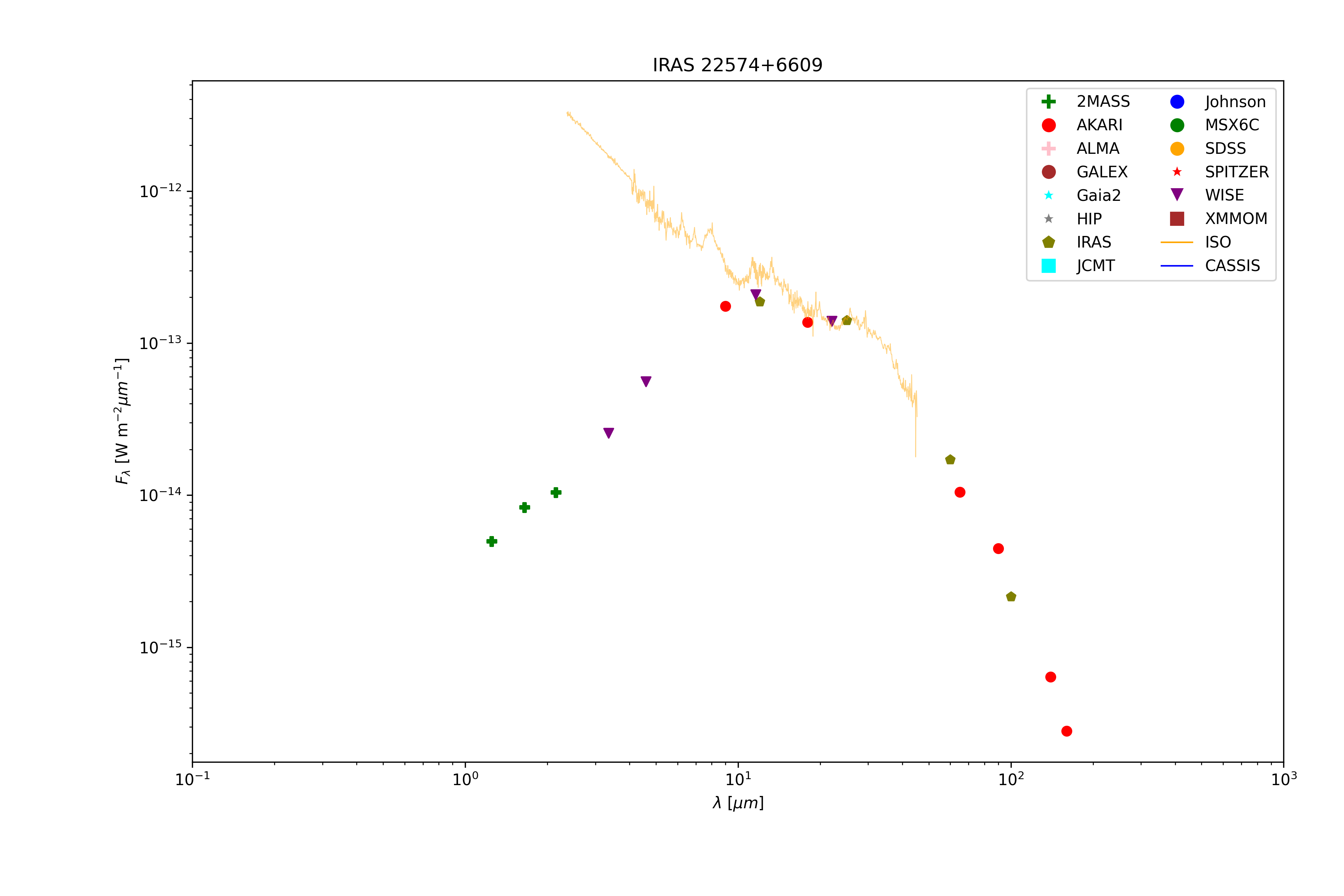 So, for each object, a file with our collected photometry, a file with the SED (corrected and uncorrected for interstellar absorption), a JSON containing all defined and collected data, and an archive with all ISO and Spitzer data and spectra (if available) are available.