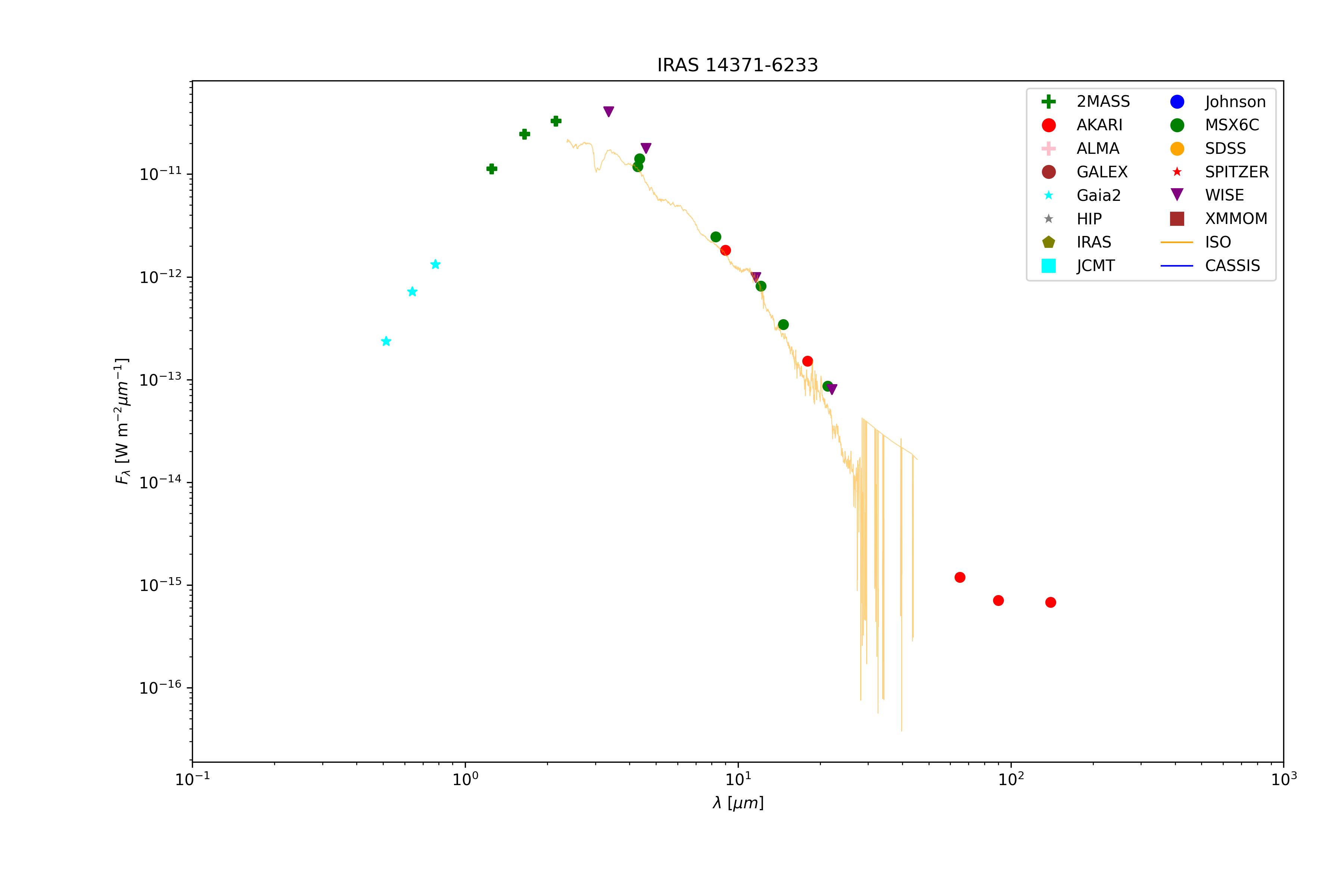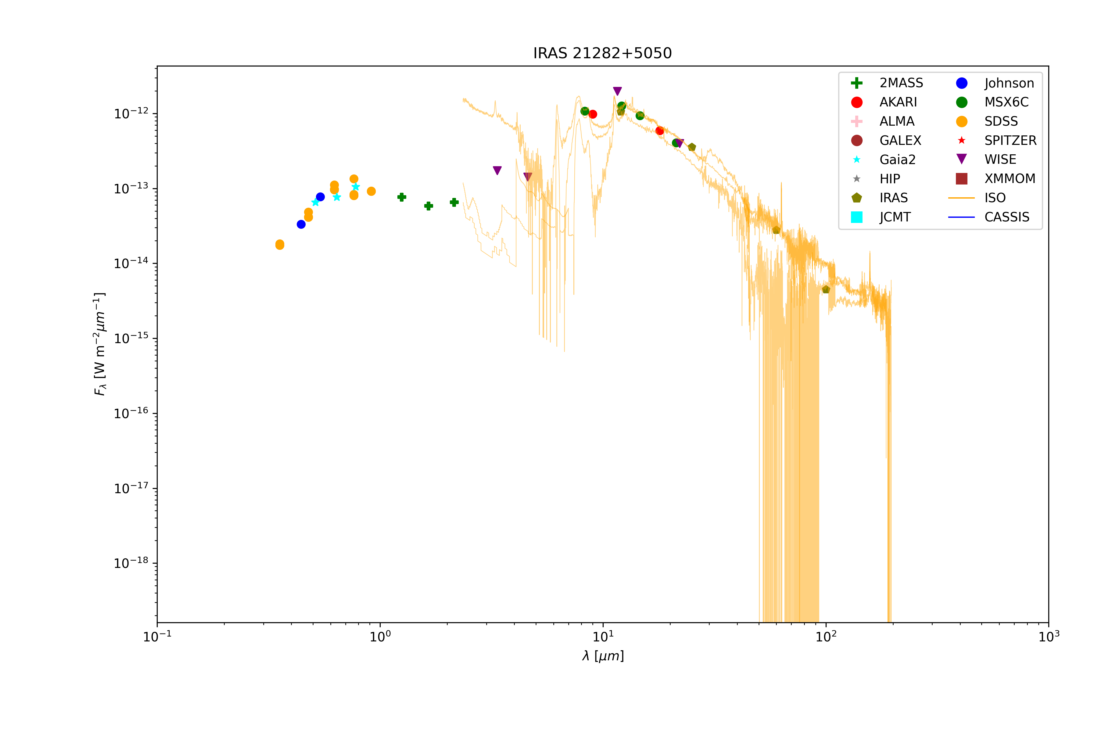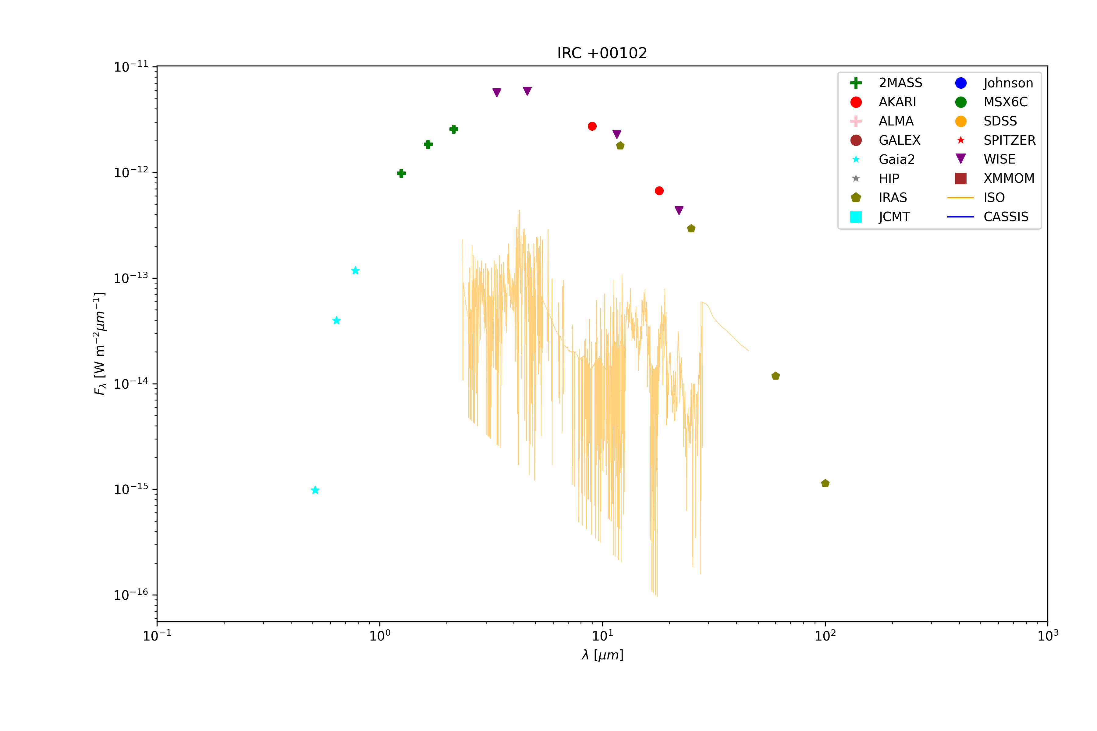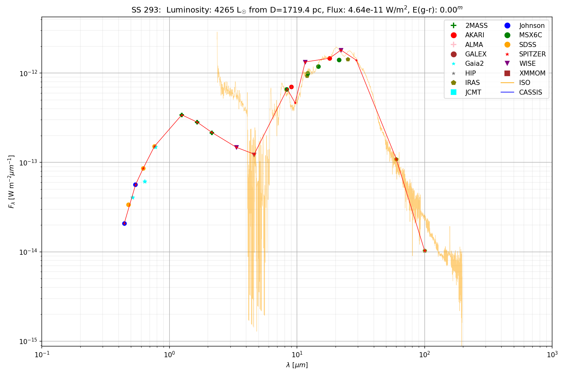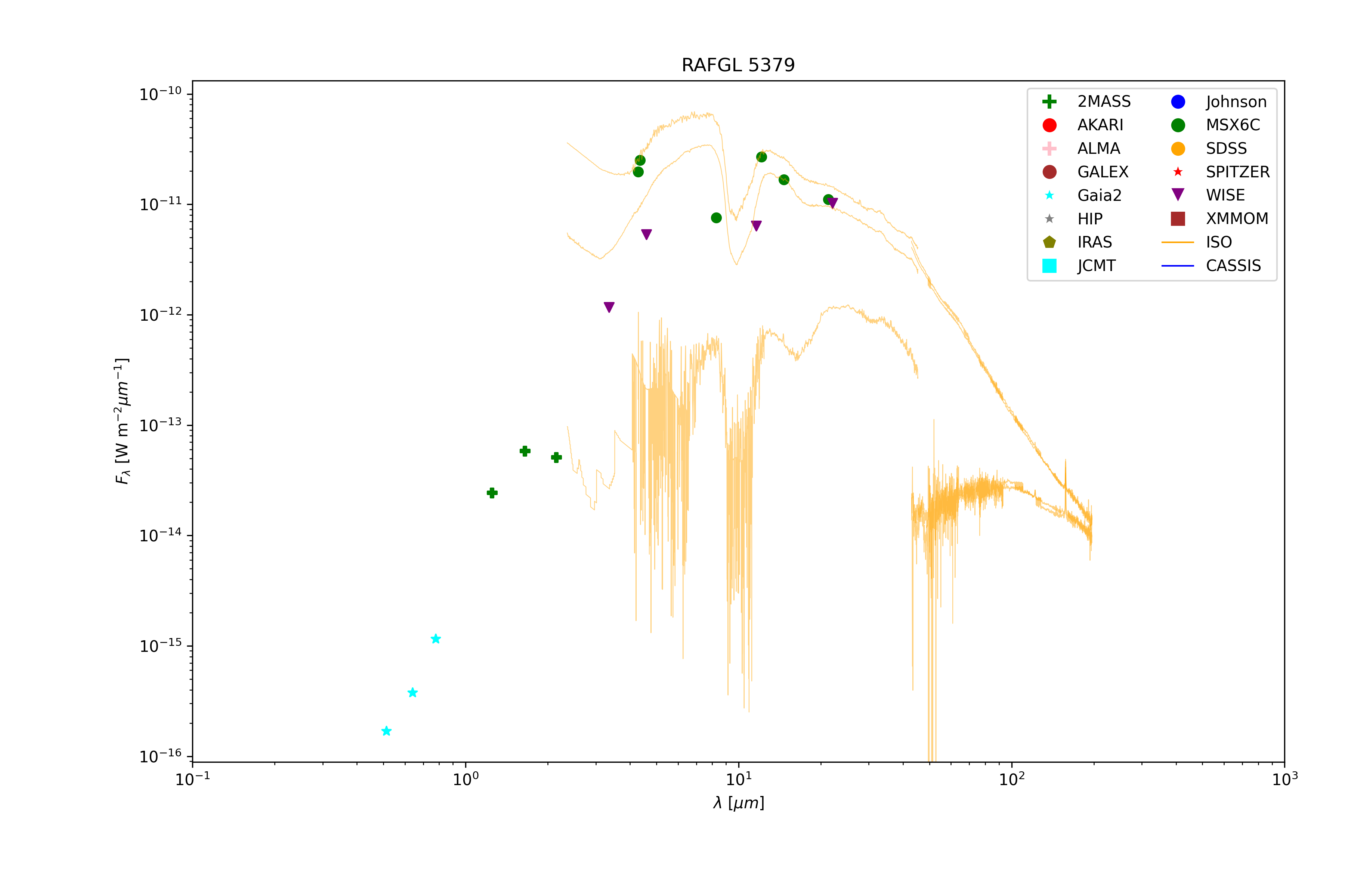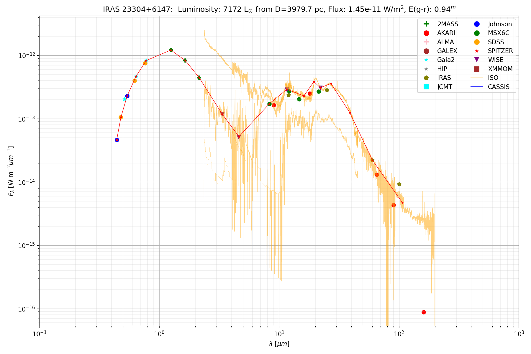 So, for each object, a file with our collected photometry, a file with the SED (corrected and uncorrected for interstellar absorption), a JSON containing all defined and collected data, and an archive with all ISO and Spitzer data and spectra (if available) are available.