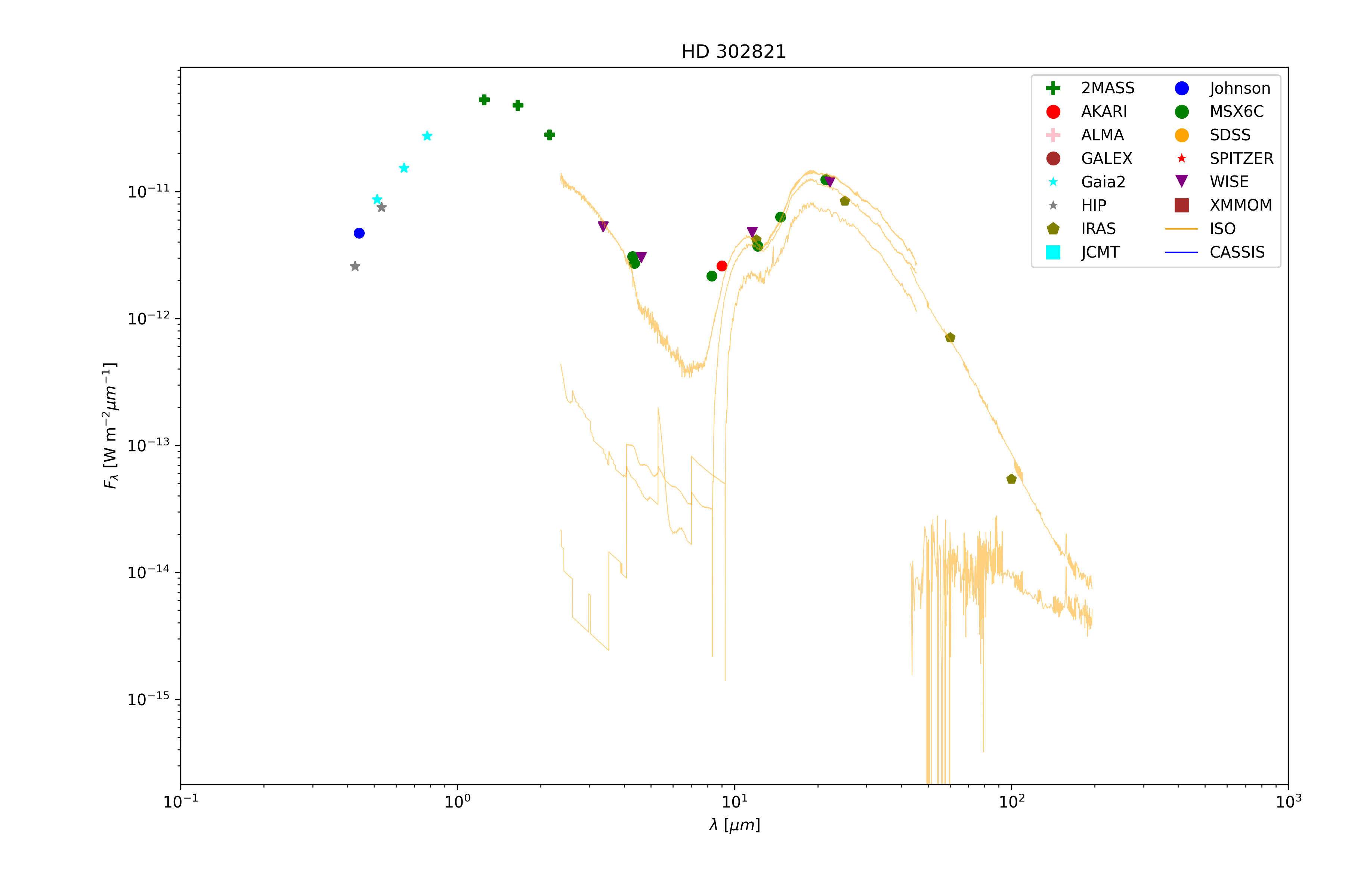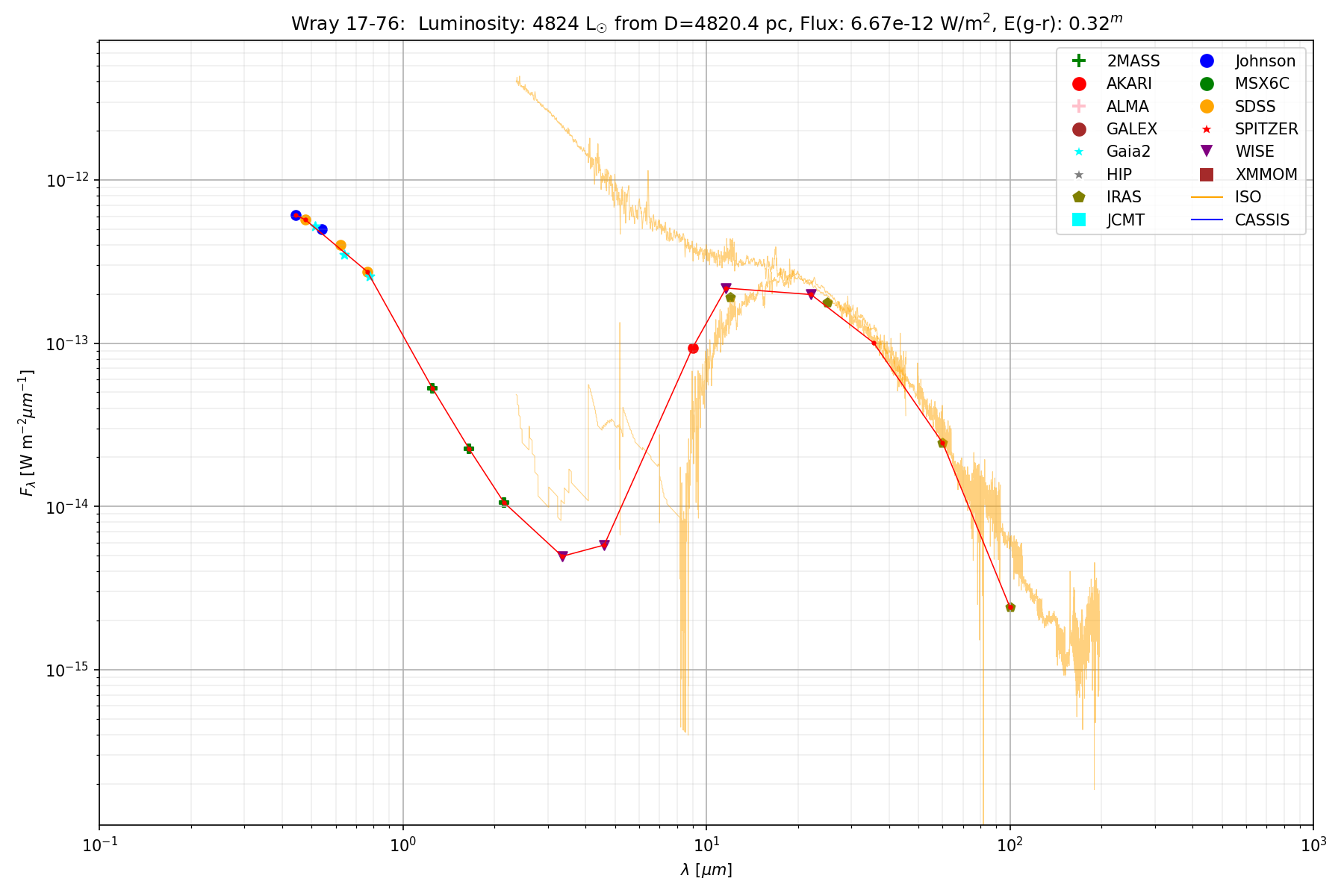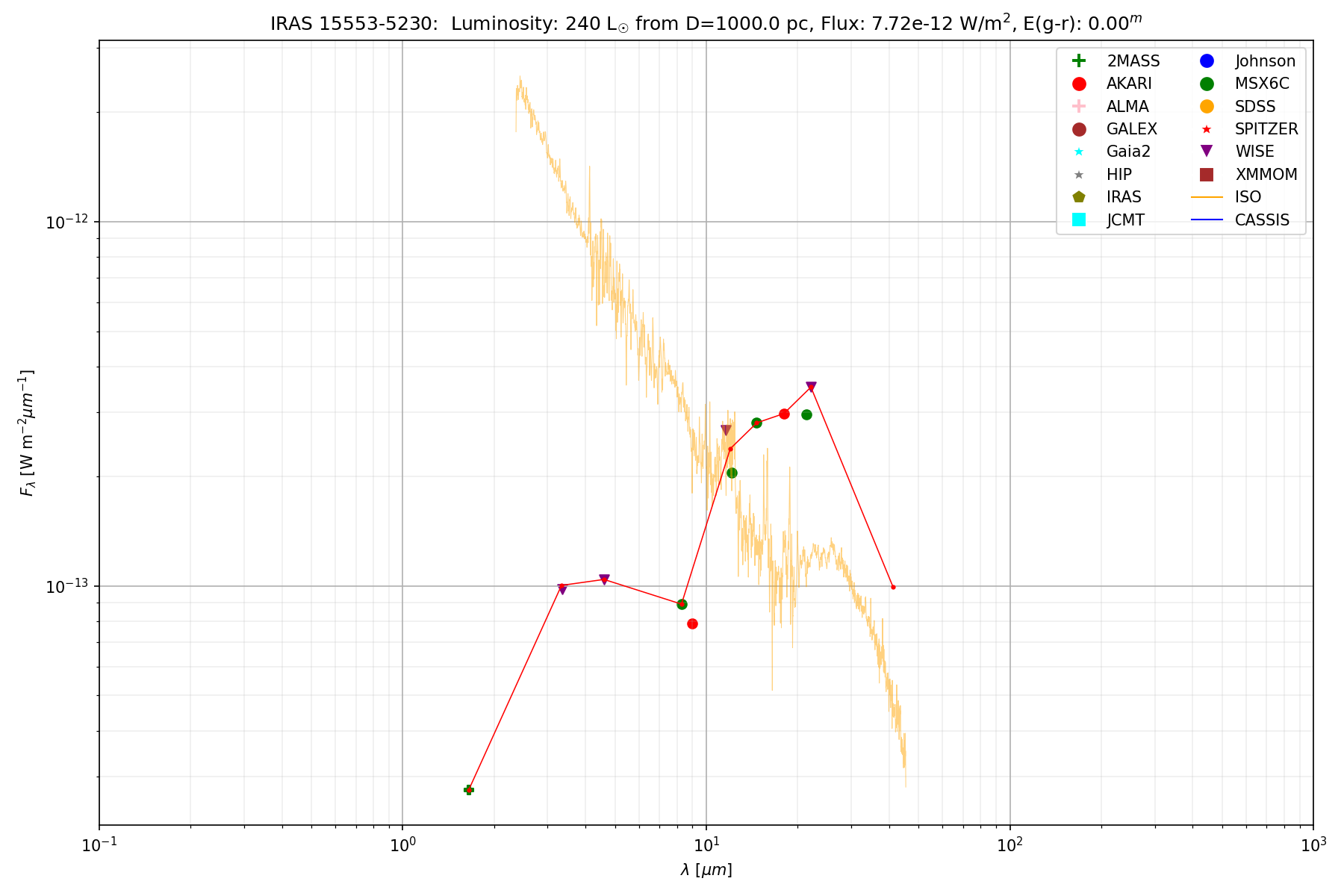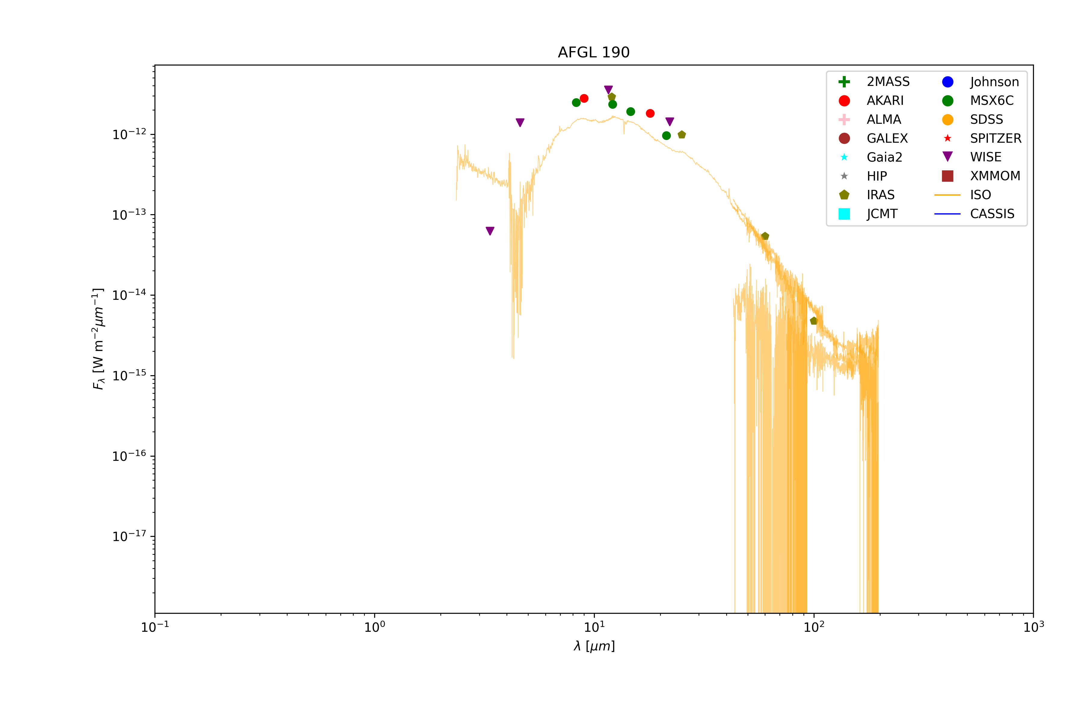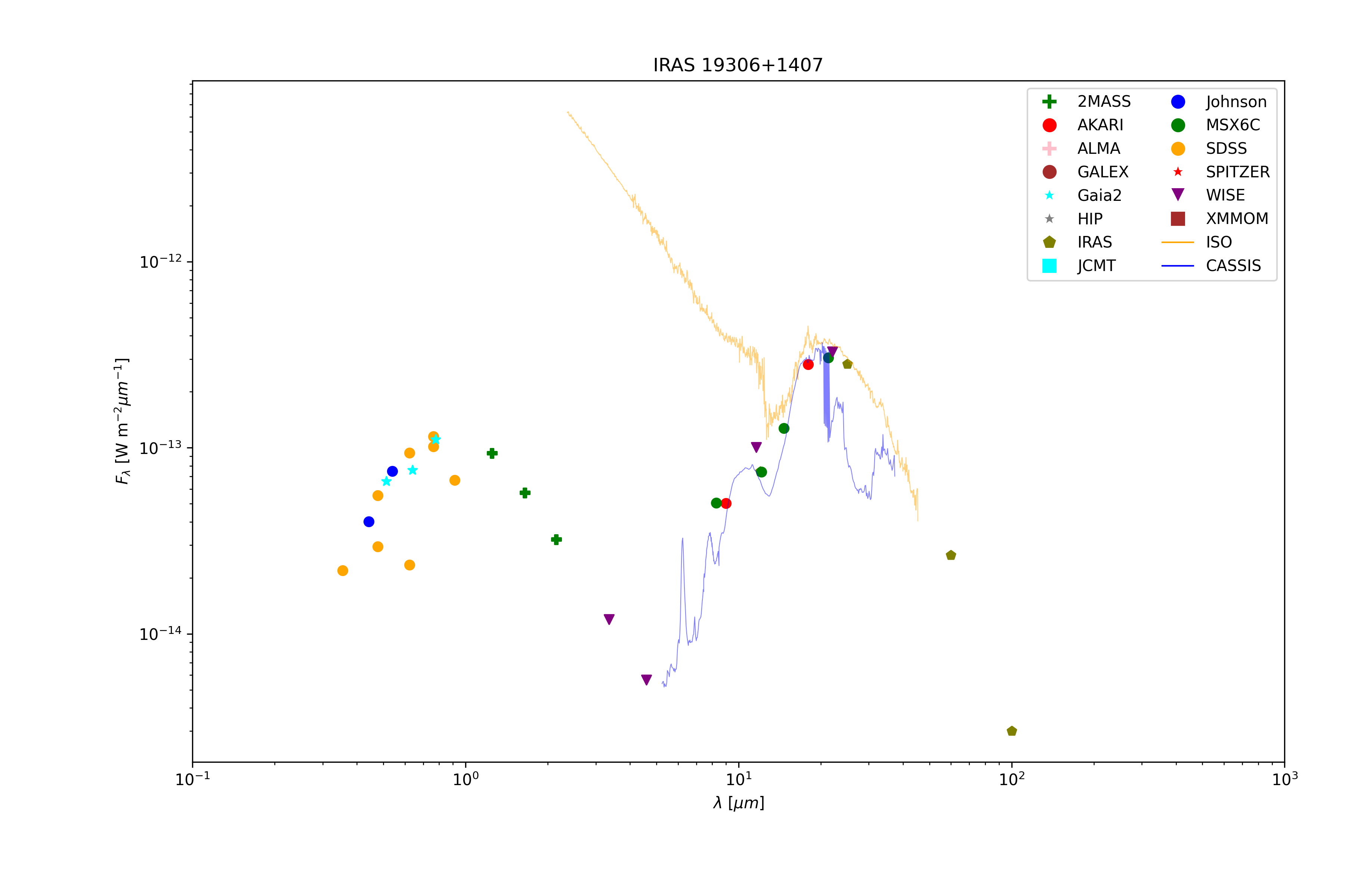 So, for each object, a file with our collected photometry, a file with the SED (corrected and uncorrected for interstellar absorption), a JSON containing all defined and collected data, and an archive with all ISO and Spitzer data and spectra (if available) are available.