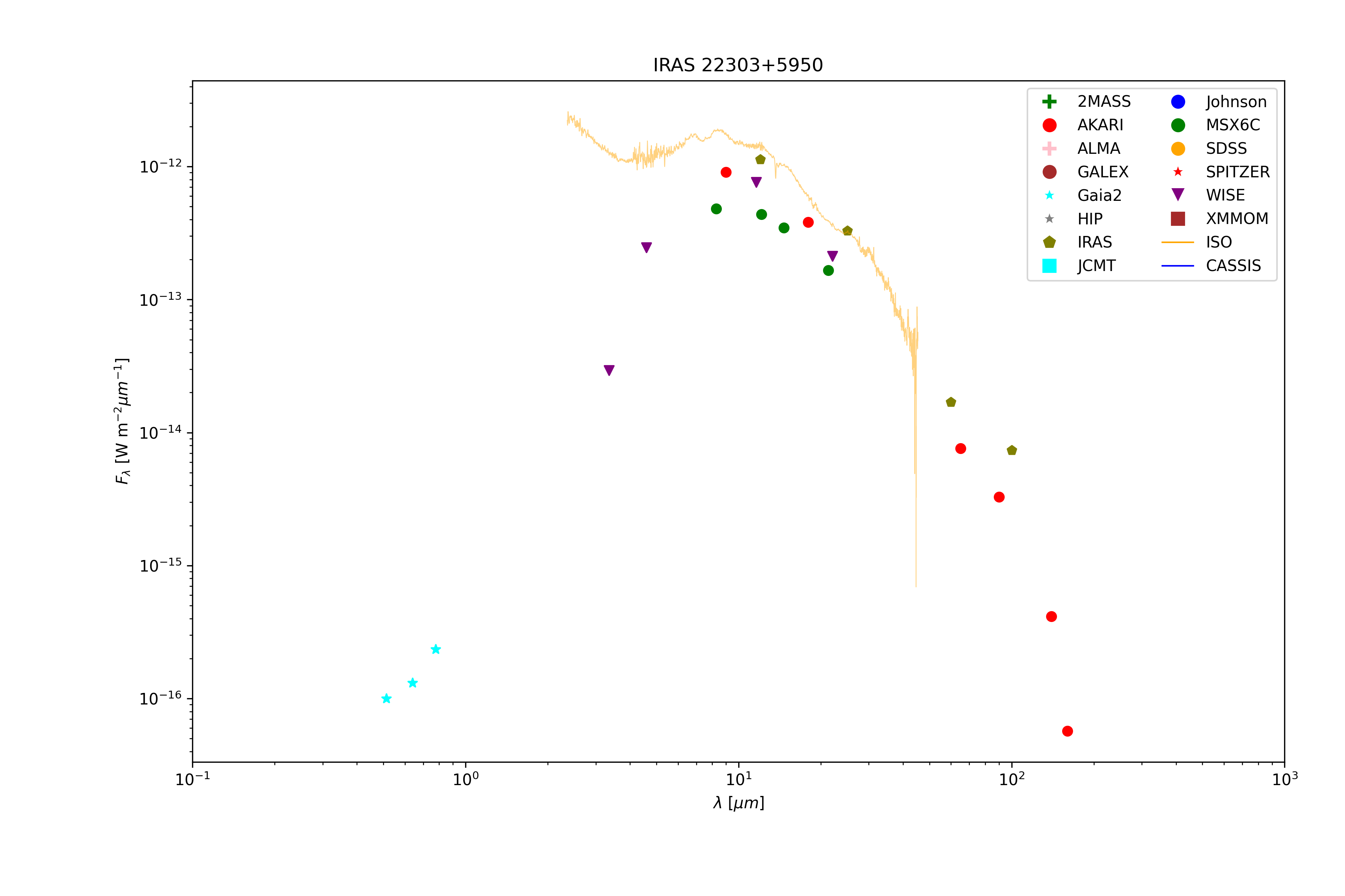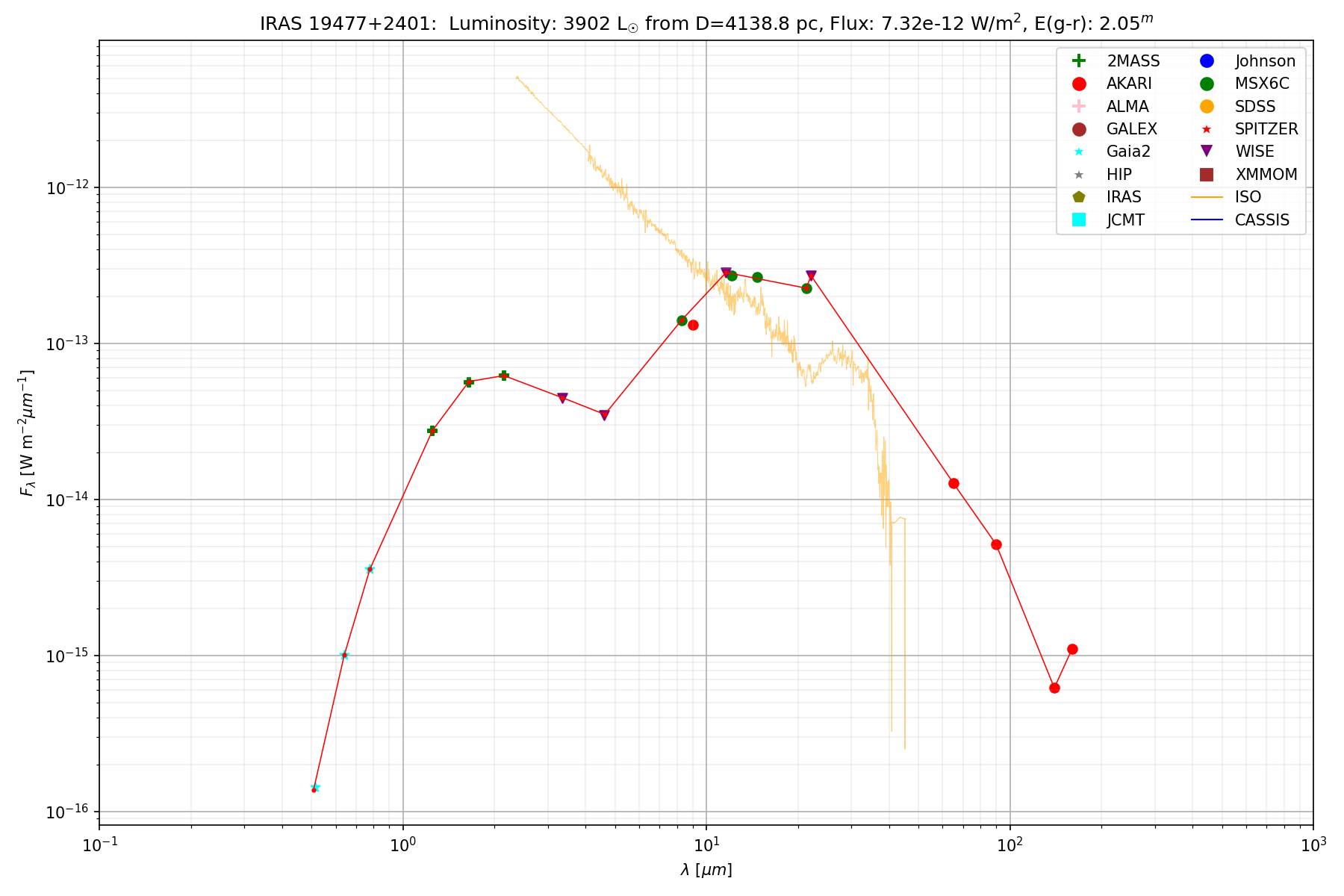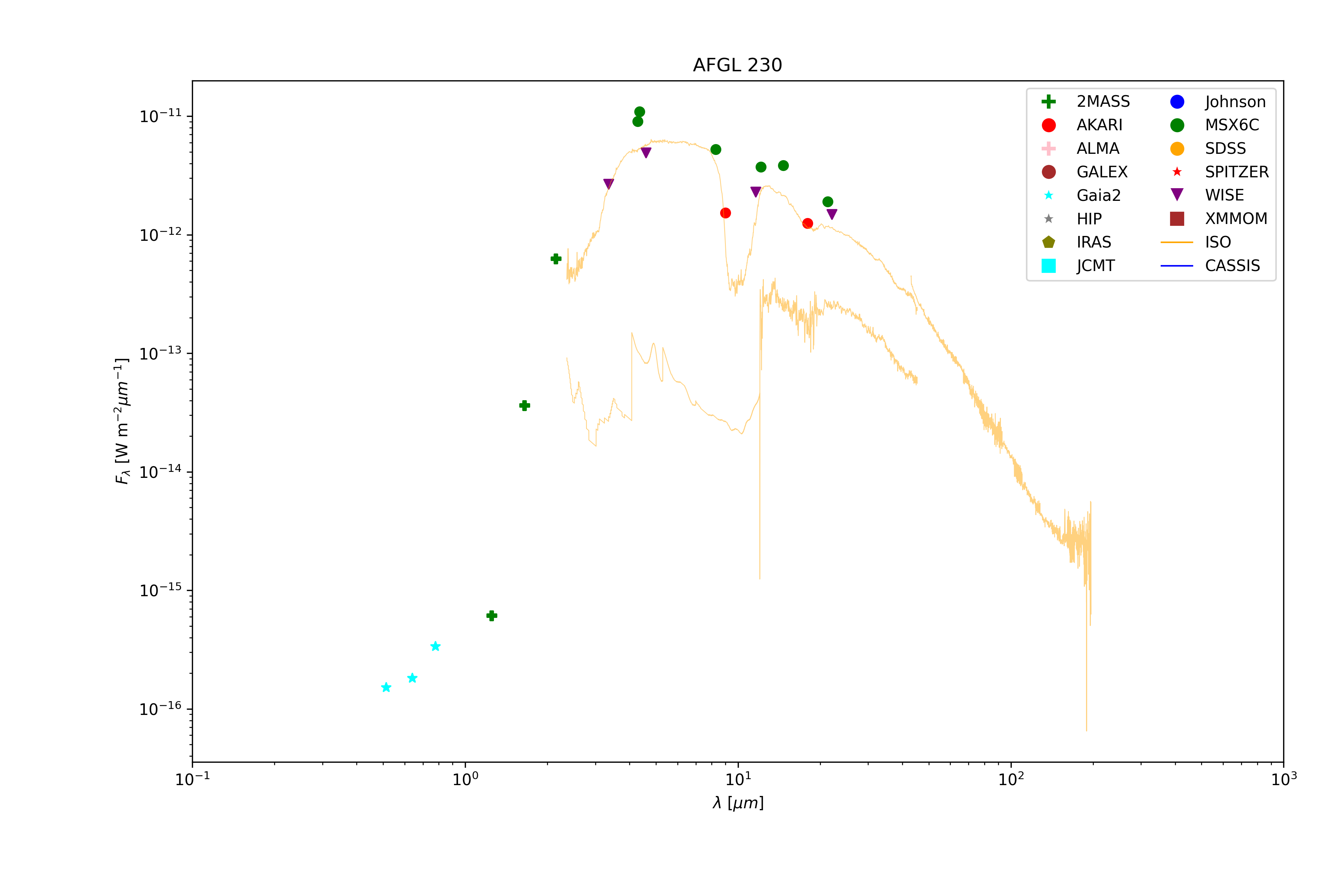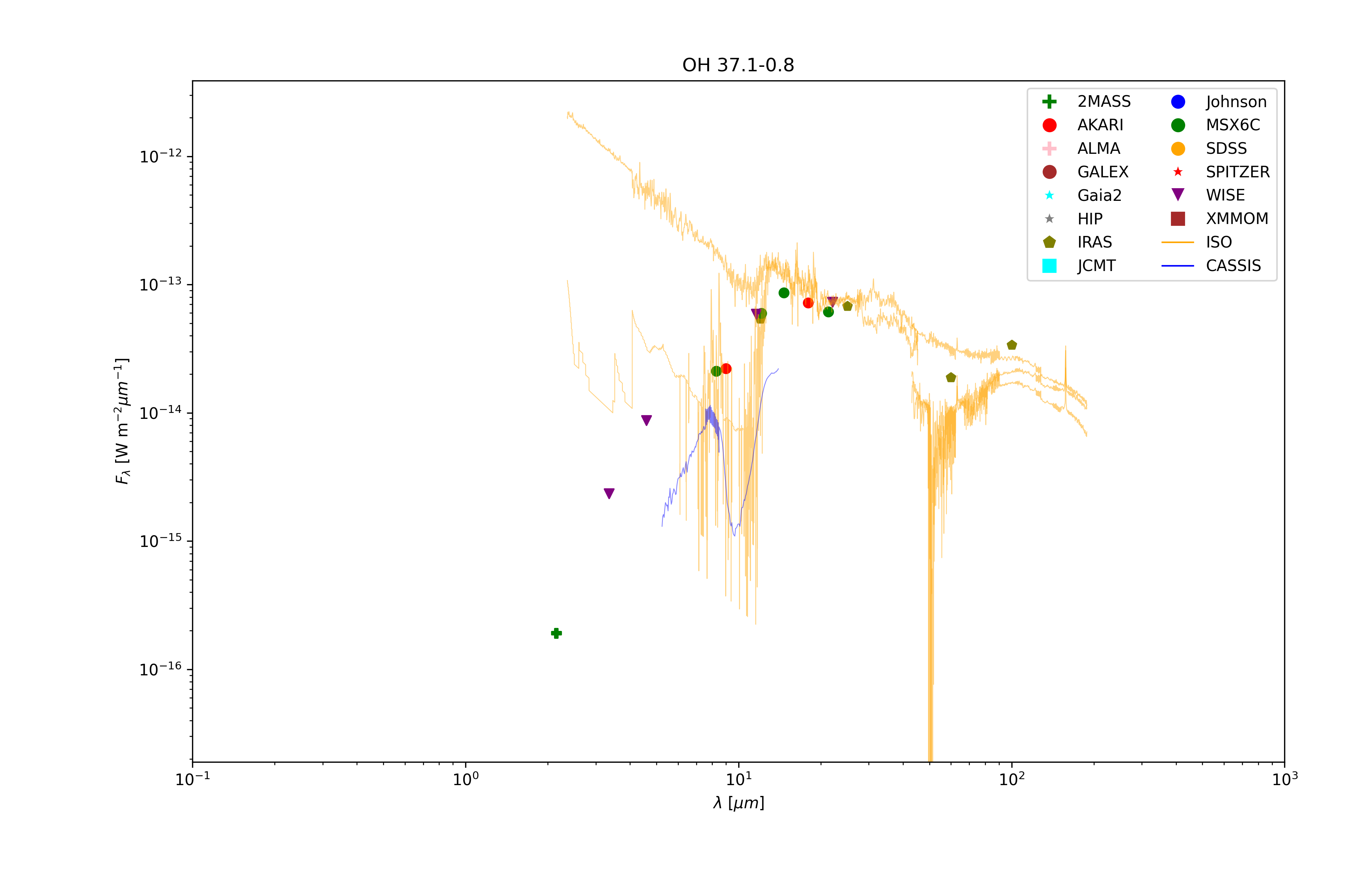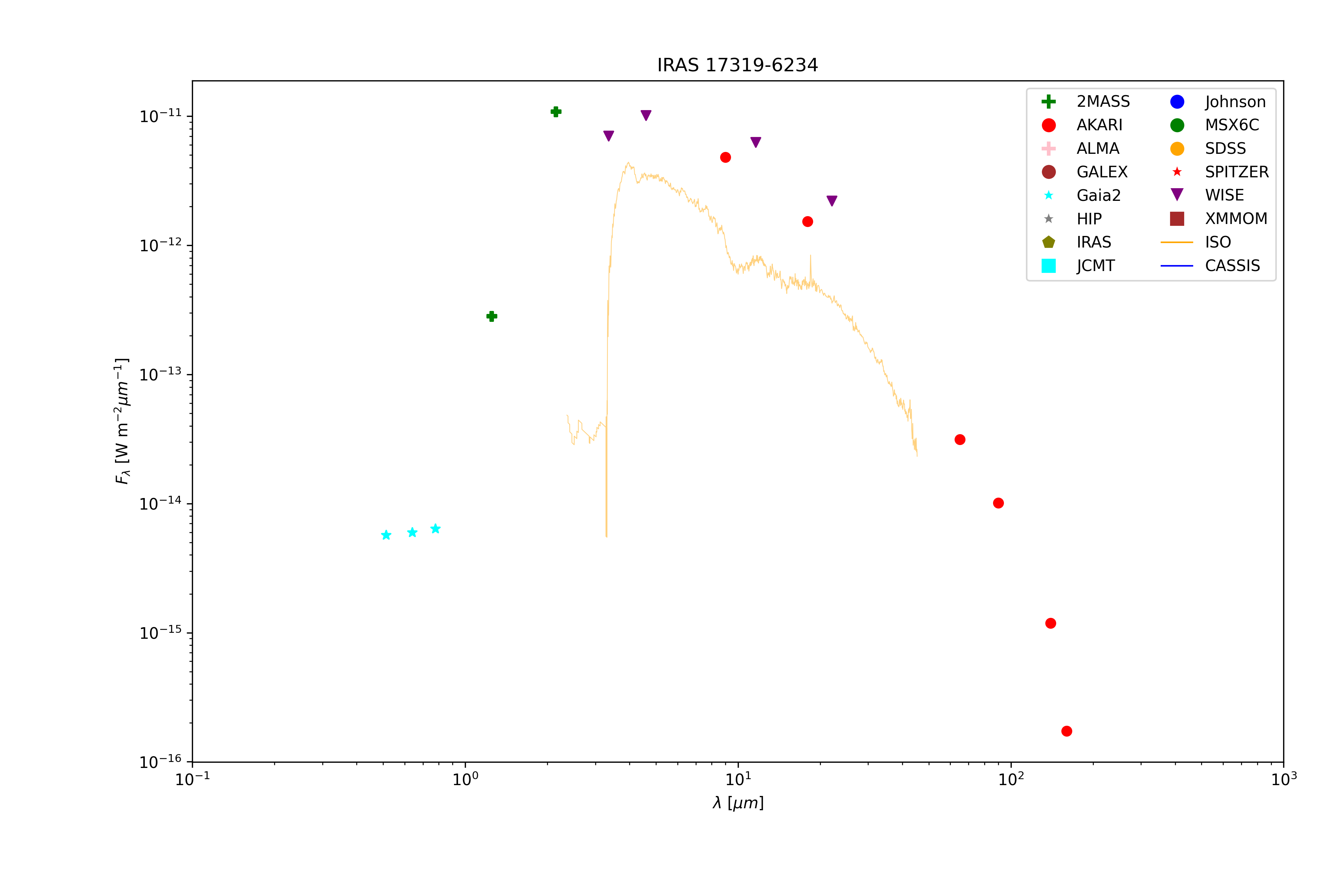 So, for each object, a file with our collected photometry, a file with the SED (corrected and uncorrected for interstellar absorption), a JSON containing all defined and collected data, and an archive with all ISO and Spitzer data and spectra (if available) are available.