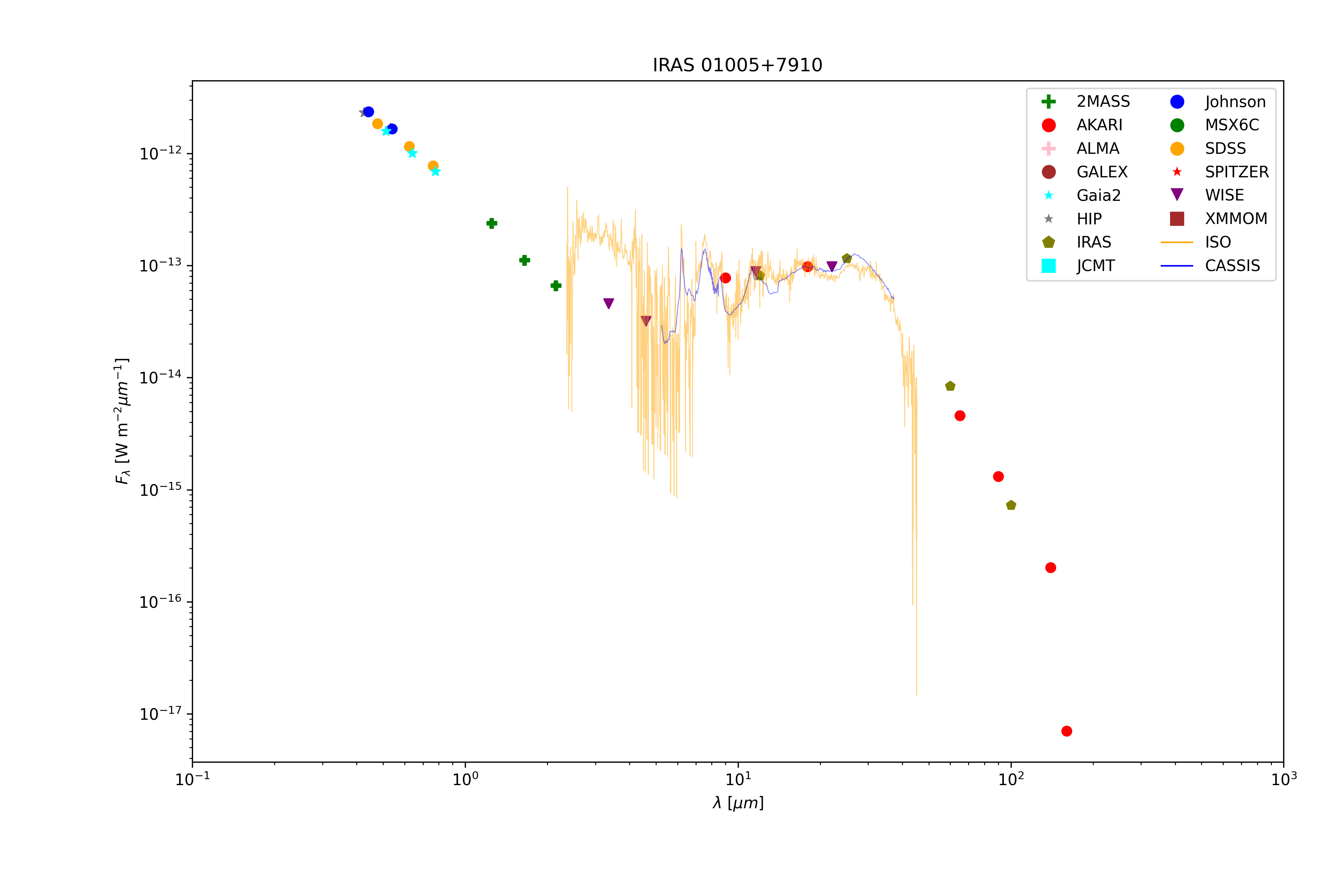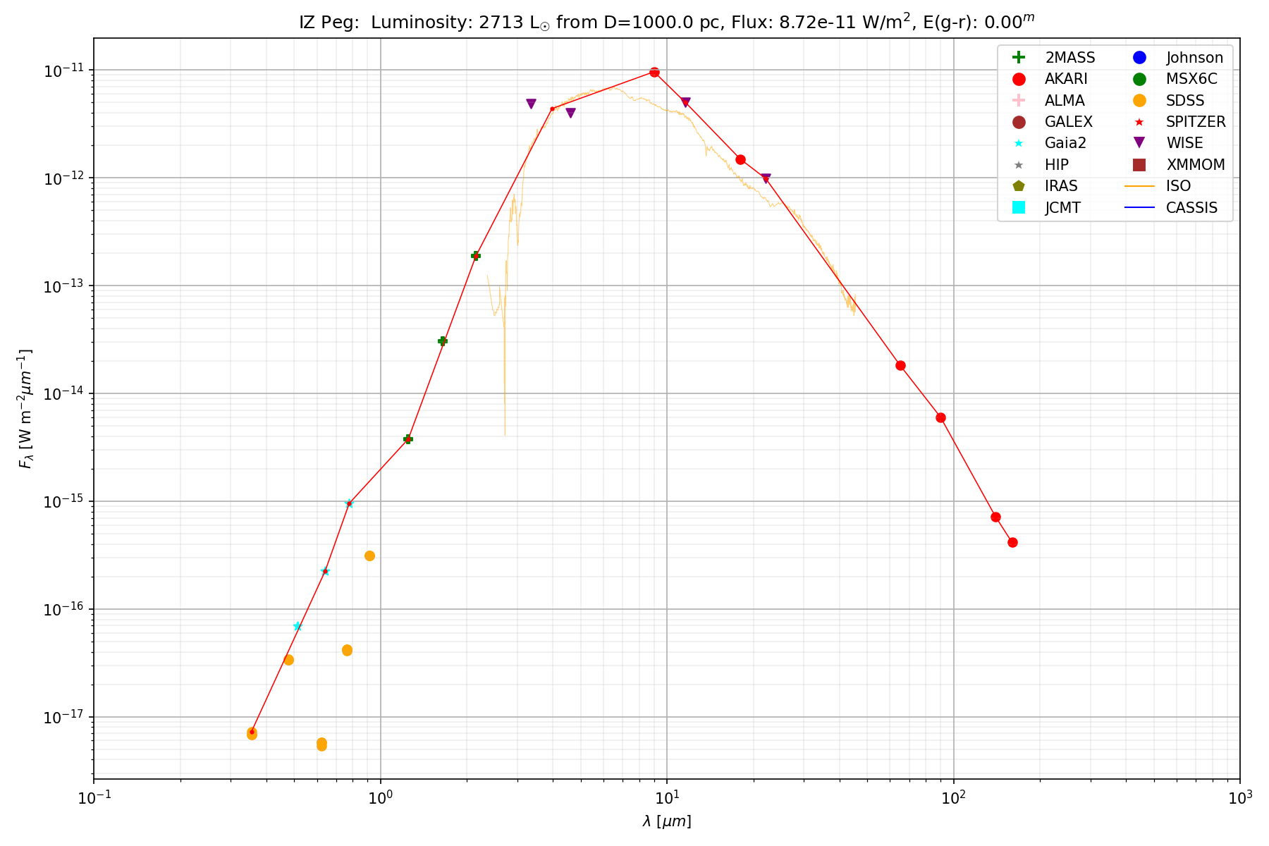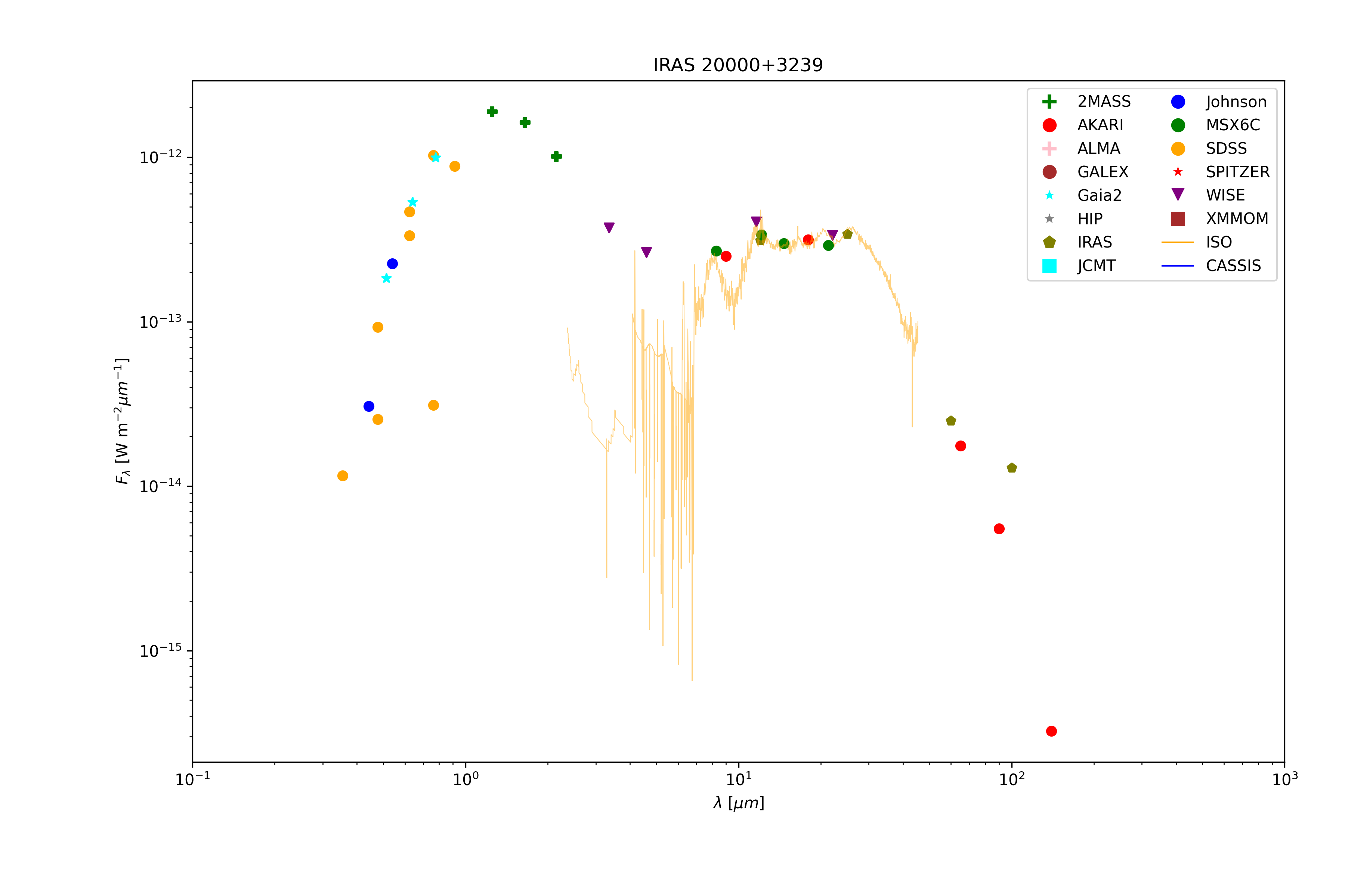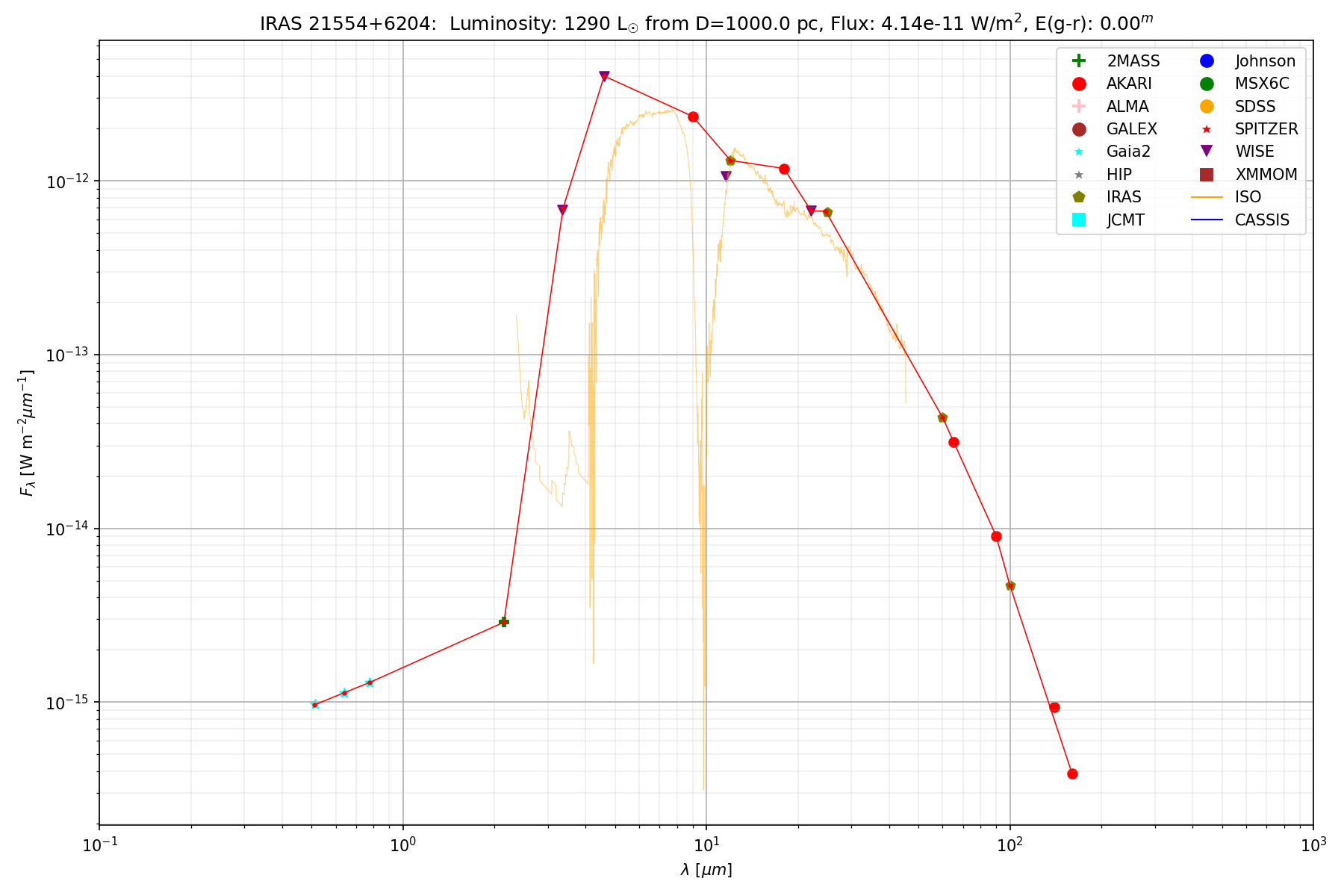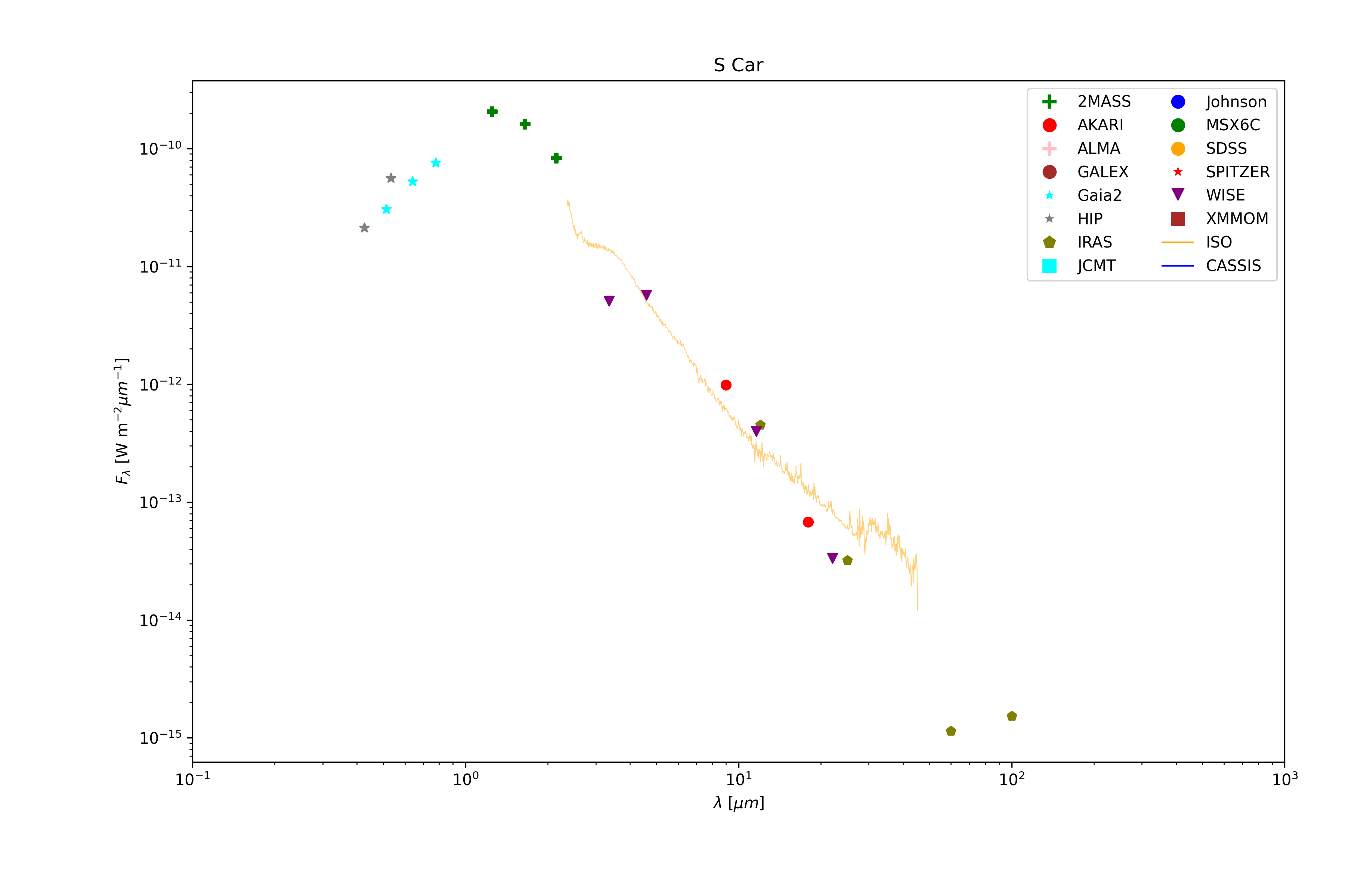 So, for each object, a file with our collected photometry, a file with the SED (corrected and uncorrected for interstellar absorption), a JSON containing all defined and collected data, and an archive with all ISO and Spitzer data and spectra (if available) are available.