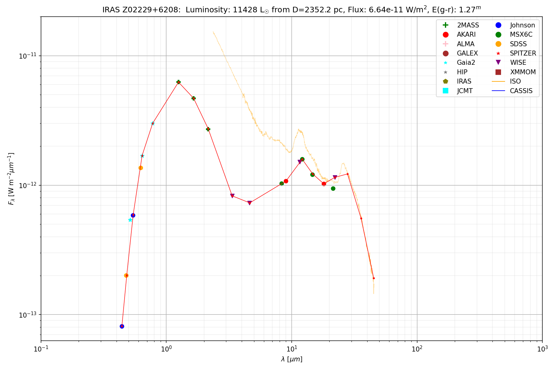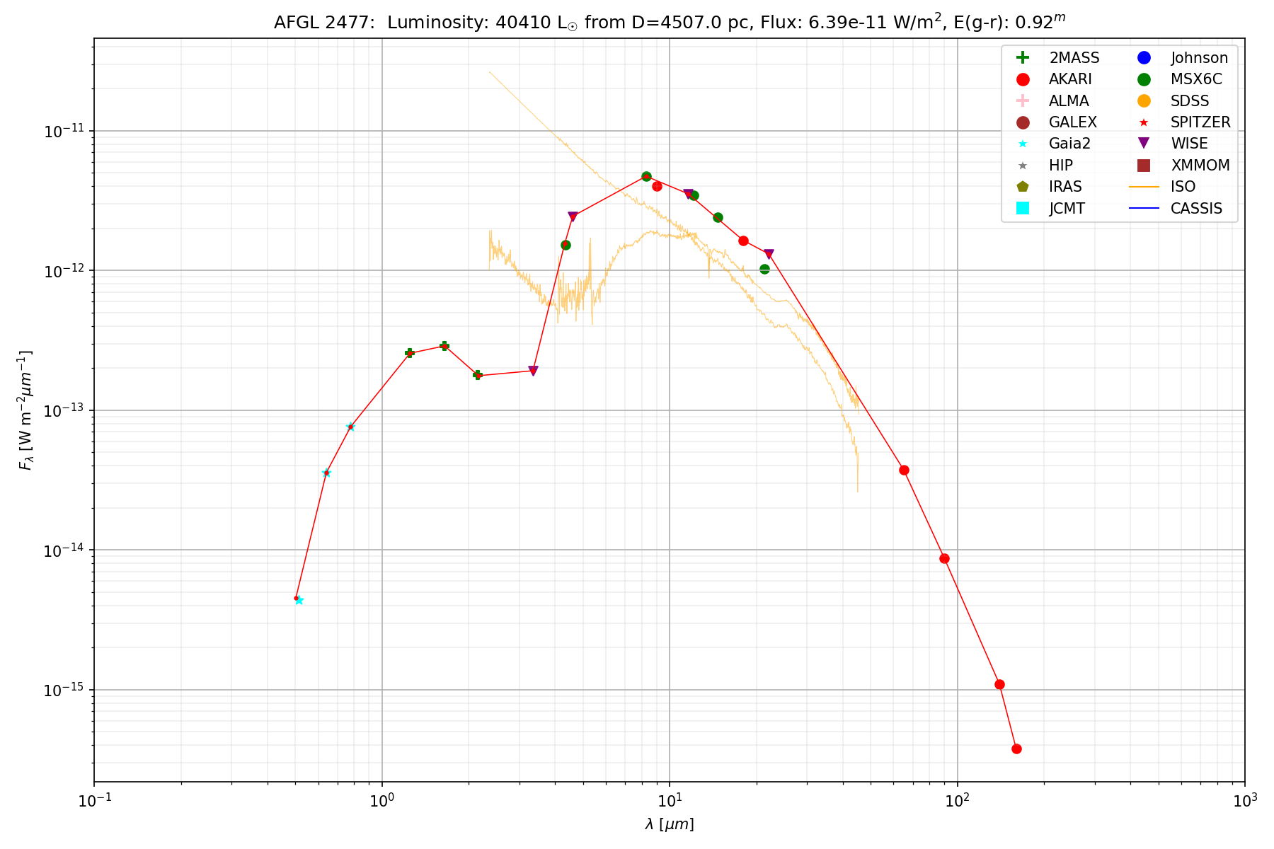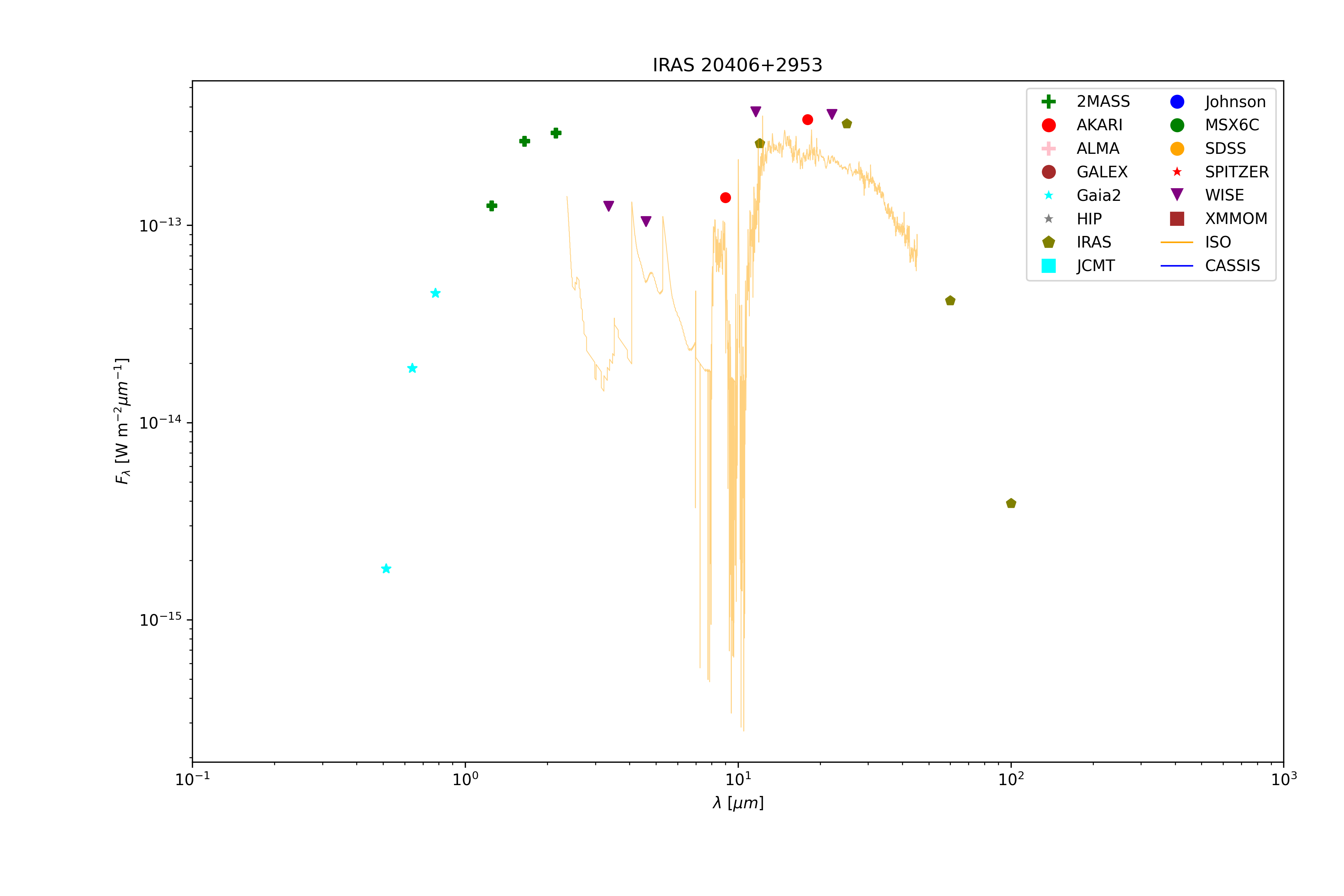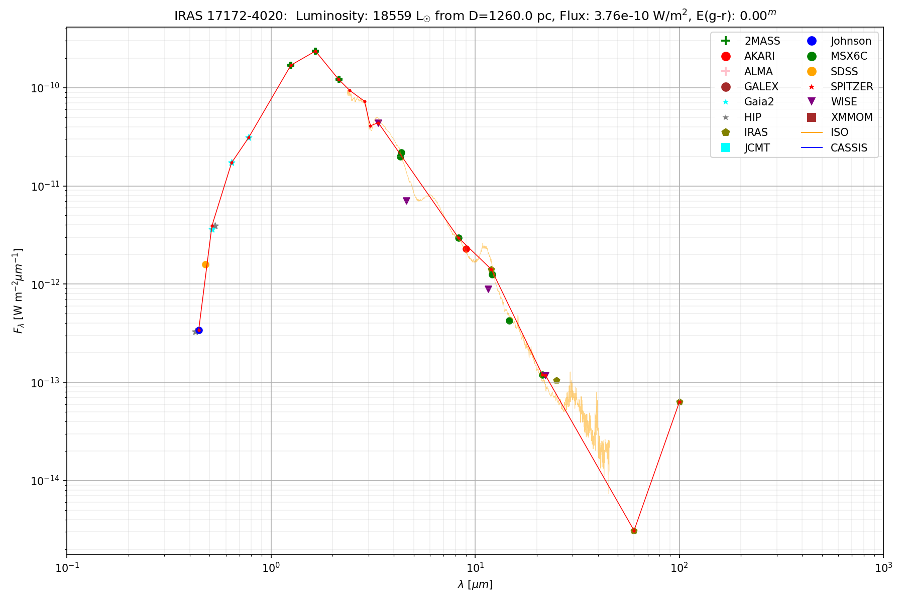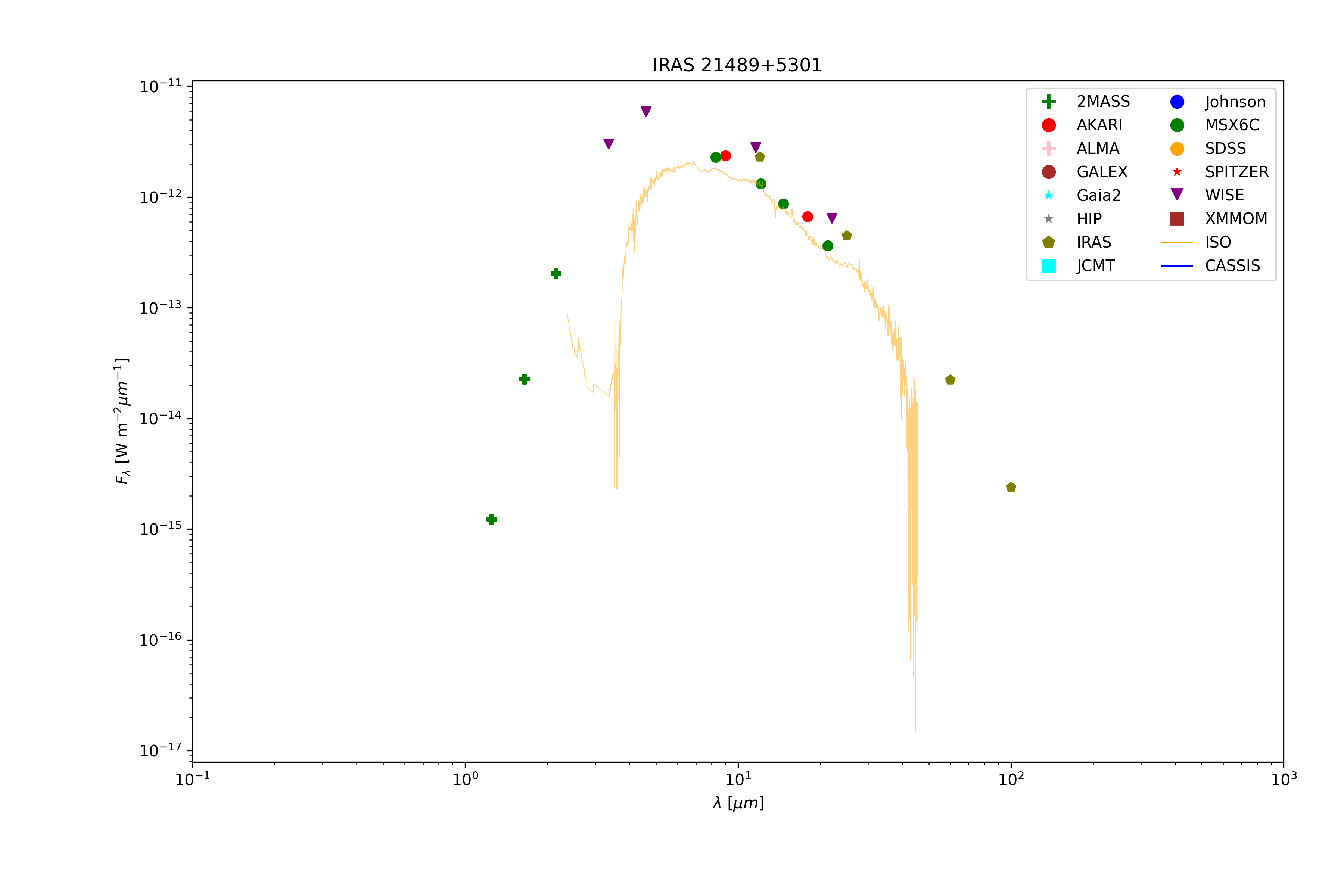 So, for each object, a file with our collected photometry, a file with the SED (corrected and uncorrected for interstellar absorption), a JSON containing all defined and collected data, and an archive with all ISO and Spitzer data and spectra (if available) are available.