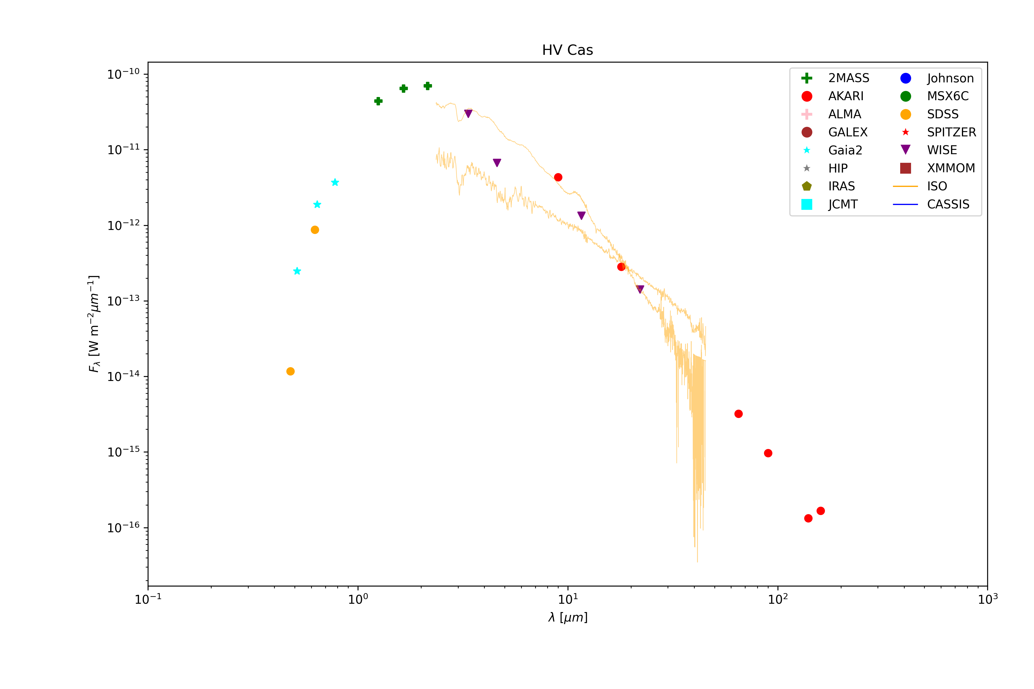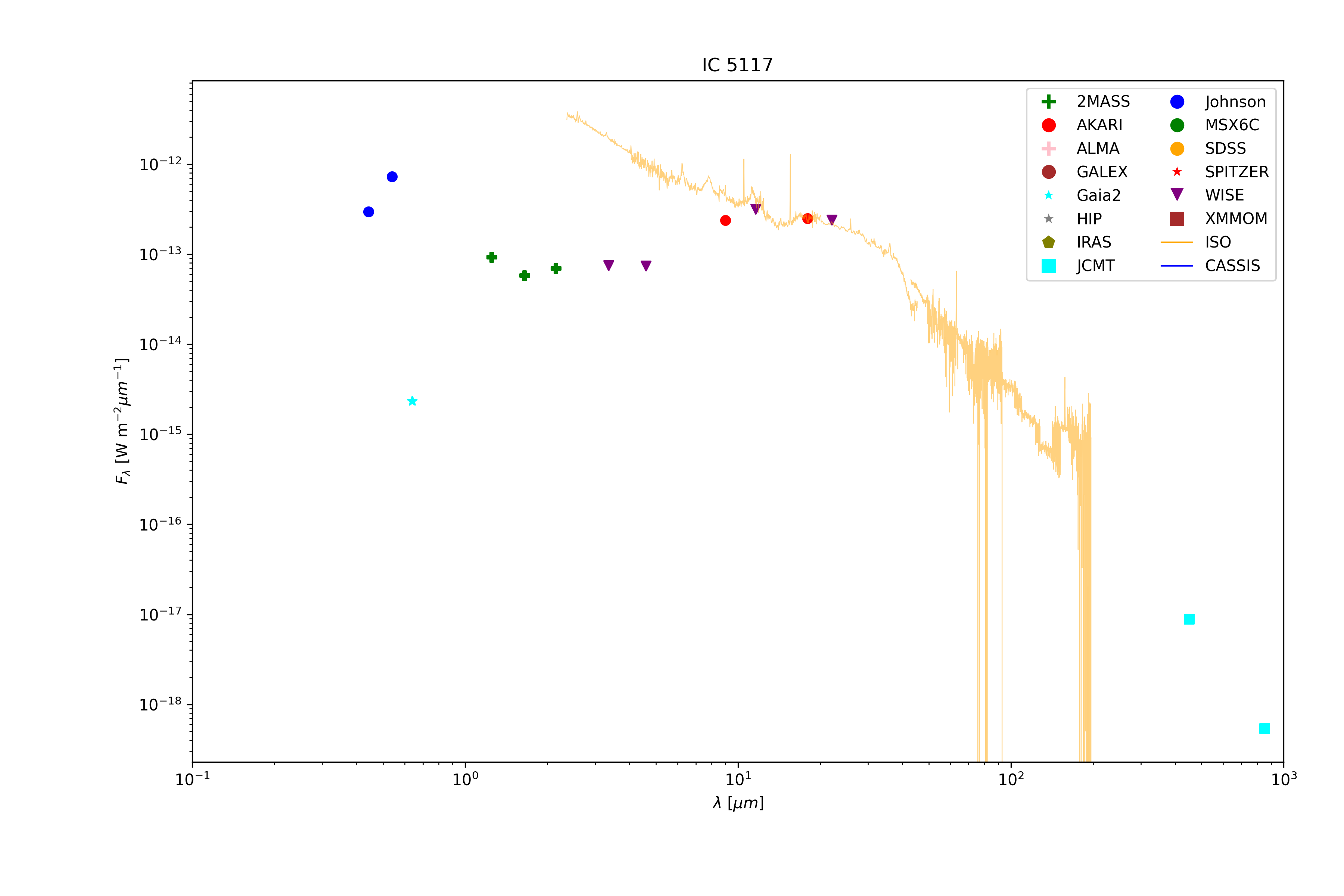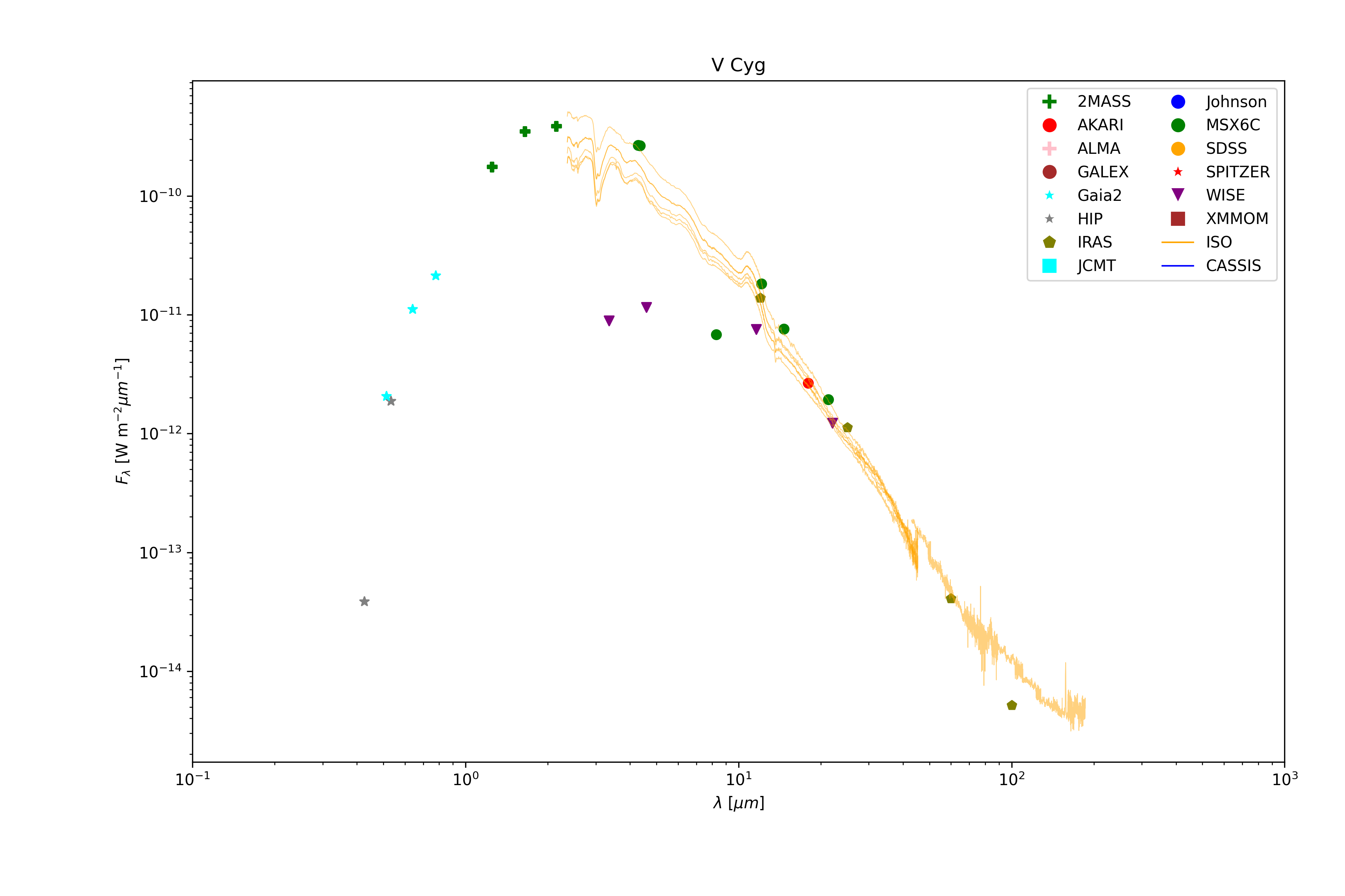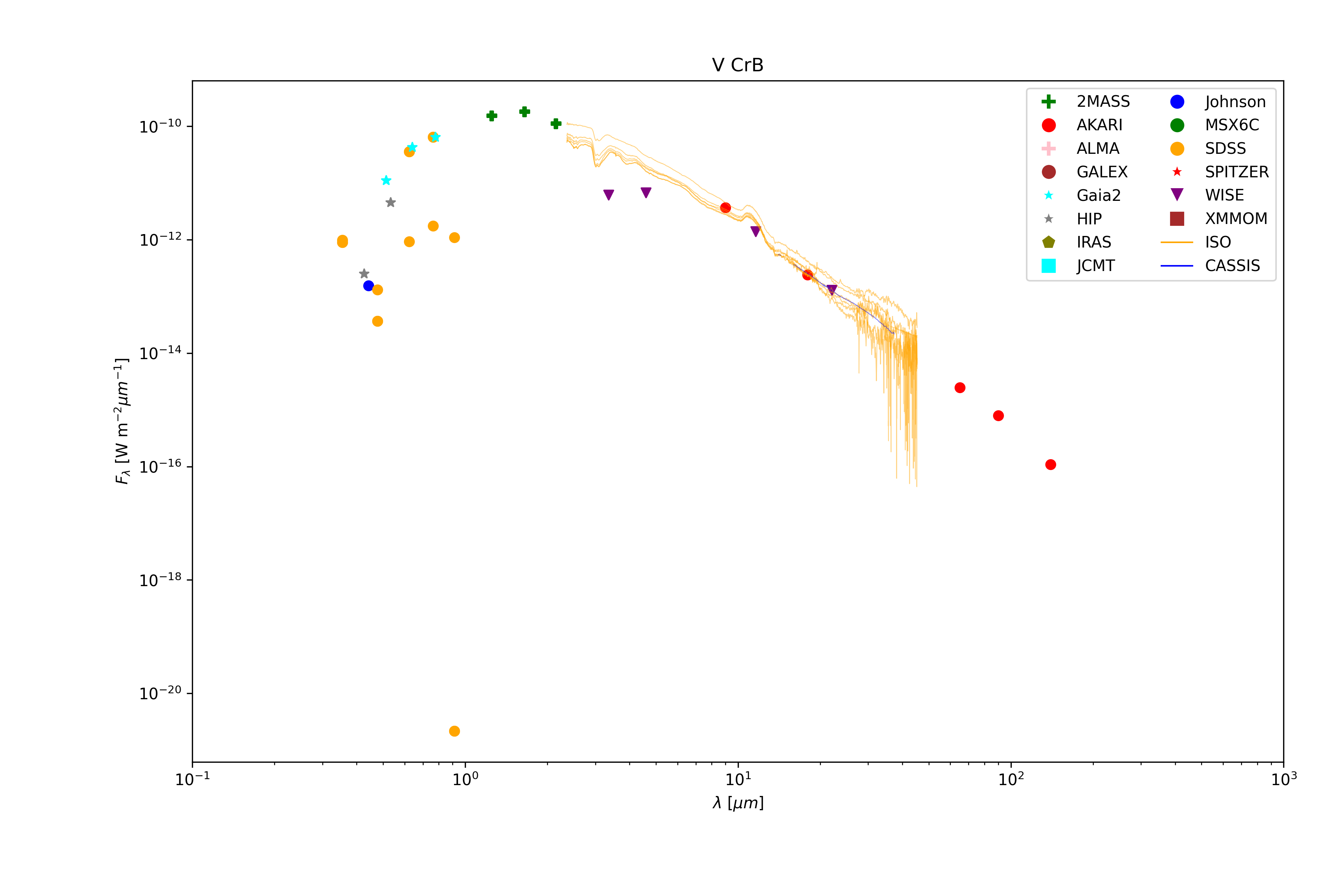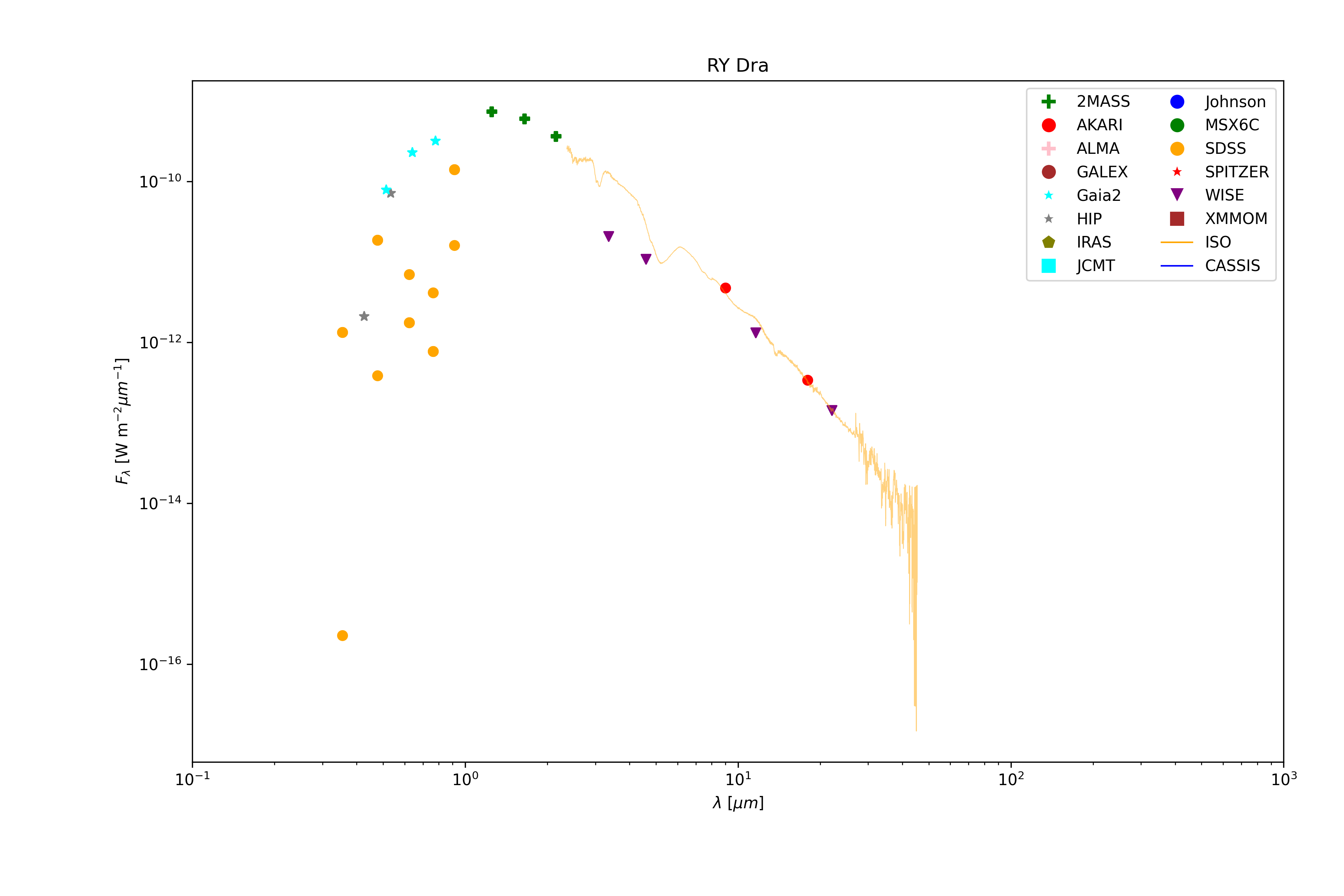 So, for each object, a file with our collected photometry, a file with the SED (corrected and uncorrected for interstellar absorption), a JSON containing all defined and collected data, and an archive with all ISO and Spitzer data and spectra (if available) are available.
