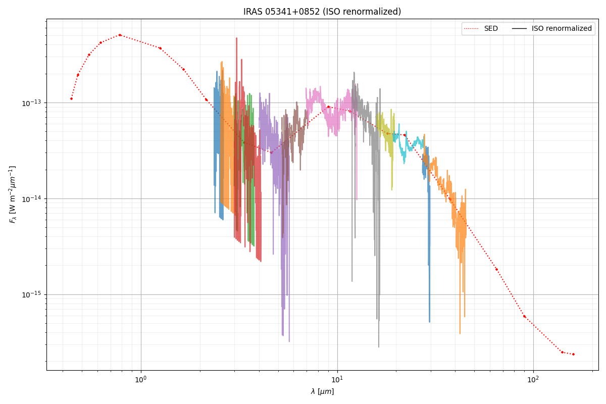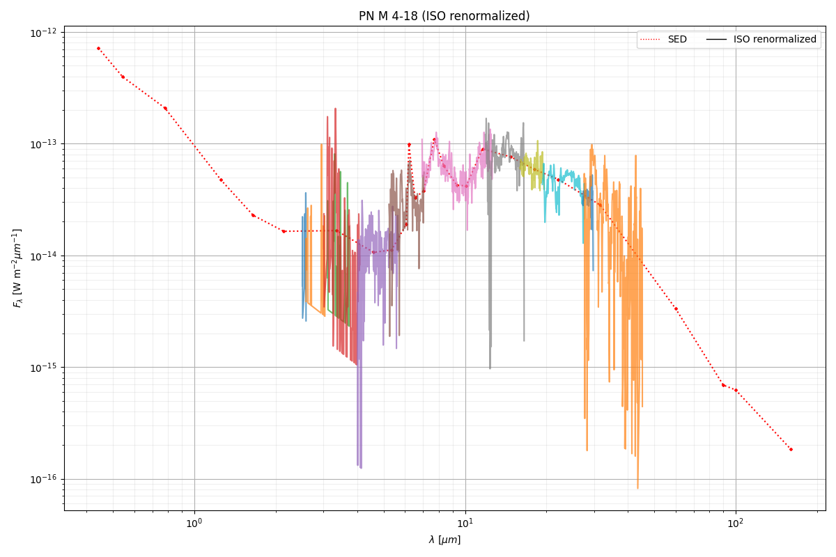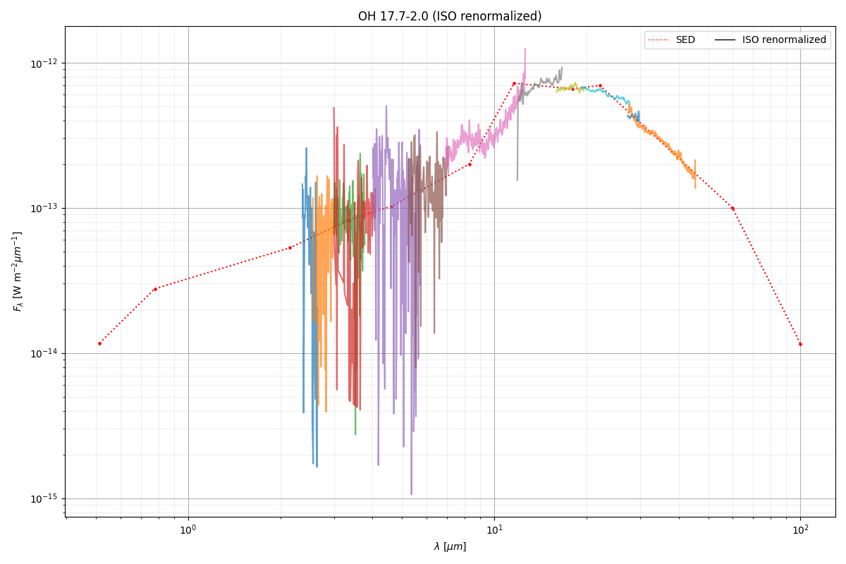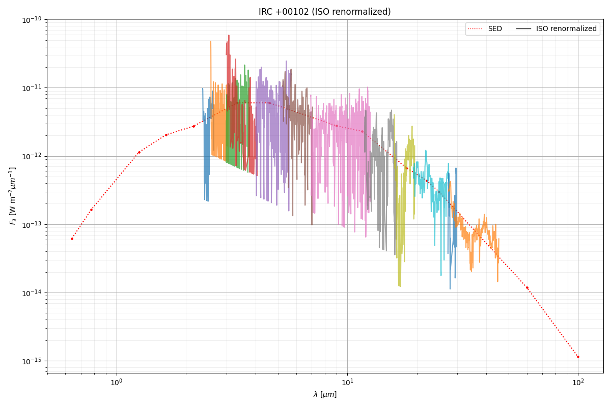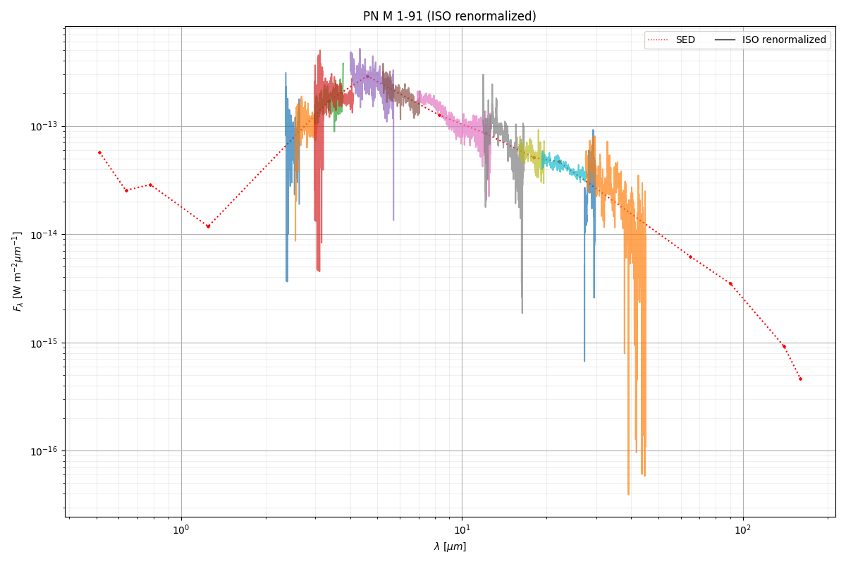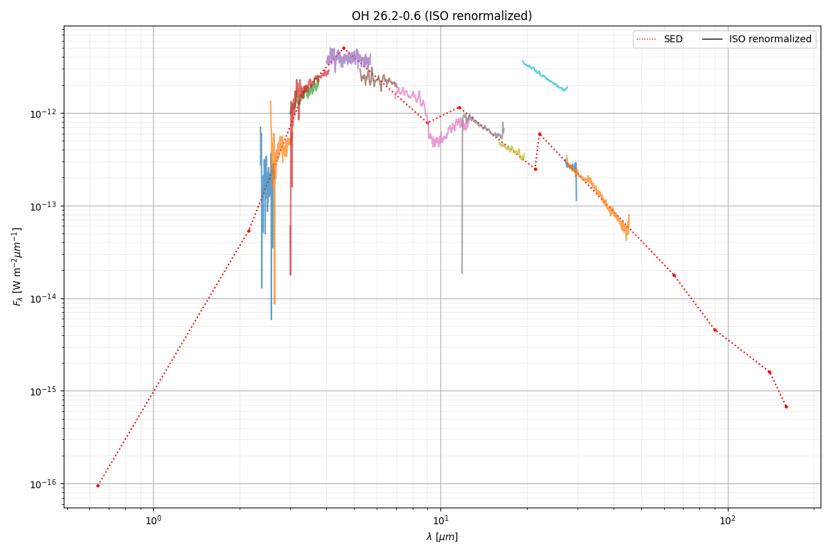 For all objects, we examined the degree of agreement of the ISO SWS spectra with the photometric observations. A good match is indicated by a "+" sign in the “SED pic” column. These spectra can be used without additional calibration. For the data with a "-" sign (-SPic), we made an attempt to correct the SED by renormalizing individual fragments of the spectrum. The description of the procedure is here.