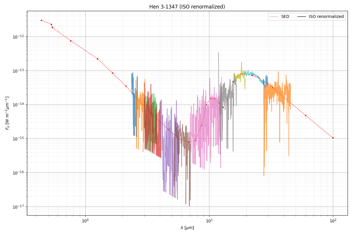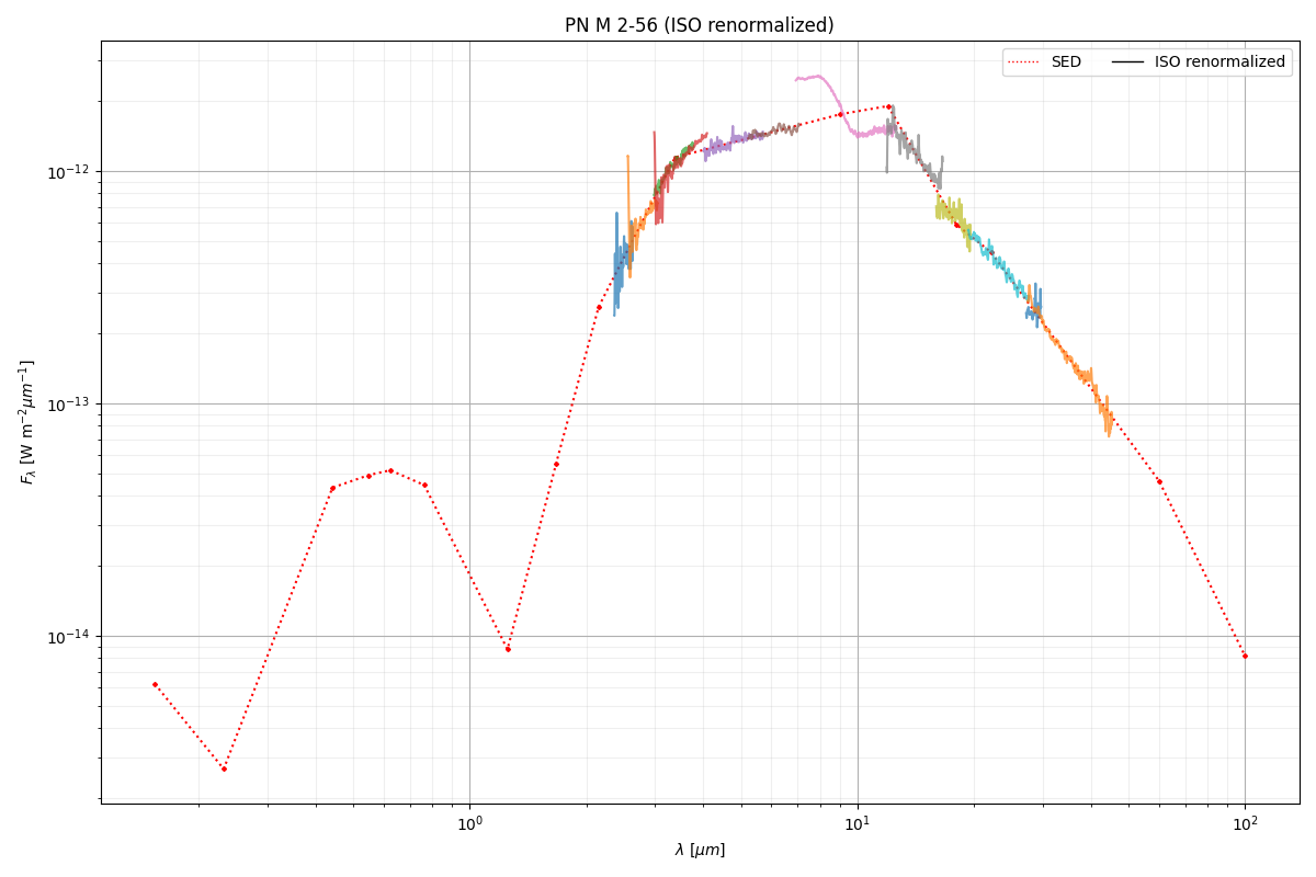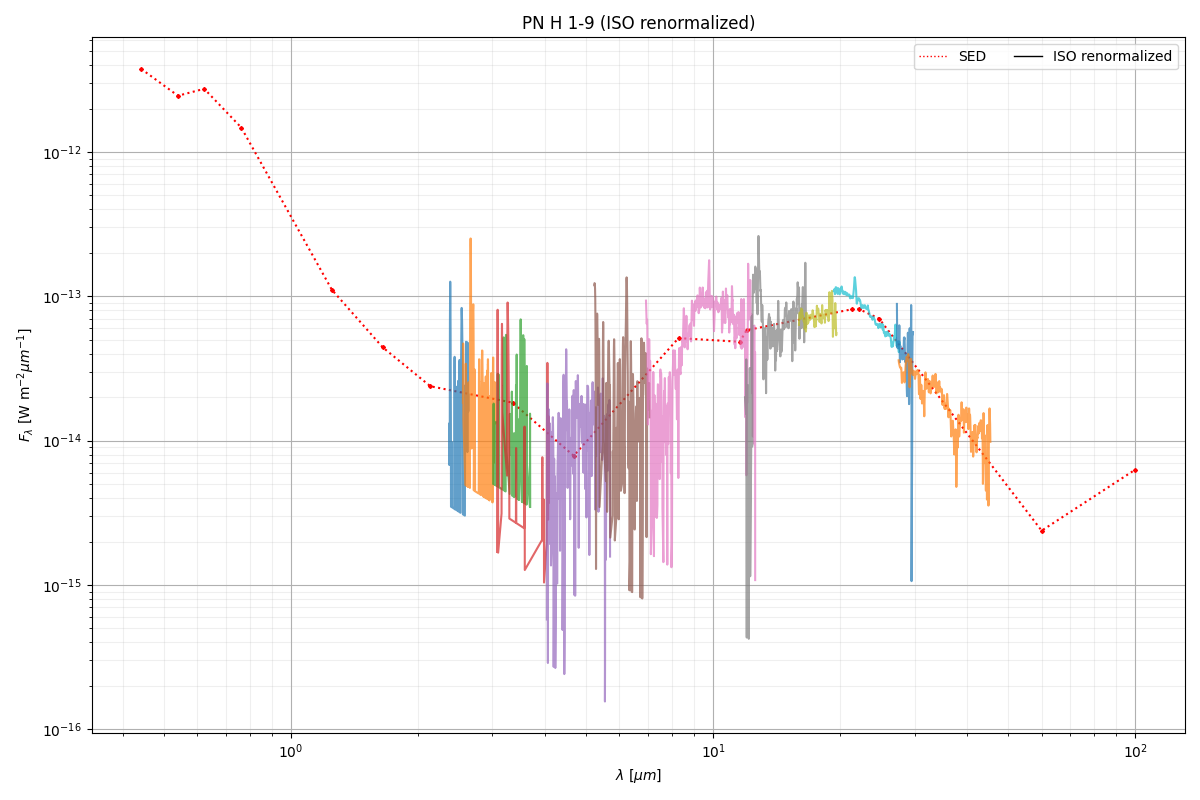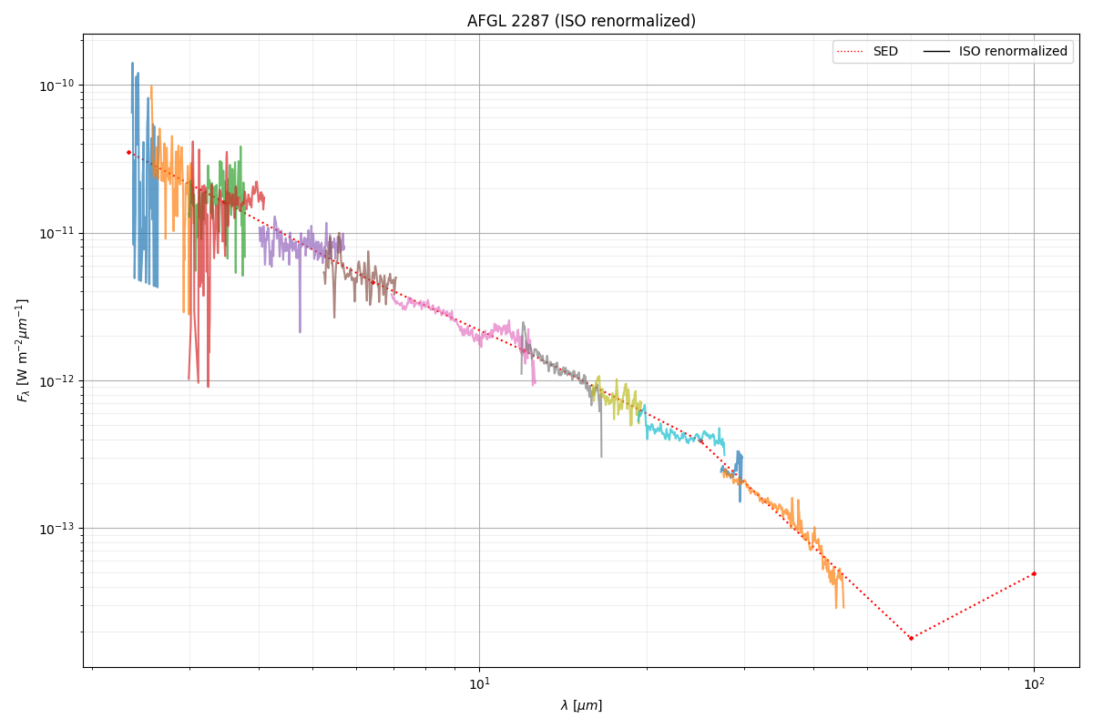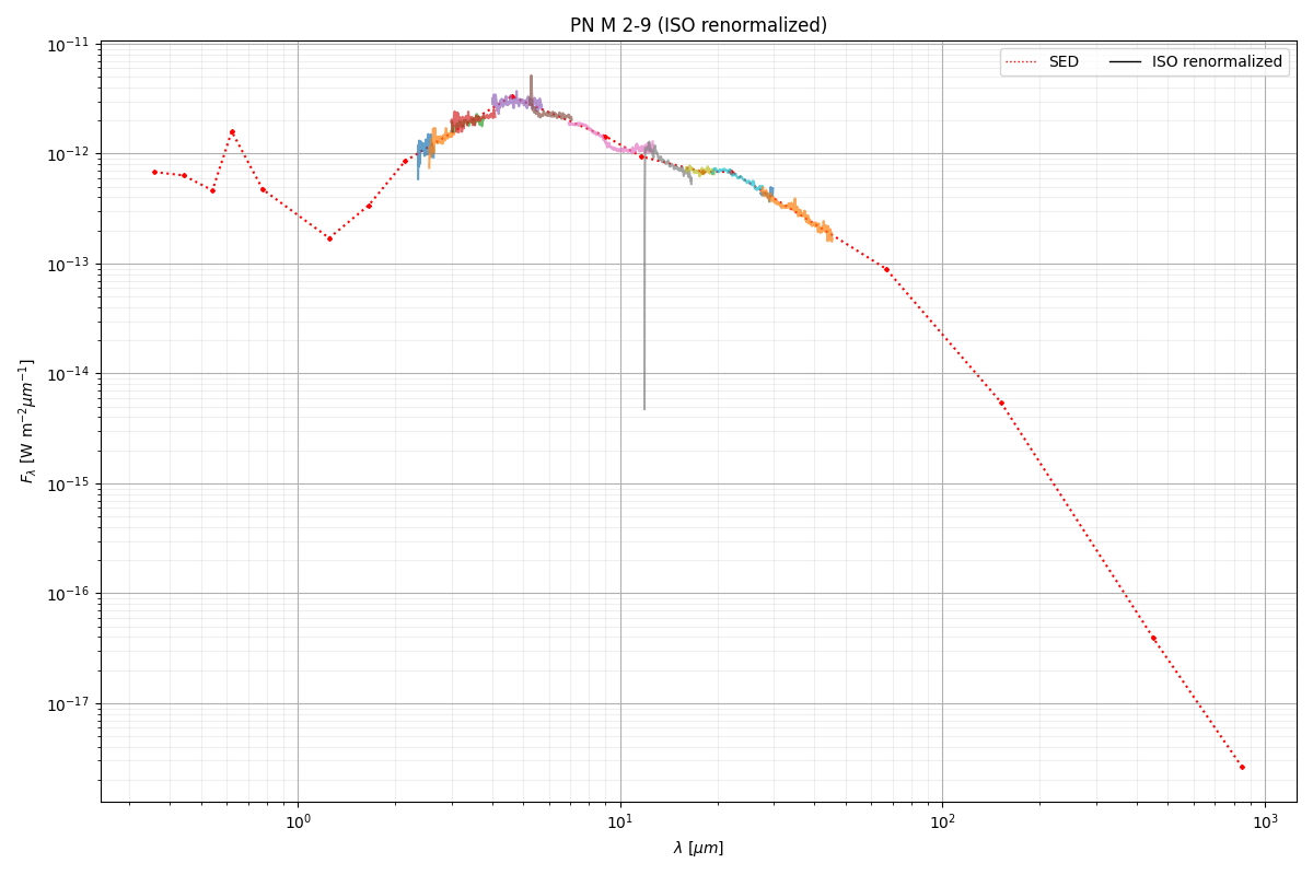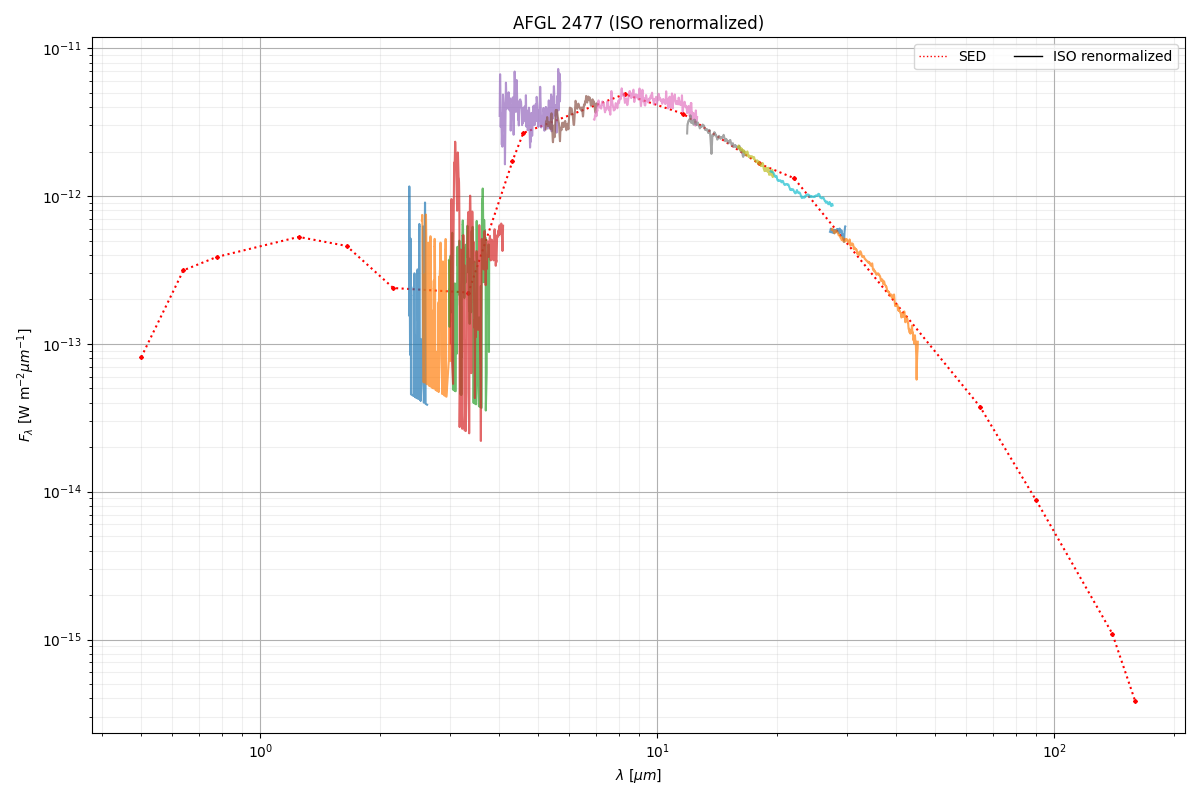 For all objects, we examined the degree of agreement of the ISO SWS spectra with the photometric observations. A good match is indicated by a "+" sign in the “SED pic” column. These spectra can be used without additional calibration. For the data with a "-" sign (-SPic), we made an attempt to correct the SED by renormalizing individual fragments of the spectrum. The description of the procedure is here.