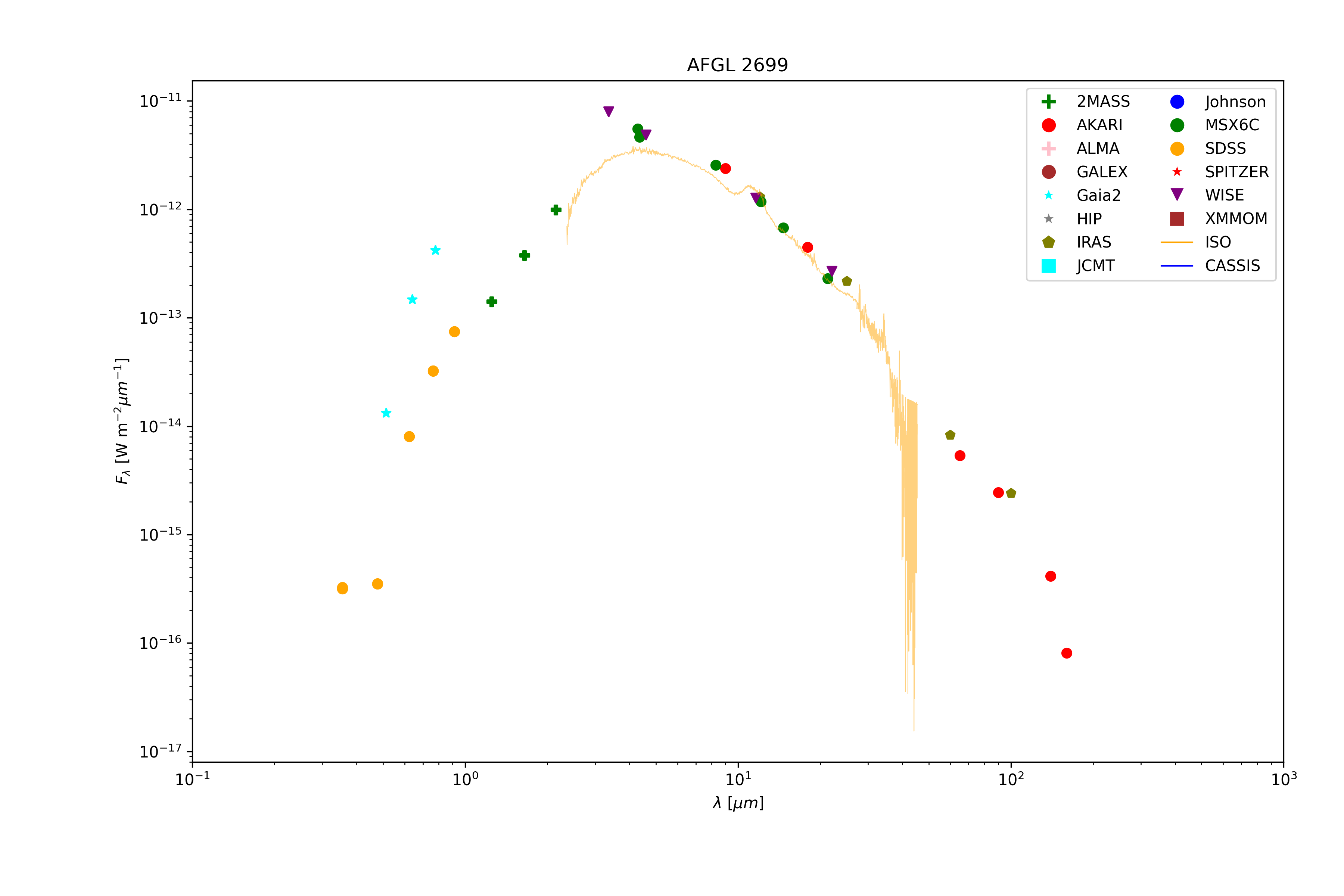 | AFGL 2699 | Carbon Star, C8,3e | 21:04:14.53 | 53:21:04.8 | 10.84 | 3.87e-11 | 2344 | 1395.8 | 0.98 | PPic | + SPic | N/A | Phot Sed | JSON | Archive |
