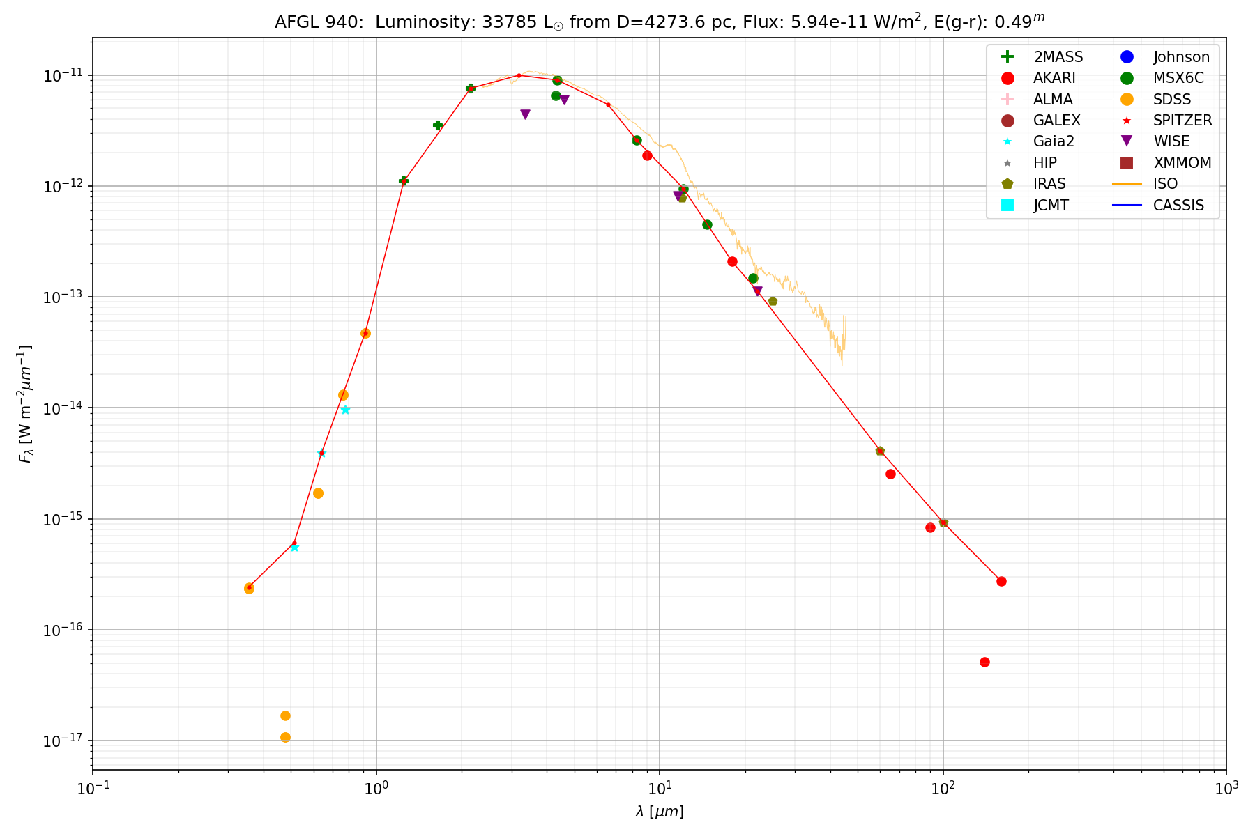 | AFGL 940 | Carbon Star, C | 06:26:37.27 | 09:02:15.2 | 8.613 | 5.94e-11 | 33785 | 4273.6 | 0.49 | PPic | + SPic | N/A | Phot Sed | JSON | Archive |