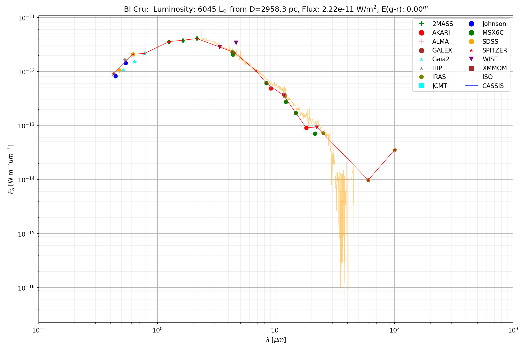 | BI Cru | SymS, M0/1e | 12:23:25.99 | -62:38:16.0 | 7.33 | 2.22e-11 | 6045 | 2958.3 | nan | PPic | + SPic | N/A | Phot Sed | JSON | Archive |