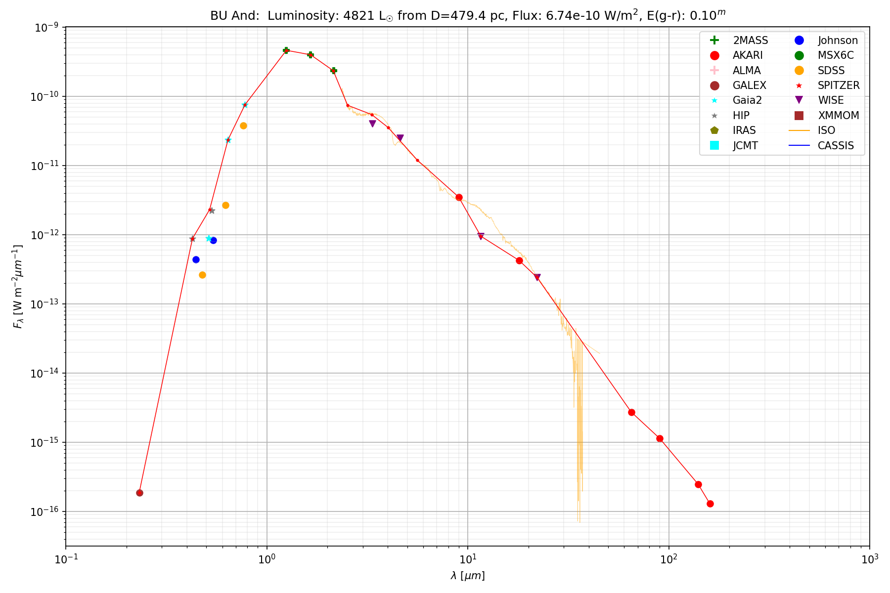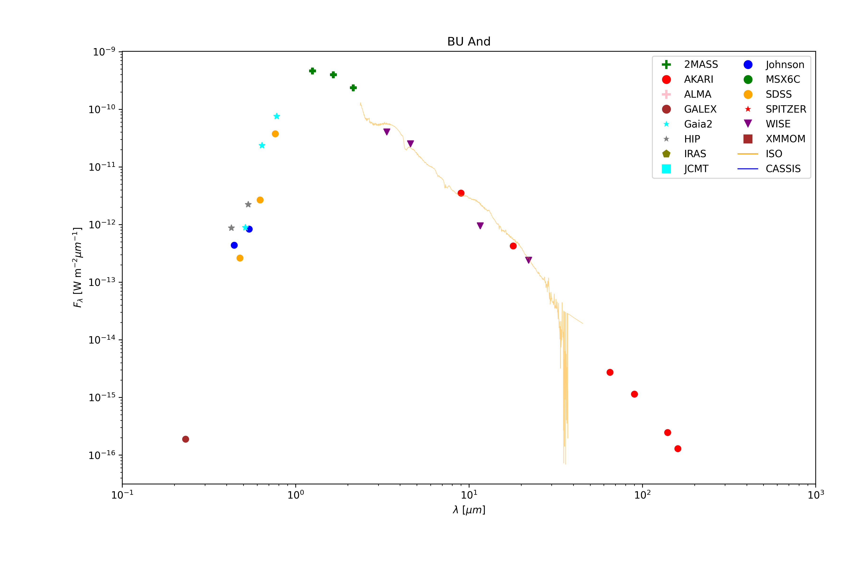 | BU And | Mira, M8 | 23:23:39.89 | 39:43:37.0 | 2.05 | 6.74e-10 | 4821 | 479.4 | 0.10 | PPic | + SPic | N/A | Phot Sed | JSON | Archive |