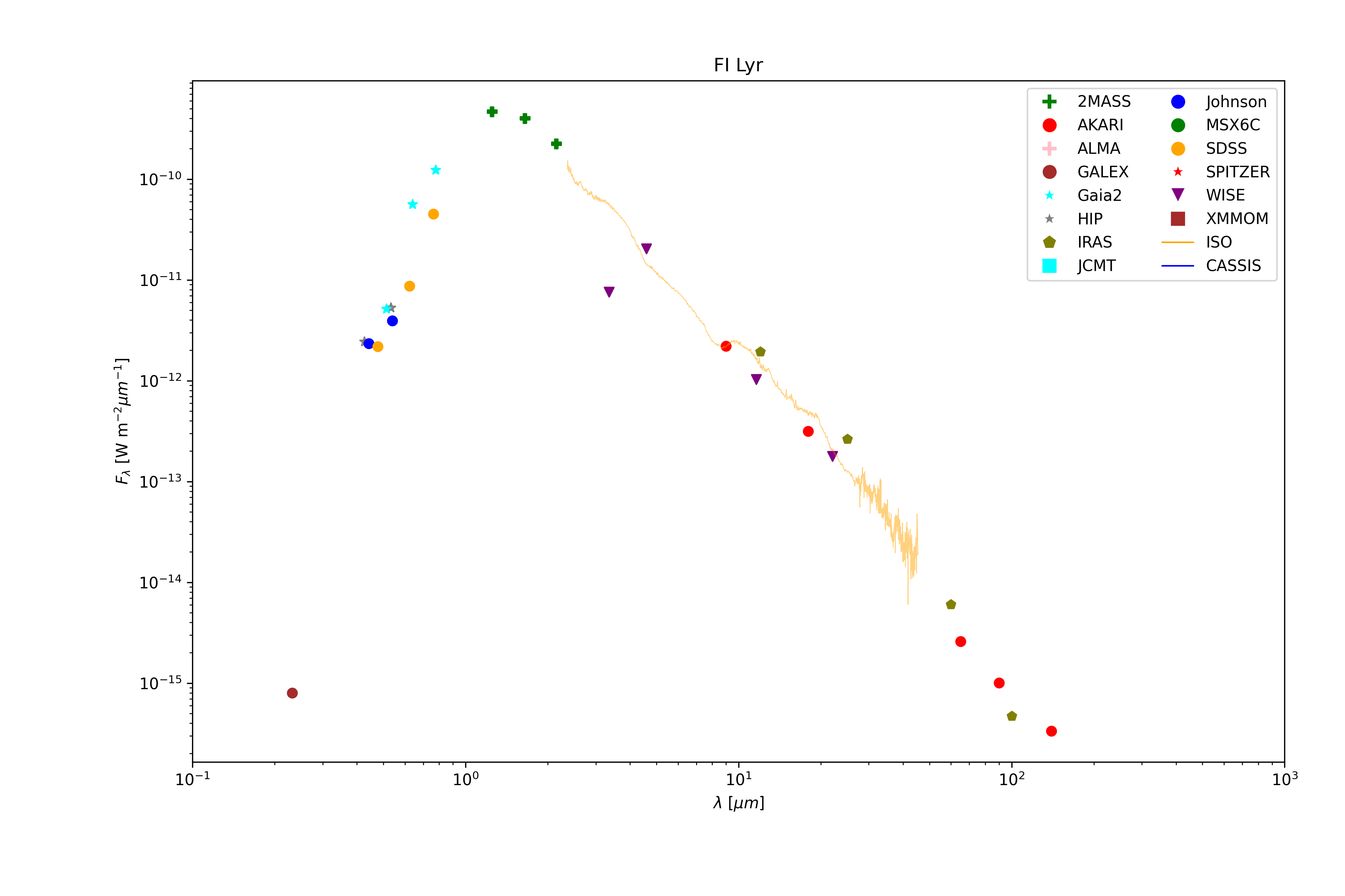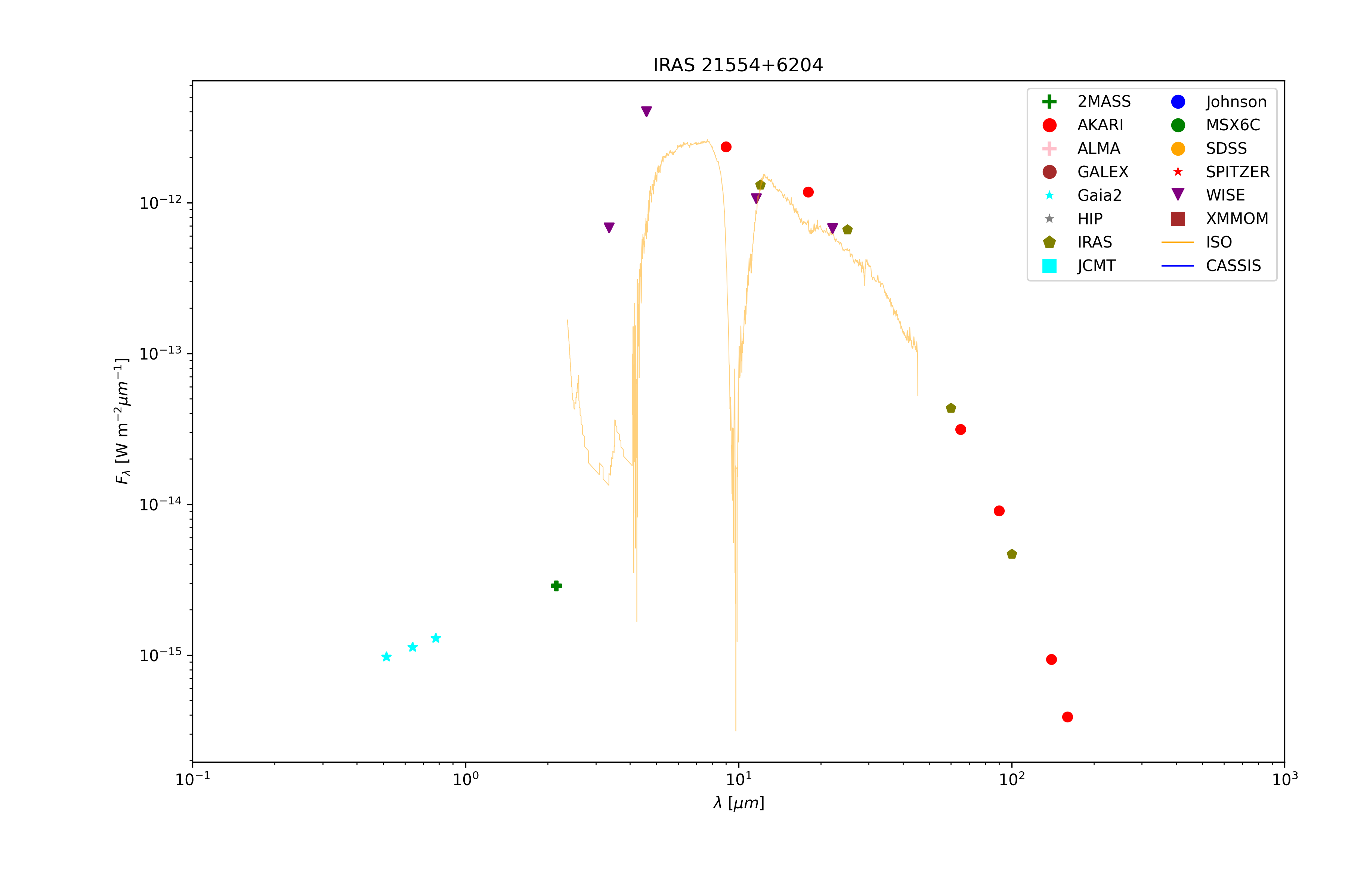 SED of the objects were compiled from ISO SWS spectra, ISO LWS spectra and Spitzer CASIS spectra (where available) and photometry data from IRAS, MSX, AKARI, WISE, GAIA, etc. catalogs. We used modified sydbys code to work with data sources. The SEDs thus obtained are available in the columns Phot Pic (figure) and Phot Dat (TXT table).