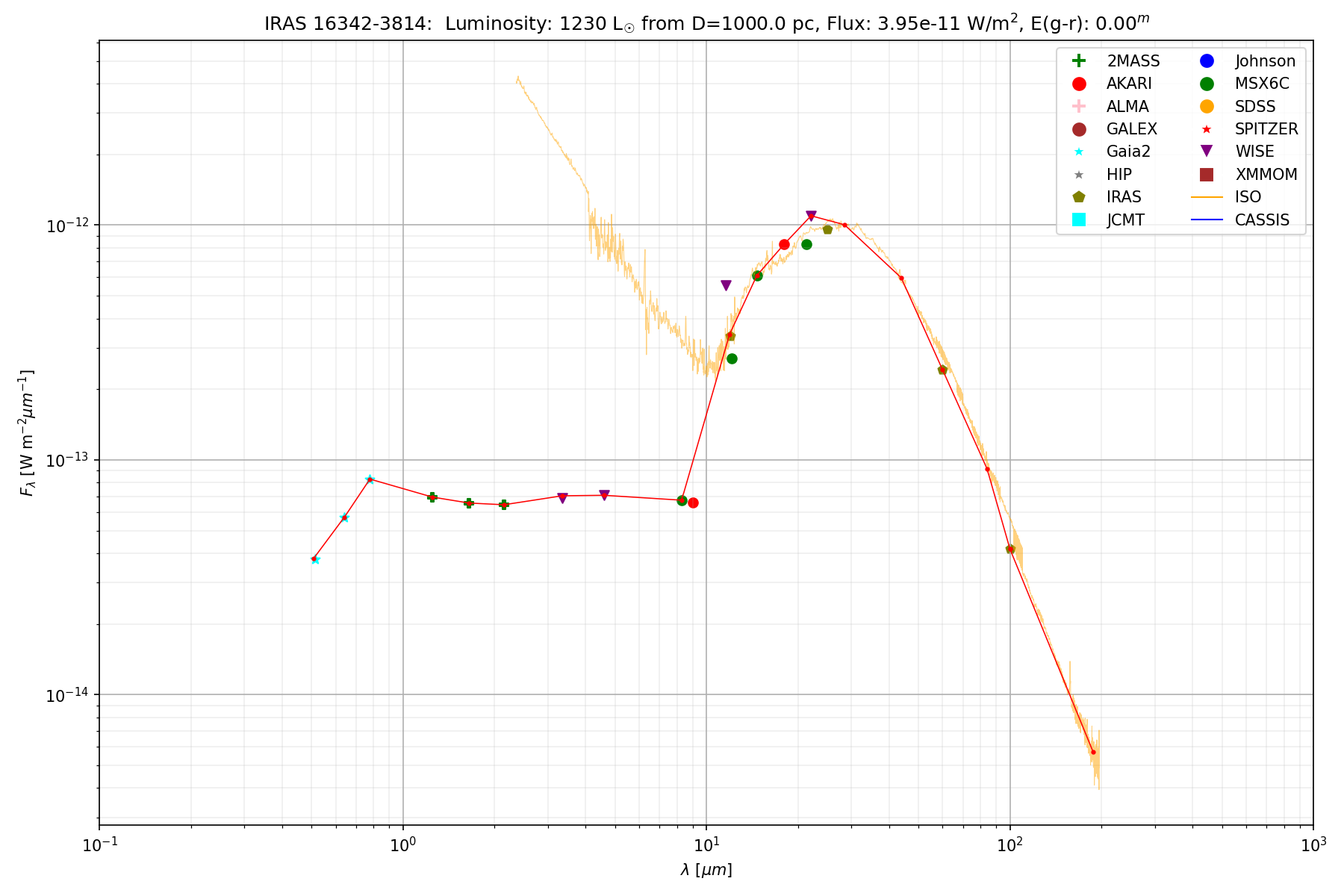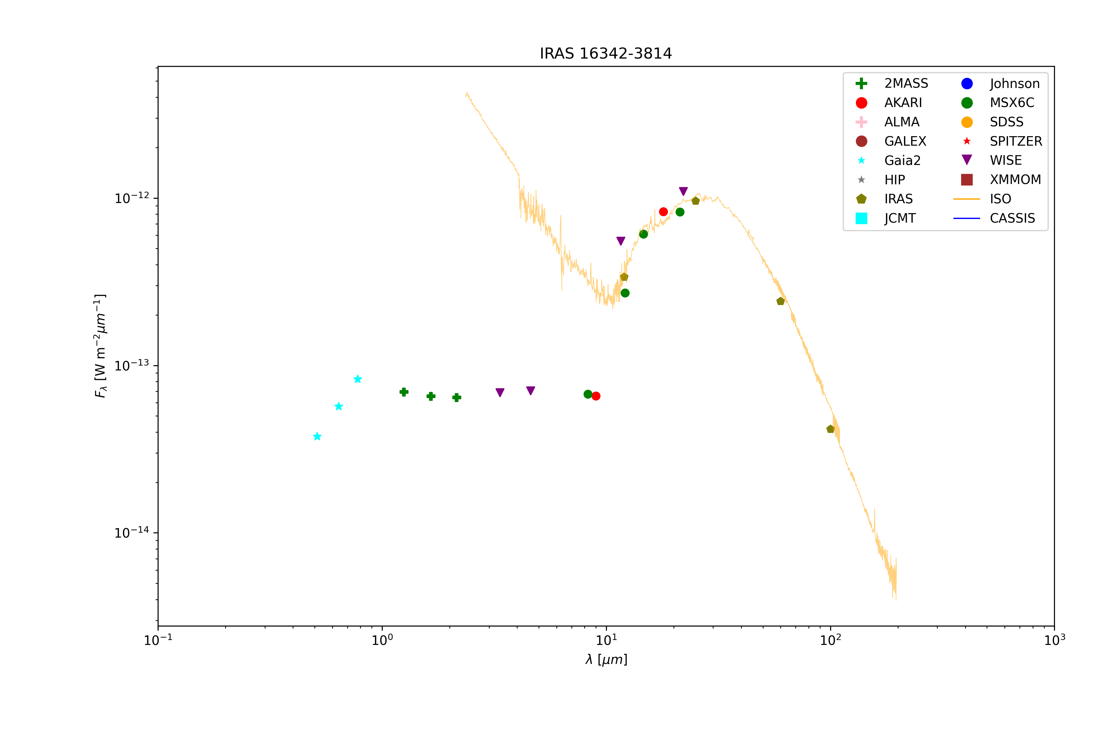 | IRAS 16342-3814 | Post-AGB, ? | 16:37:39.87 | -38:20:17.4 | 11.61 | 3.95e-11 | 1230 | nan | nan | PPic | +- SPic | N/A | Phot Sed | JSON | Archive |