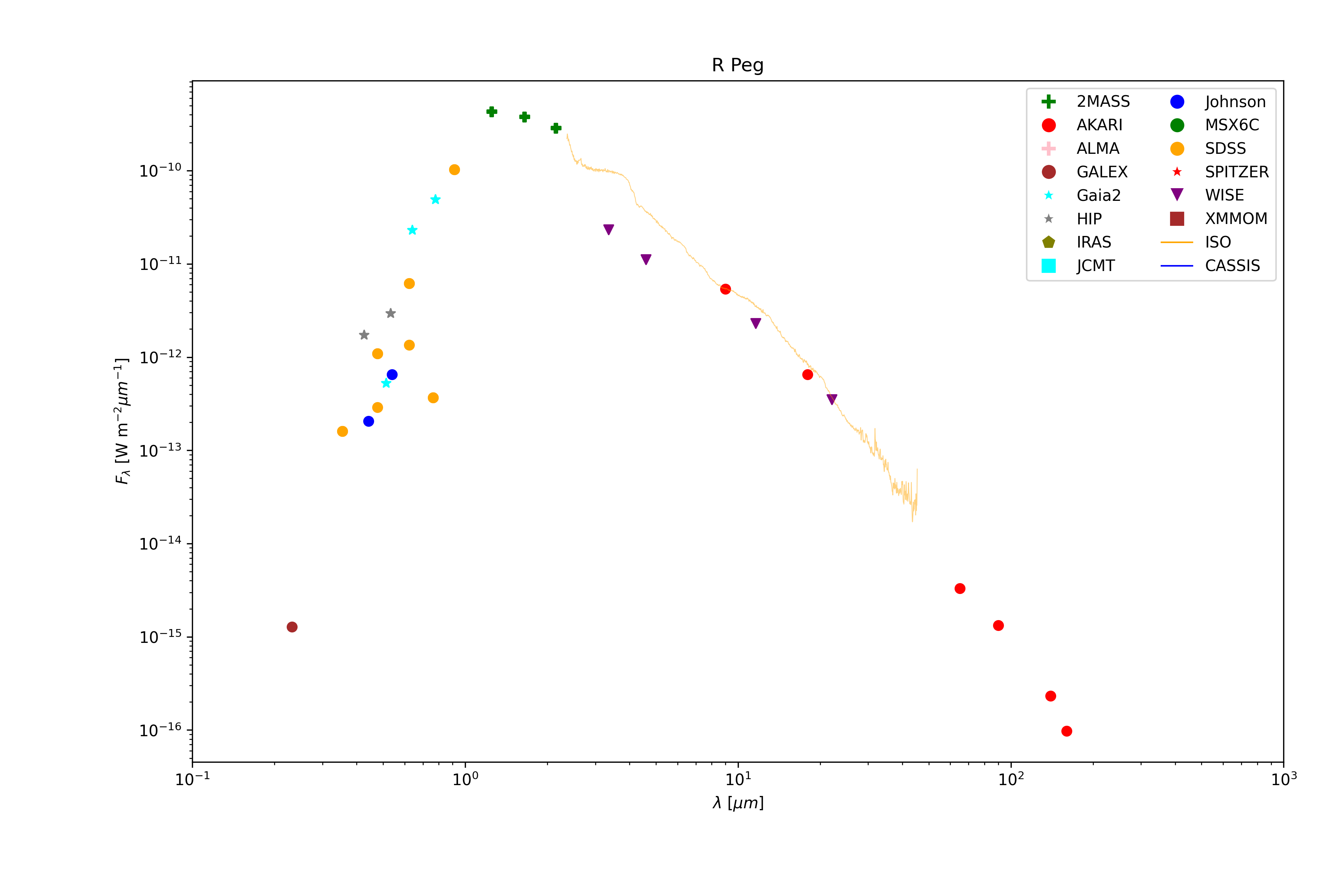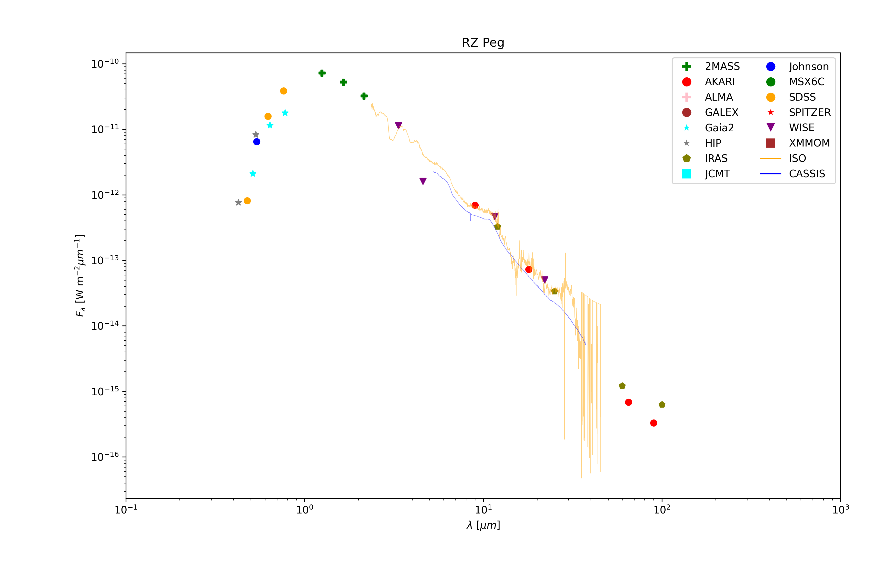 | RZ Peg | Mira, SC5-9/9-e | 22:05:52.97 | 33:30:24.8 | 4.07 | 1.25e-10 | 8470 | 1473.7 | 0.13 | PPic | + SPic | N/A | Phot Sed | JSON | Archive |