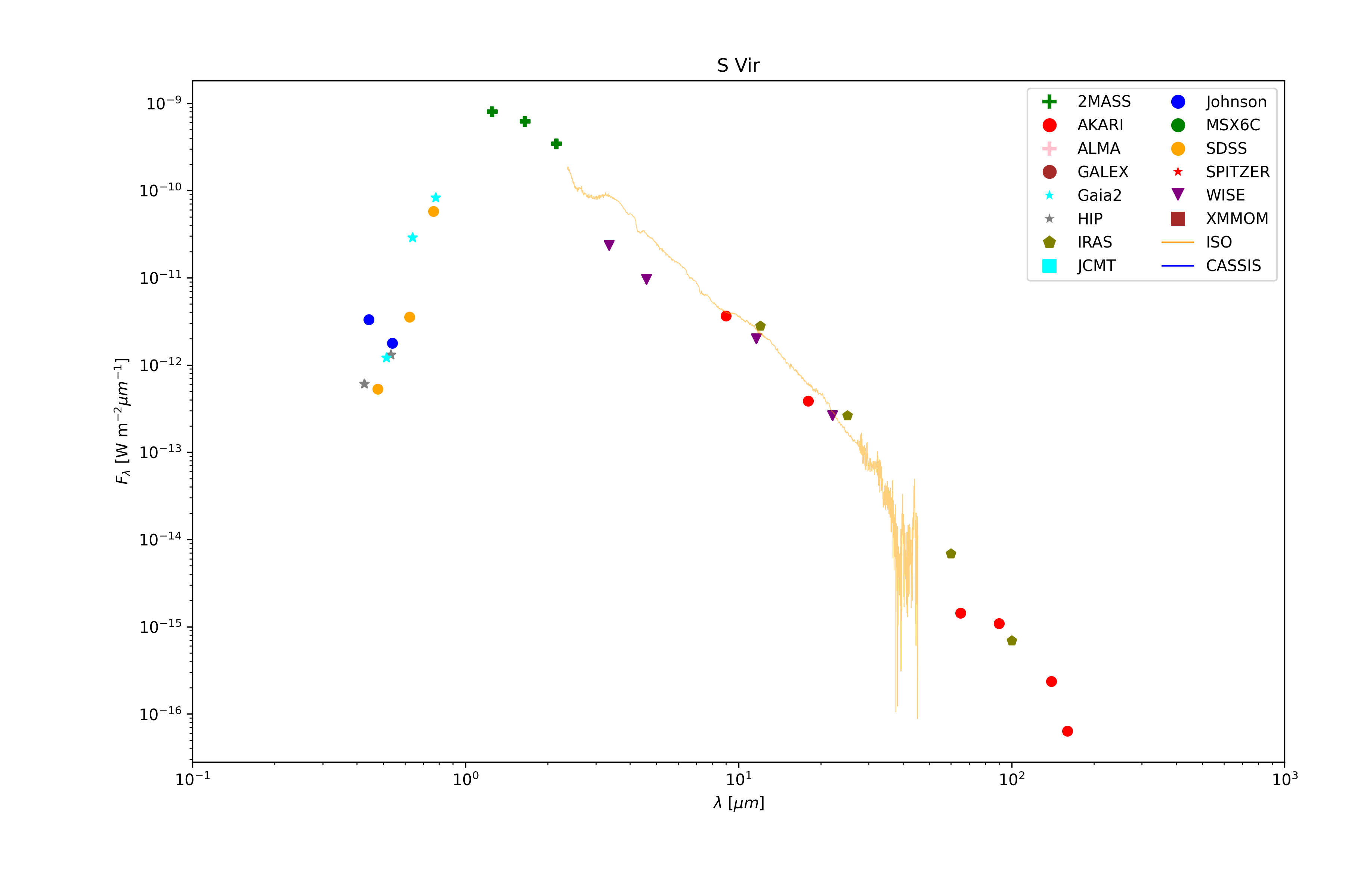 | S Vir | Mira, M6-7e | 13:33:00.11 | -07:11:41.0 | 1.454 | 9.78e-10 | 6195 | 451.2 | 0.00 | PPic | + SPic | N/A | Phot Sed | JSON | Archive |