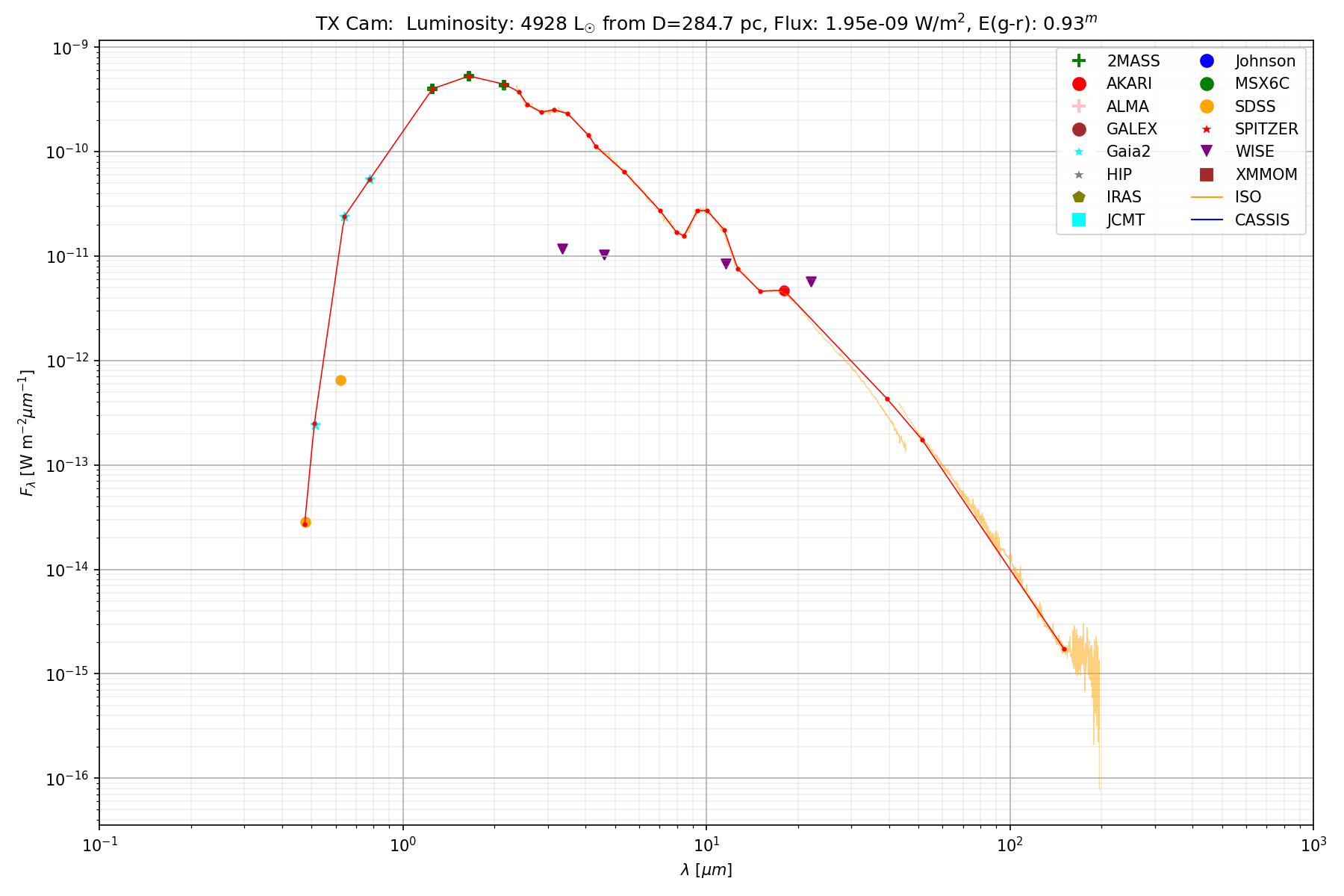 | TX Cam | Mira, M9-9.5 | 05:00:51.16 | 56:10:54.0 | 2.21 | 1.95e-09 | 4928 | 284.7 | 0.93 | PPic | + SPic | N/A | Phot Sed | JSON | Archive |