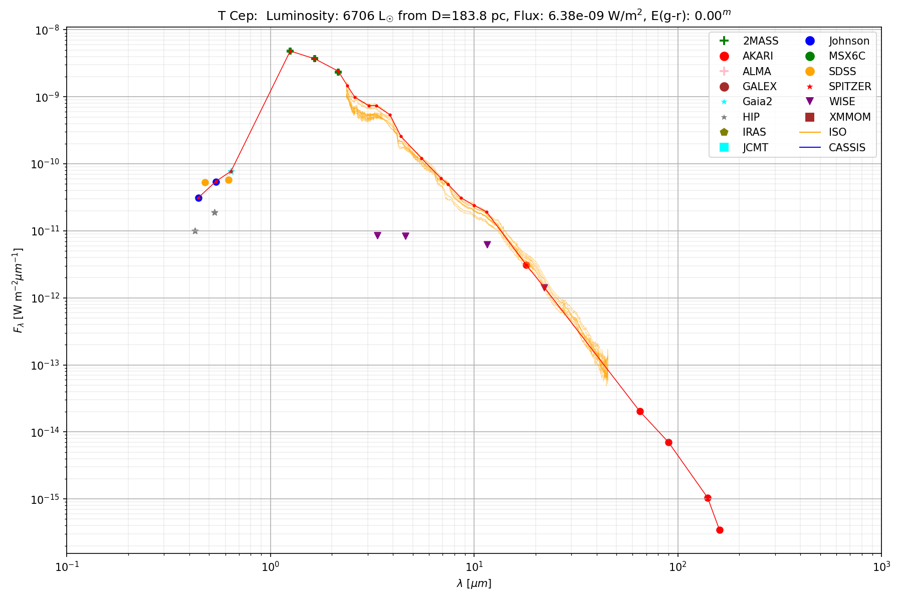 | T Cep | Mira, M6-9e | 21:09:31.78 | 68:29:27.2 | -0.496 | 6.38e-09 | 6706 | 183.8 | 0.00 | PPic | + SPic | N/A | Phot Sed | JSON | Archive |