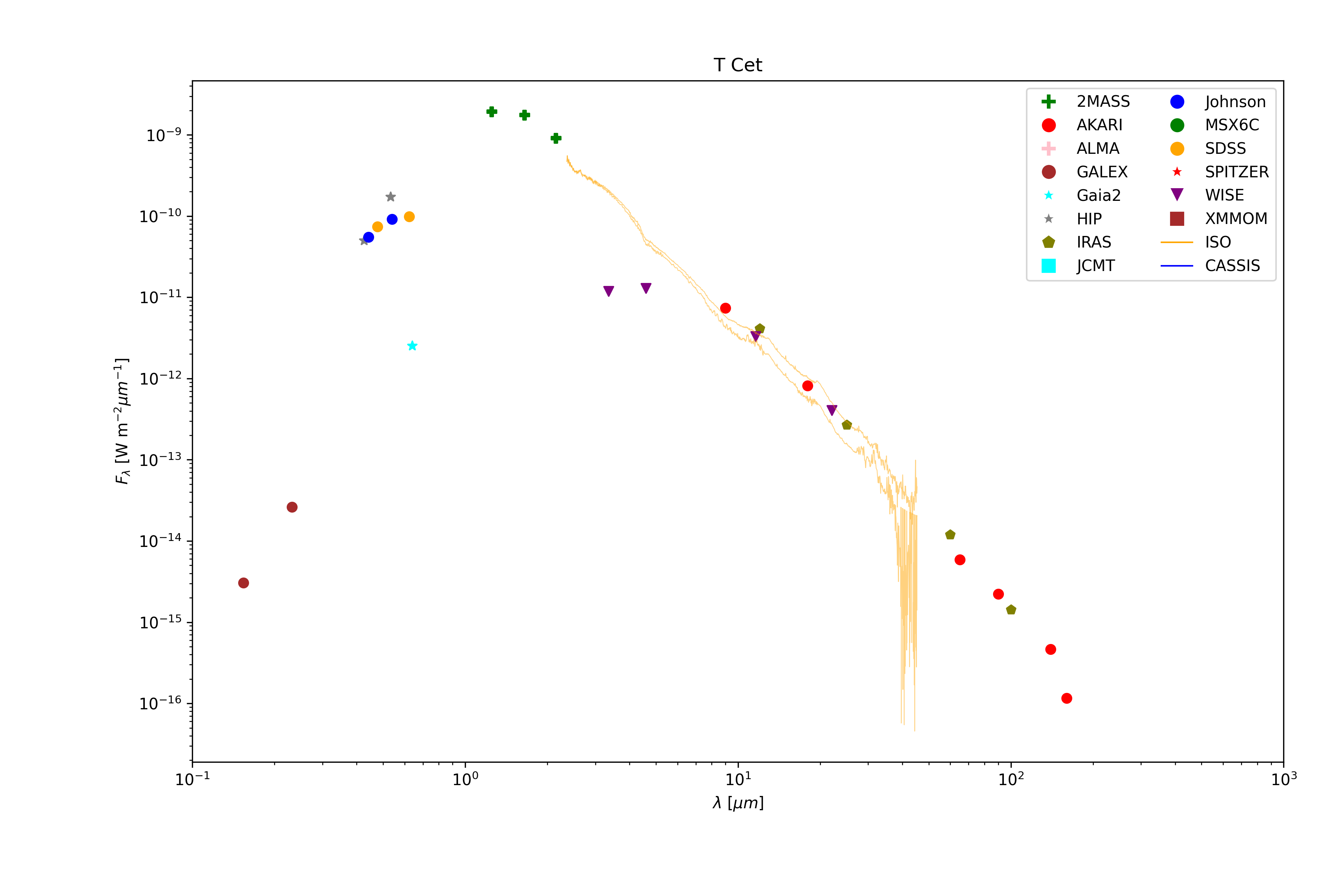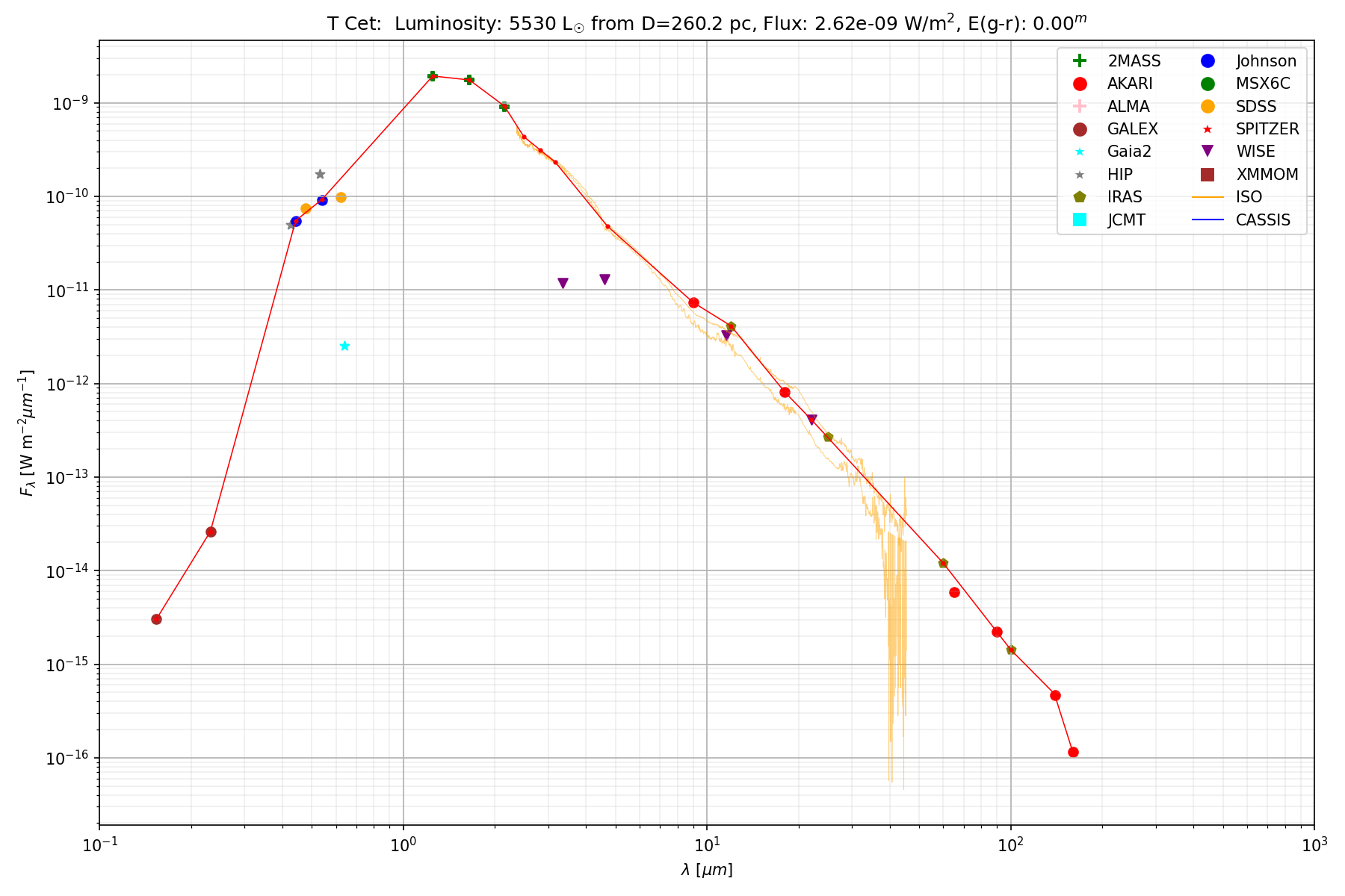 | T Cet | S Star, M5-6Se | 00:21:46.27 | -20:03:28.9 | 0.496 | 2.62e-09 | 5530 | 260.2 | 0.00 | PPic | + SPic | N/A | Phot Sed | JSON | Archive |