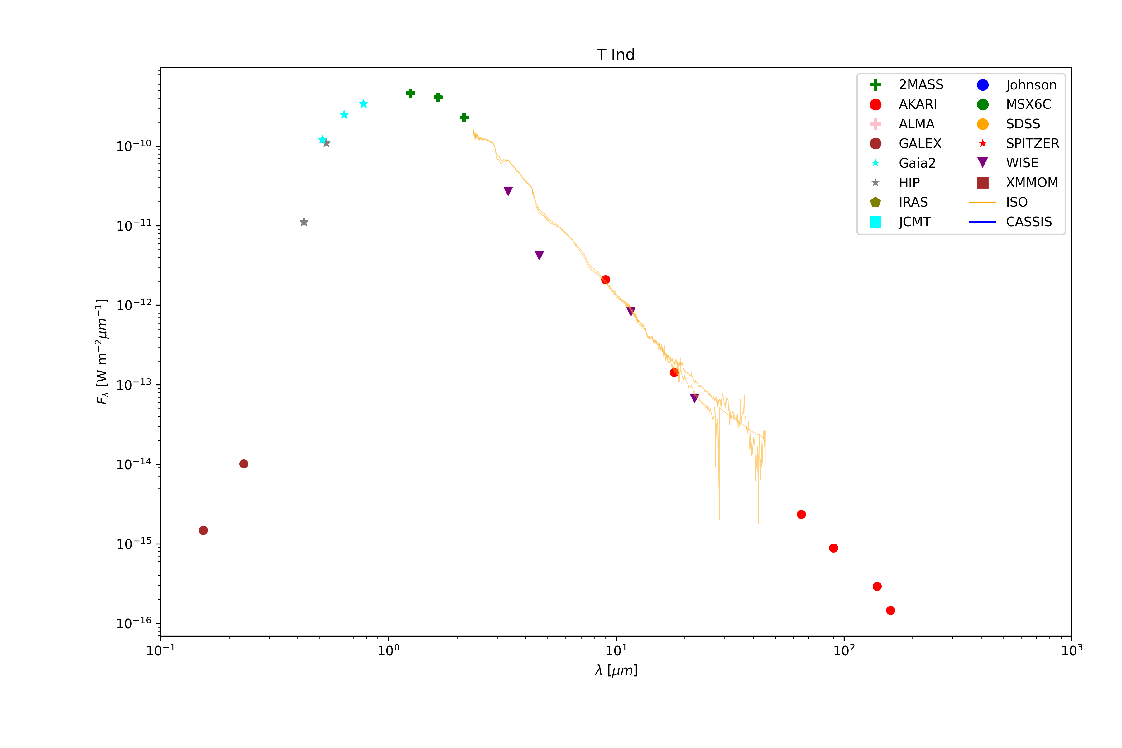 | T Ind | Carbon Star, C7,2 | 21:20:09.48 | -45:01:18.8 | 2.05 | 8.09e-10 | 9424 | 611.7 | nan | PPic | + SPic | N/A | Phot Sed | JSON | Archive |