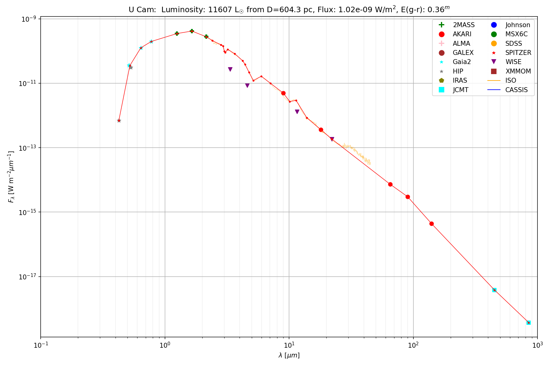 | U Cam | Carbon Star, C-N5 | 03:41:48.18 | 62:38:54.4 | 2.36 | 1.02e-09 | 11607 | 604.3 | 0.36 | PPic | + SPic | N/A | Phot Sed | JSON | Archive |