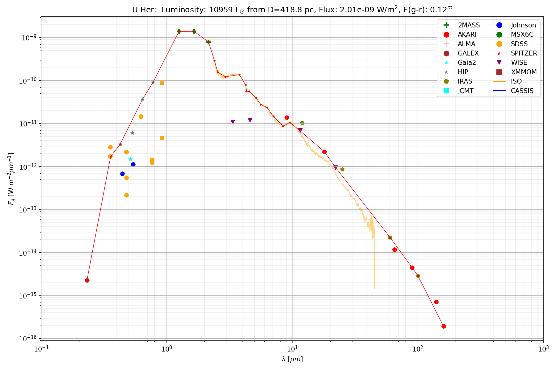 | U Her | OH/IR Star, M6.5-8+e | 16:25:47.47 | 18:53:32.9 | 0.858 | 2.01e-09 | 10959 | 418.8 | 0.12 | PPic | + SPic | N/A | Phot Sed | JSON | Archive |