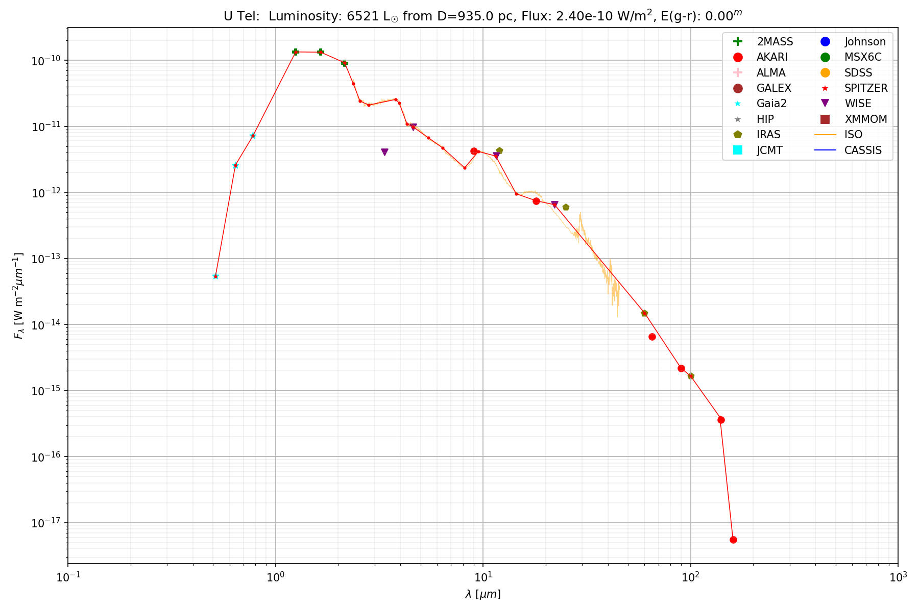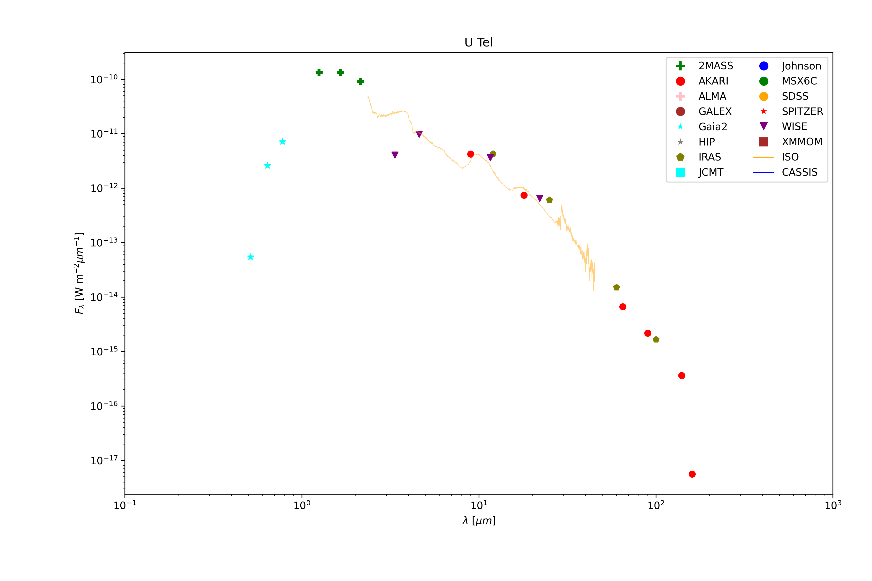 | U Tel | Mira, M7e | 19:08:02.26 | -48:54:12.1 | 3.397 | 2.40e-10 | 6521 | 935.0 | nan | PPic | + SPic | N/A | Phot Sed | JSON | Archive |