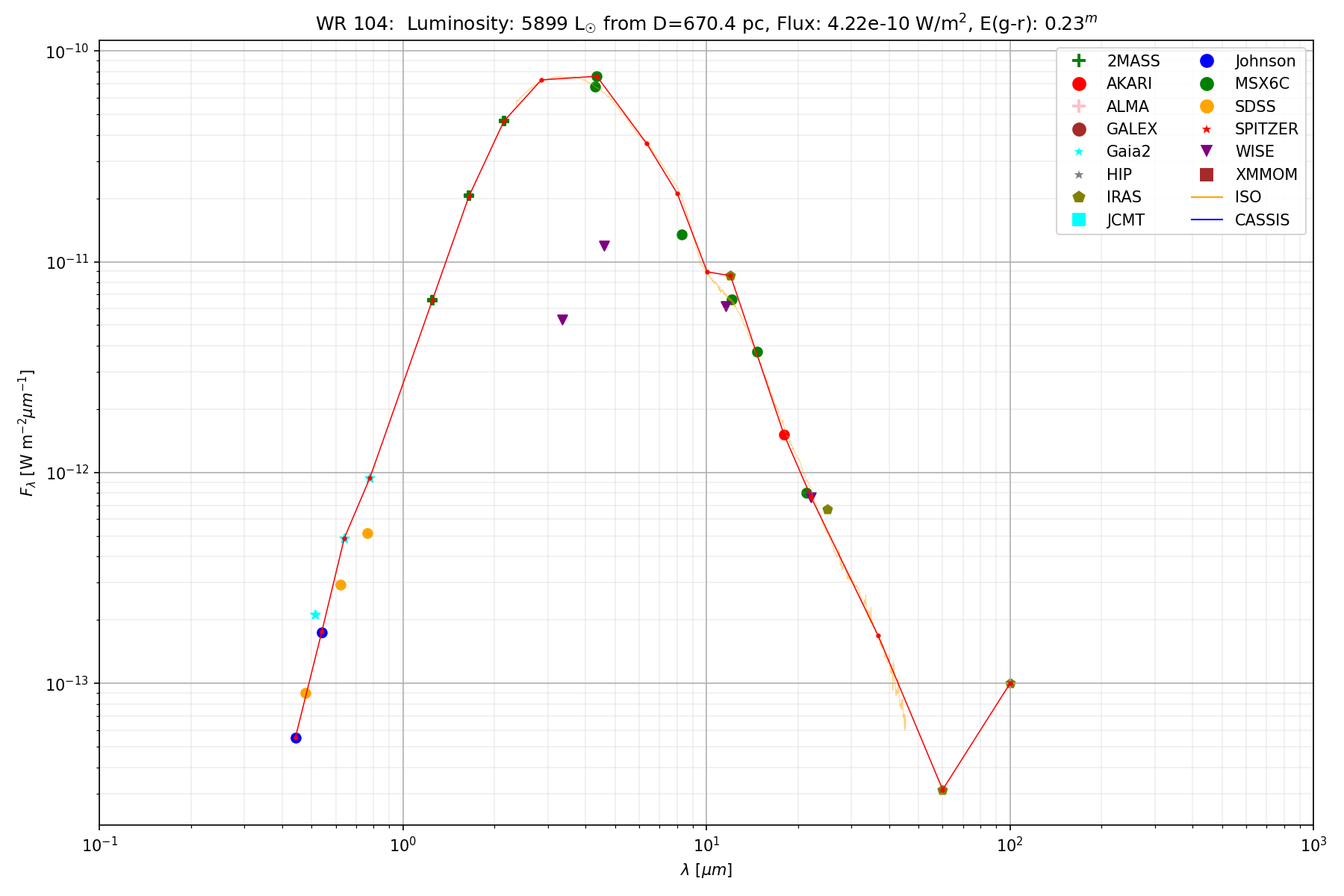 | WR 104 | AGB, ? | 18:02:04.12 | -23:37:42.2 | 6.666 | 4.22e-10 | 5899 | 670.4 | 0.23 | PPic | + SPic | N/A | Phot Sed | JSON | Archive |