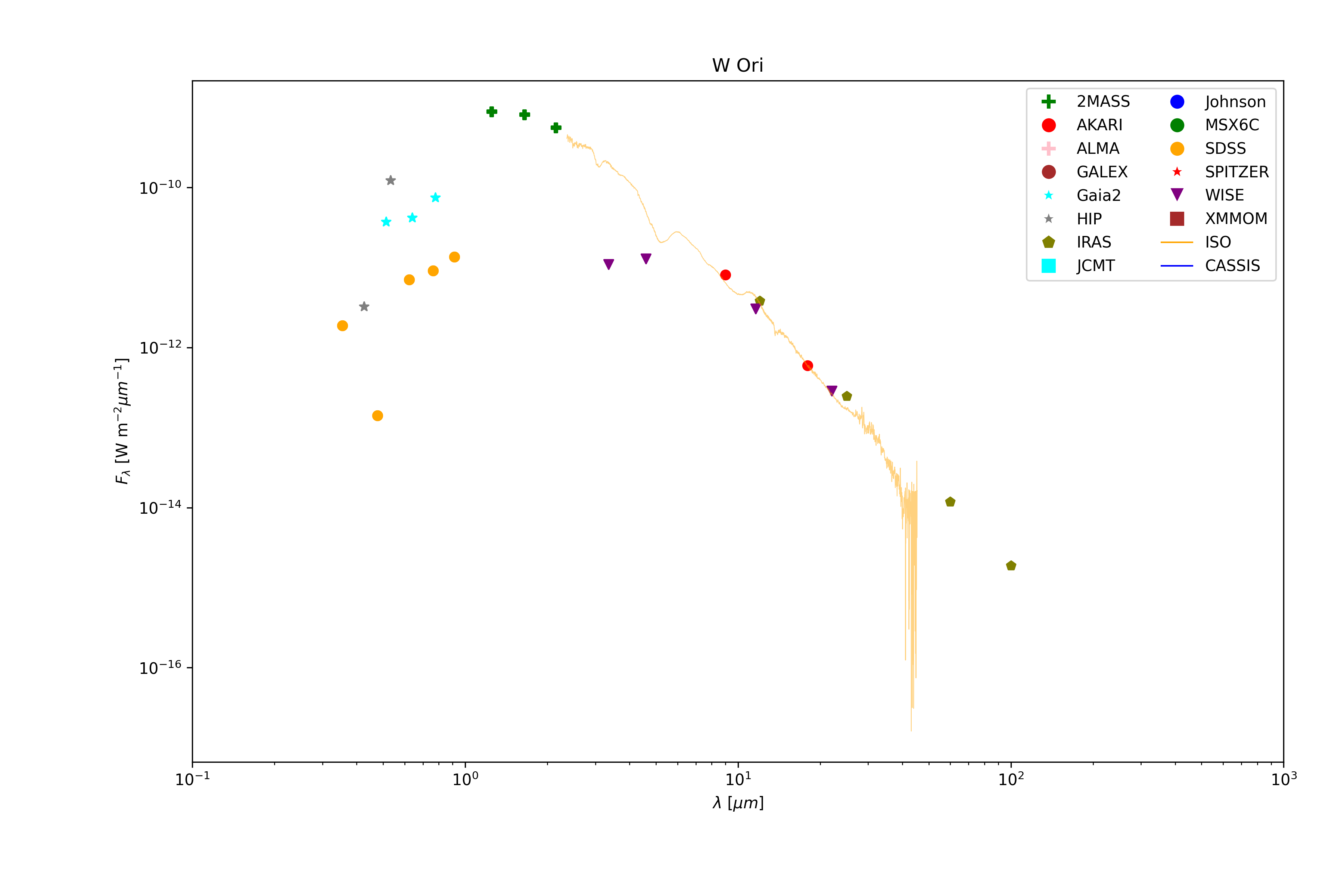 | W Ori | Carbon Star, C-N5 | 05:05:23.72 | 01:10:39.5 | 1.34 | 1.60e-09 | 11937 | 489.7 | 0.09 | PPic | + SPic | N/A | Phot Sed | JSON | Archive |