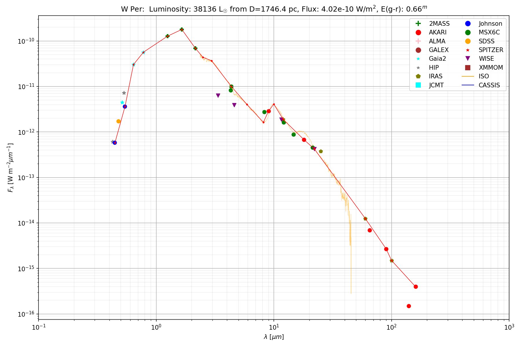 | W Per | Red Supergiant, M3Iab-M5I | 02:50:37.89 | 56:59:00.3 | 3.45 | 4.02e-10 | 38136 | 1746.4 | 0.66 | PPic | + SPic | N/A | Phot Sed | JSON | Archive |