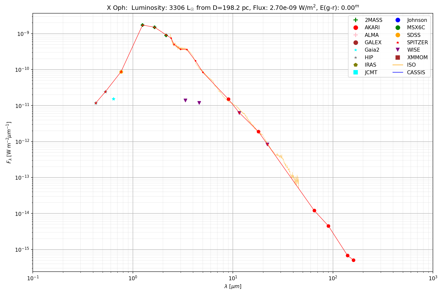 | X Oph | Mira, M0-8e+K2:III | 18:38:21.13 | 08:50:02.8 | 0.62 | 2.70e-09 | 3306 | 198.2 | 0.00 | PPic | + SPic | N/A | Phot Sed | JSON | Archive |