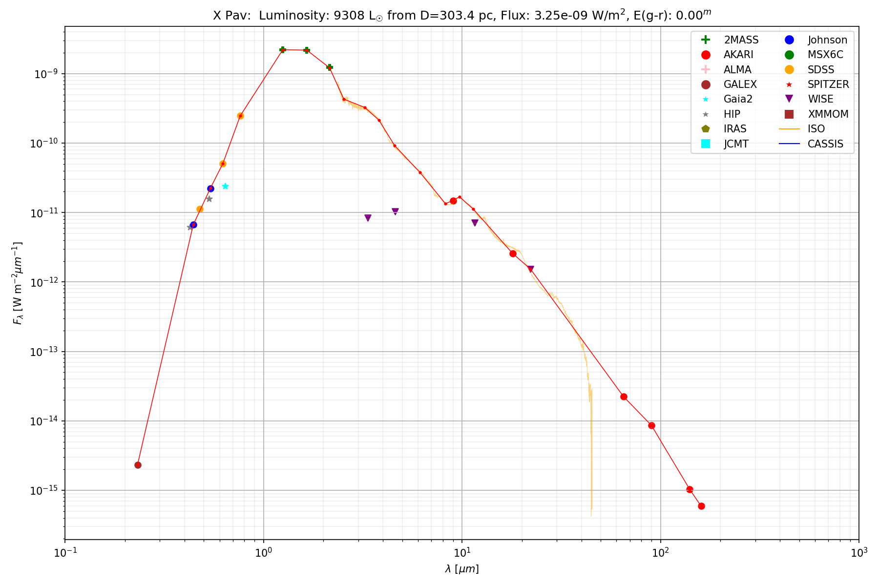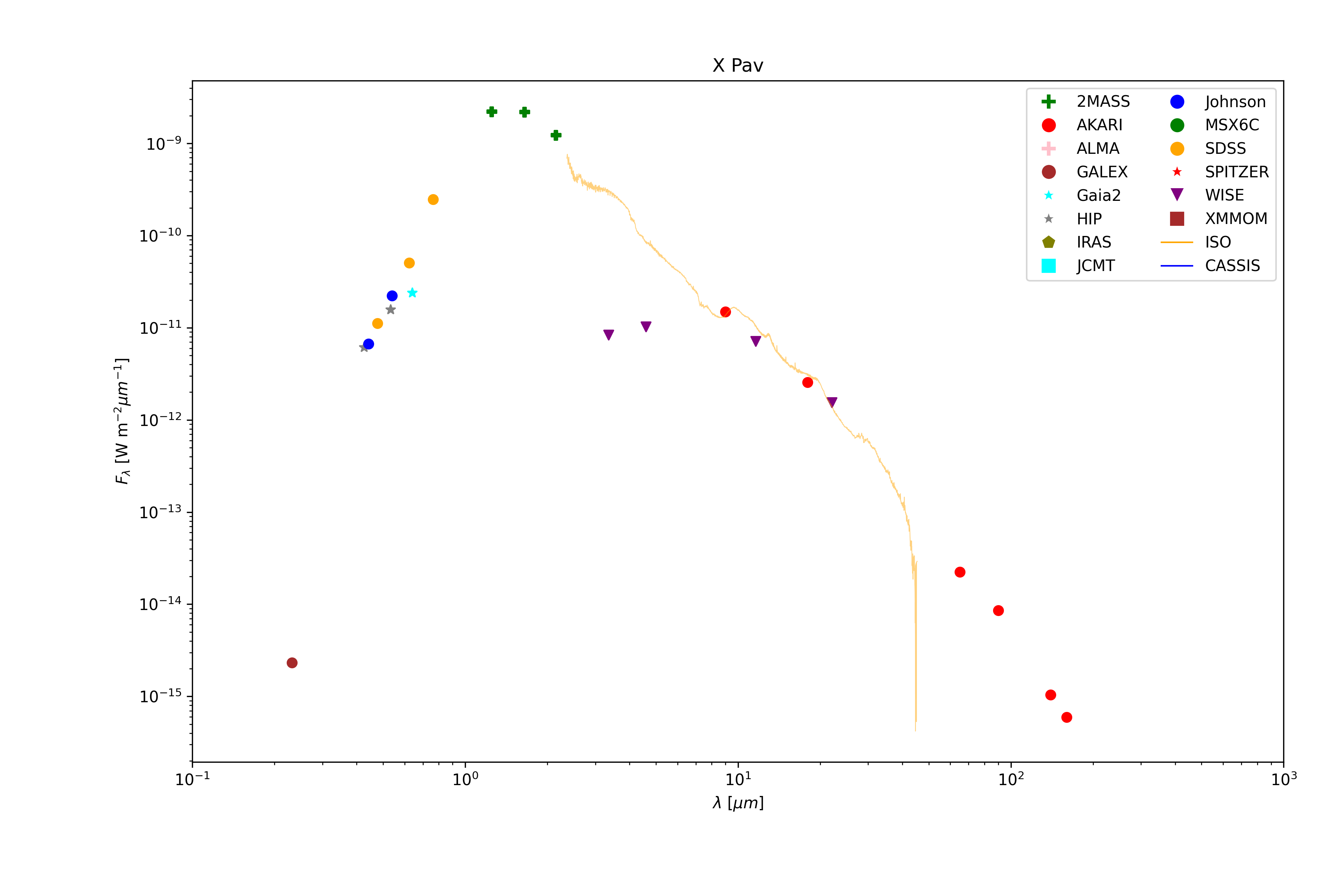 | X Pav | AGB, M8III | 20:11:45.86 | -59:56:12.8 | 0.35 | 3.25e-09 | 9308 | 303.4 | nan | PPic | + SPic | N/A | Phot Sed | JSON | Archive |