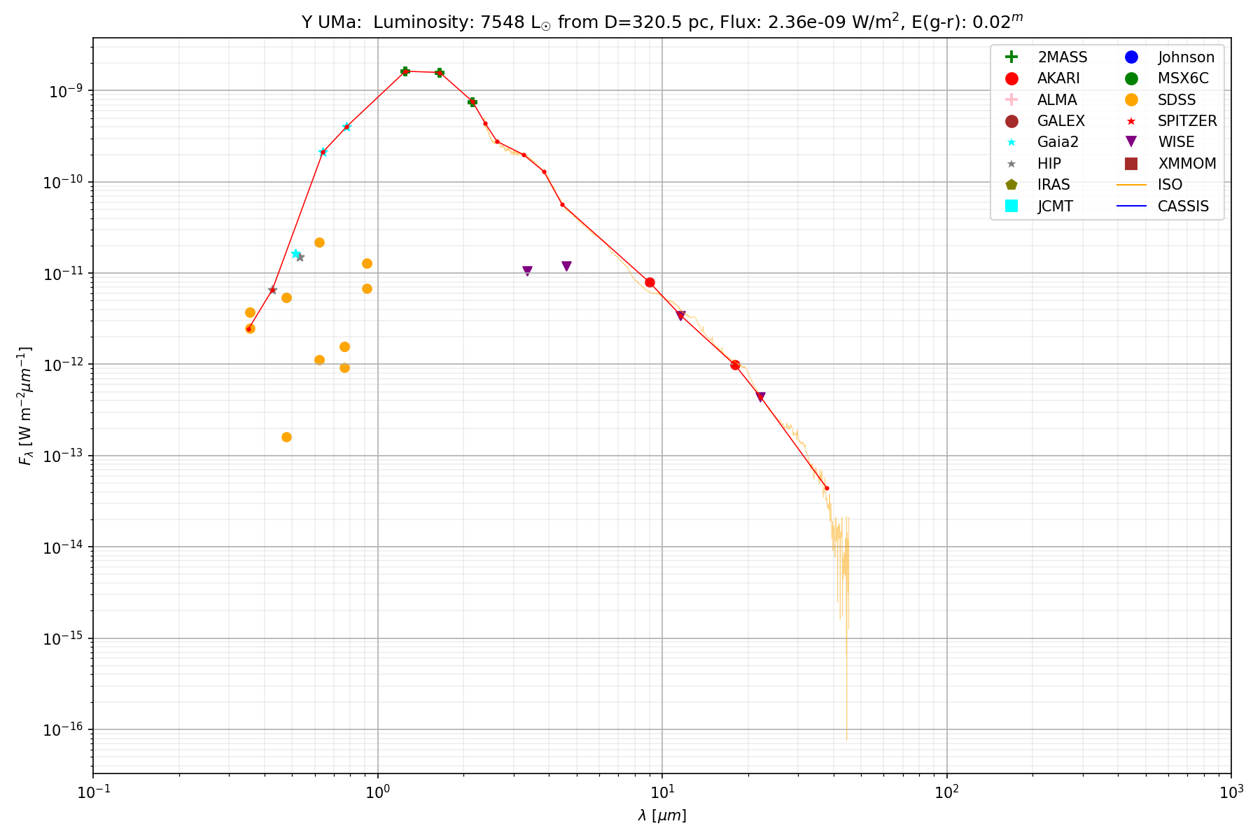 | Y UMa | AGB, M7II-III: | 12:40:21.28 | 55:50:47.6 | 0.683 | 2.36e-09 | 7548 | 320.5 | 0.02 | PPic | + SPic | N/A | Phot Sed | JSON | Archive |